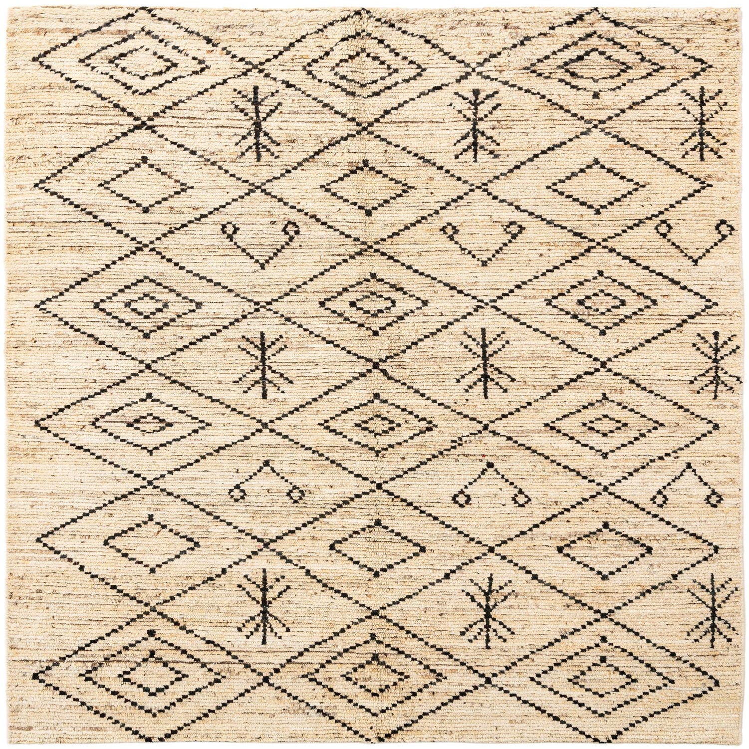 A 5x8 rectangular Beni Marok rug with a natural tan and cream background and a black geometric diamond pattern, suitable for an entryway or living room.