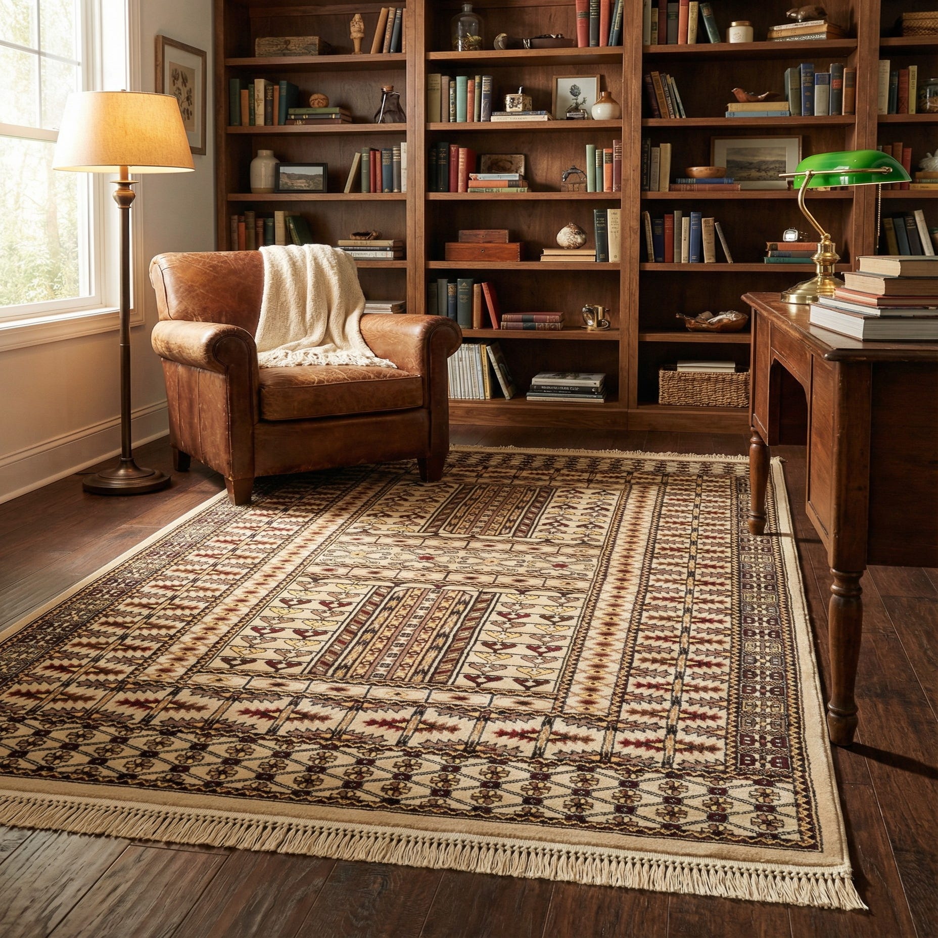 A 5x8 rectangular Bokhara rug in shades of brown, tan, and cream, featuring intricate traditional patterns and fringe.