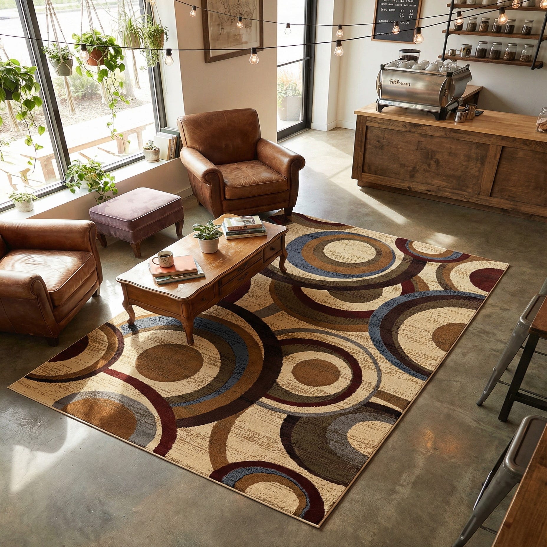 A bold arrangement of overlapping concentric circles plays across a warm beige field, creating a modern-geometric look with a mid-century influence. Rings in black, blue, brown, burgundy, gray and olive layer against a subtly striated background, giving the pattern movement and visual depth. The machine-made construction in 100% polypropylene yields a dense, soft pile that feels cushioned underfoot while maintaining a tailored, low-profile appearance.