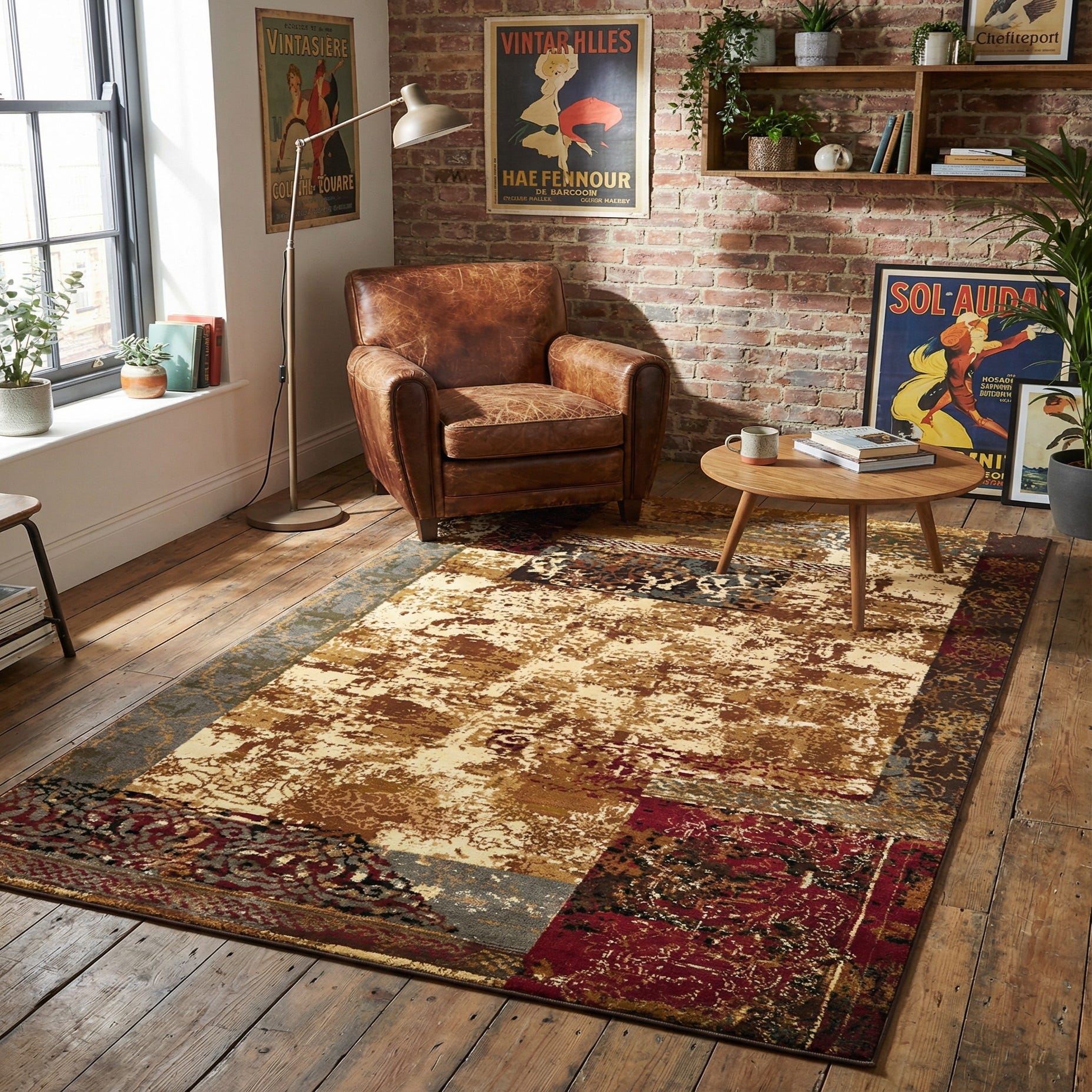 This rug works well in transitional, eclectic, or modern farmhouse interiors. It can anchor a living room seating area beneath a coffee table, add warmth and visual interest to an entry or home office, or sit under a small dining table to tie together warm wood tones and leather seating. Pair it with navy or olive throw pillows, brass or matte-black accents, and natural textiles to complement the rug’s mix of warm and cool hues.