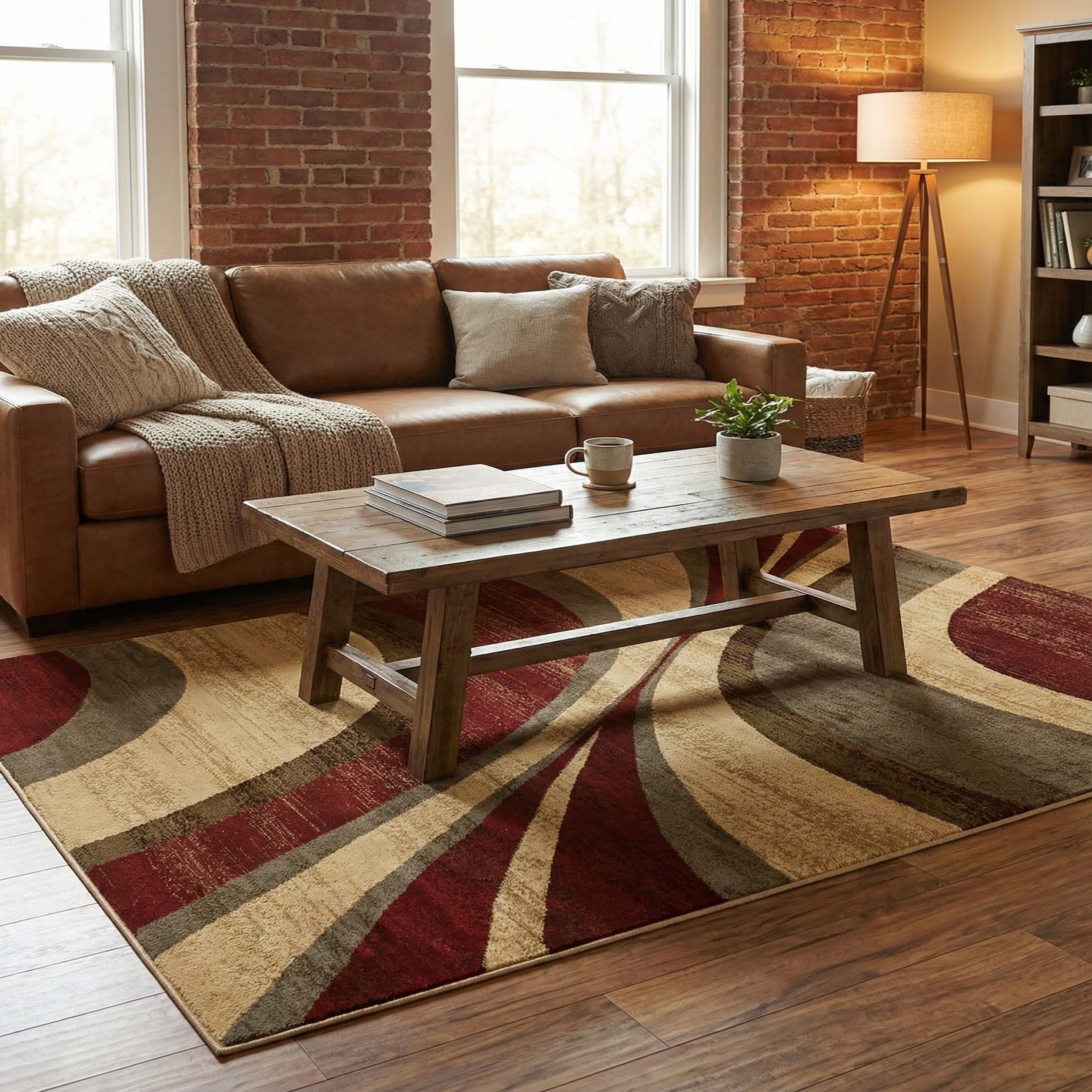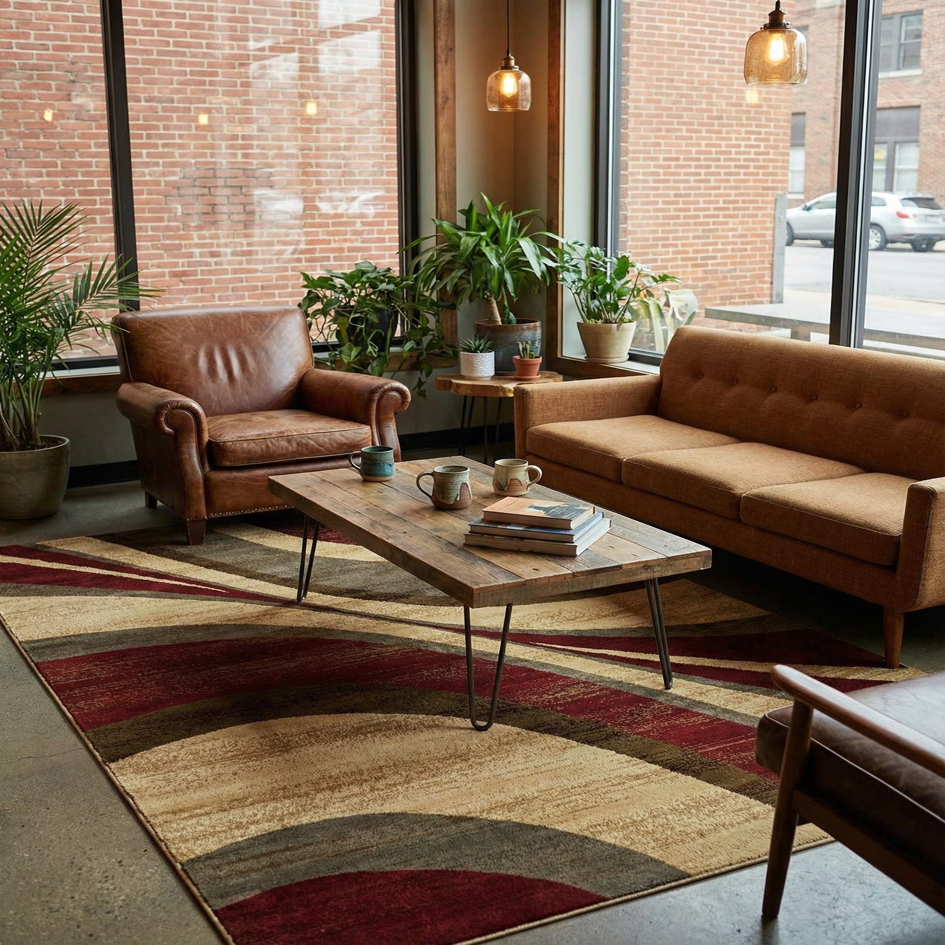 This piece works well in a living room beneath a coffee table, as an anchor in a home office, or layered in a den to bring warmth and movement to the floor. It pairs naturally with warm wood furniture, leather seating, and neutral upholstery, and complements contemporary, transitional, and mid-century modern schemes where bold lines and rich color are desired. The polypropylene construction makes it a practical choice for moderate-traffic areas that benefit from easy maintenance and enduring color.