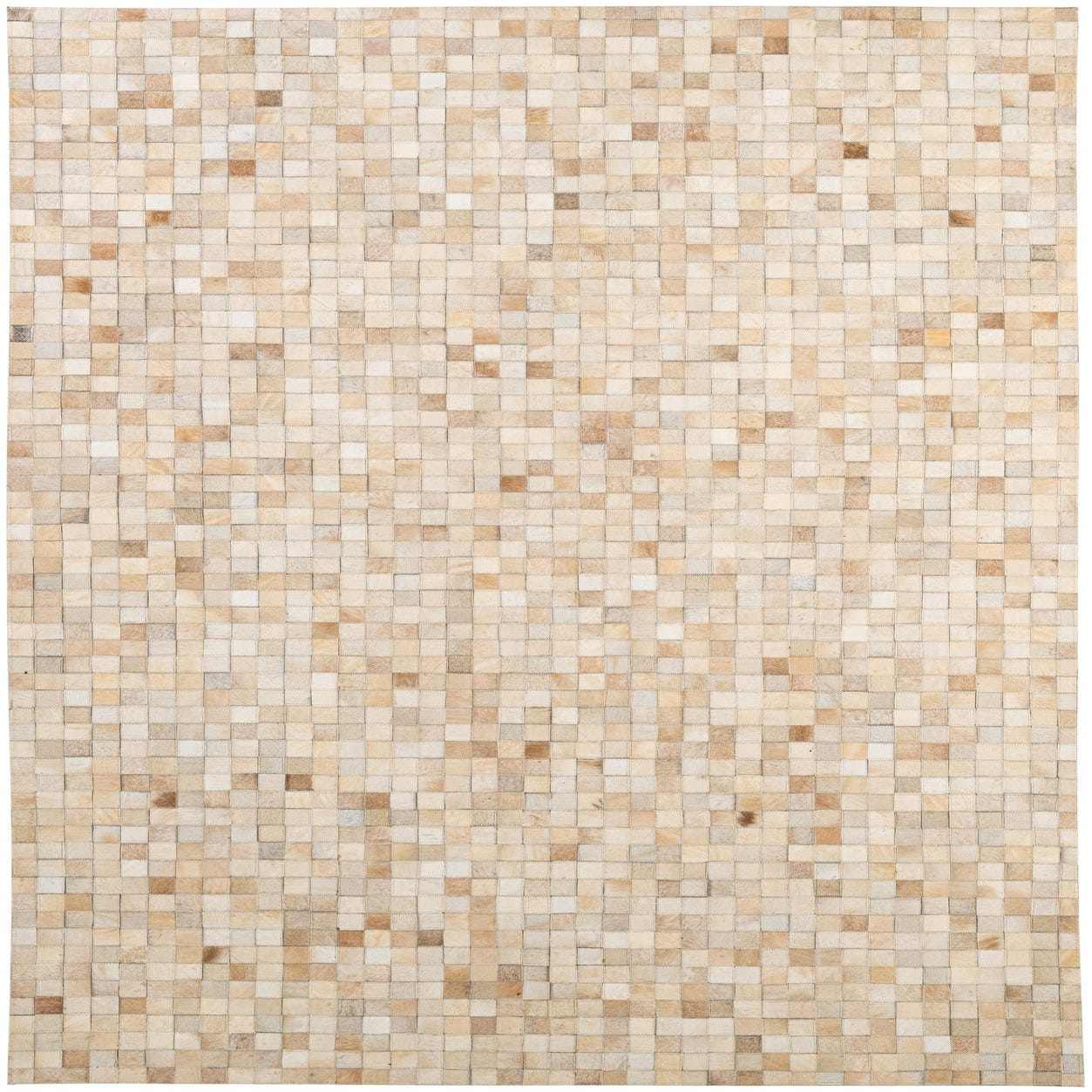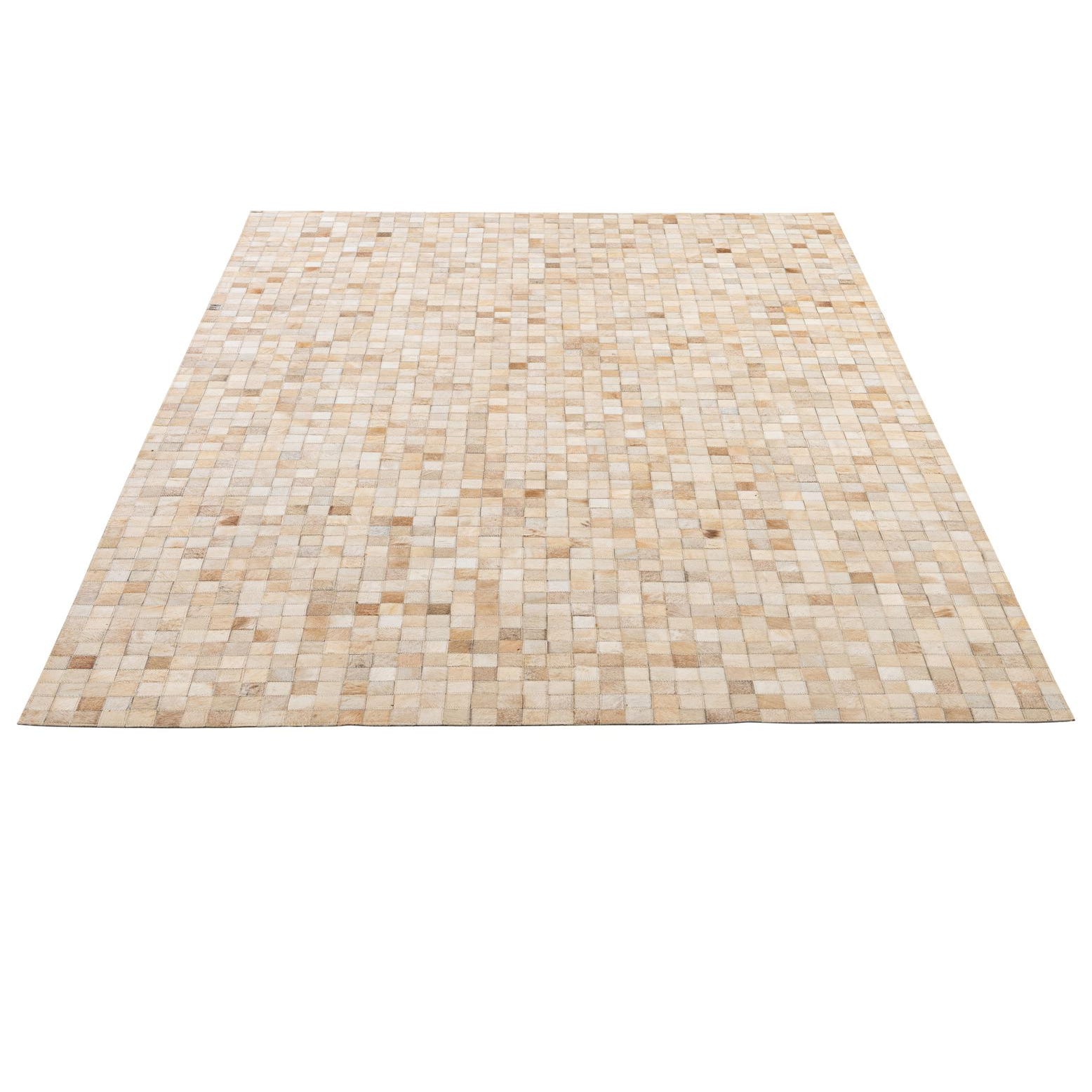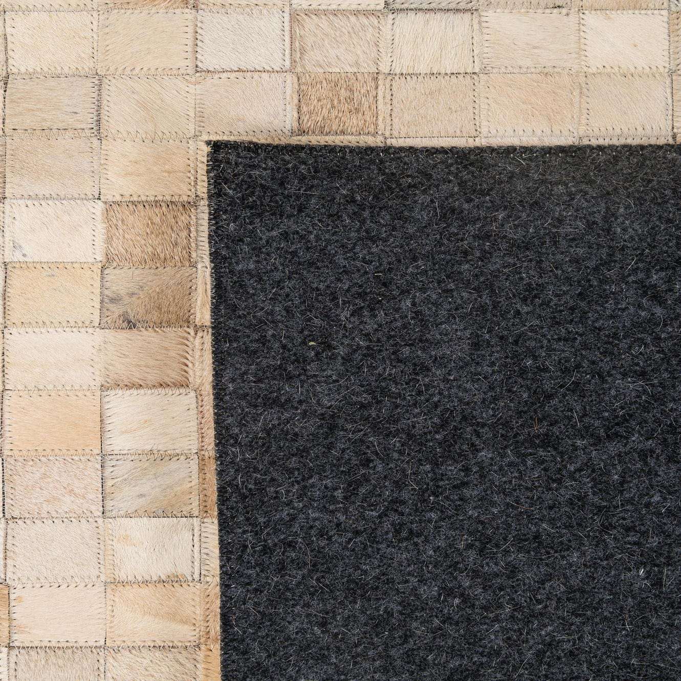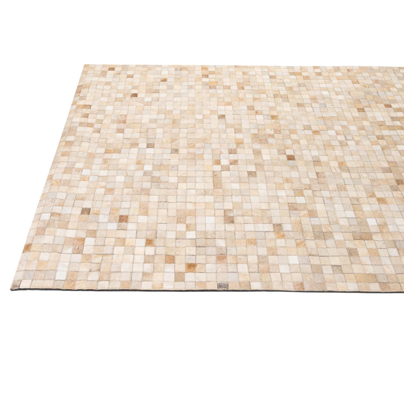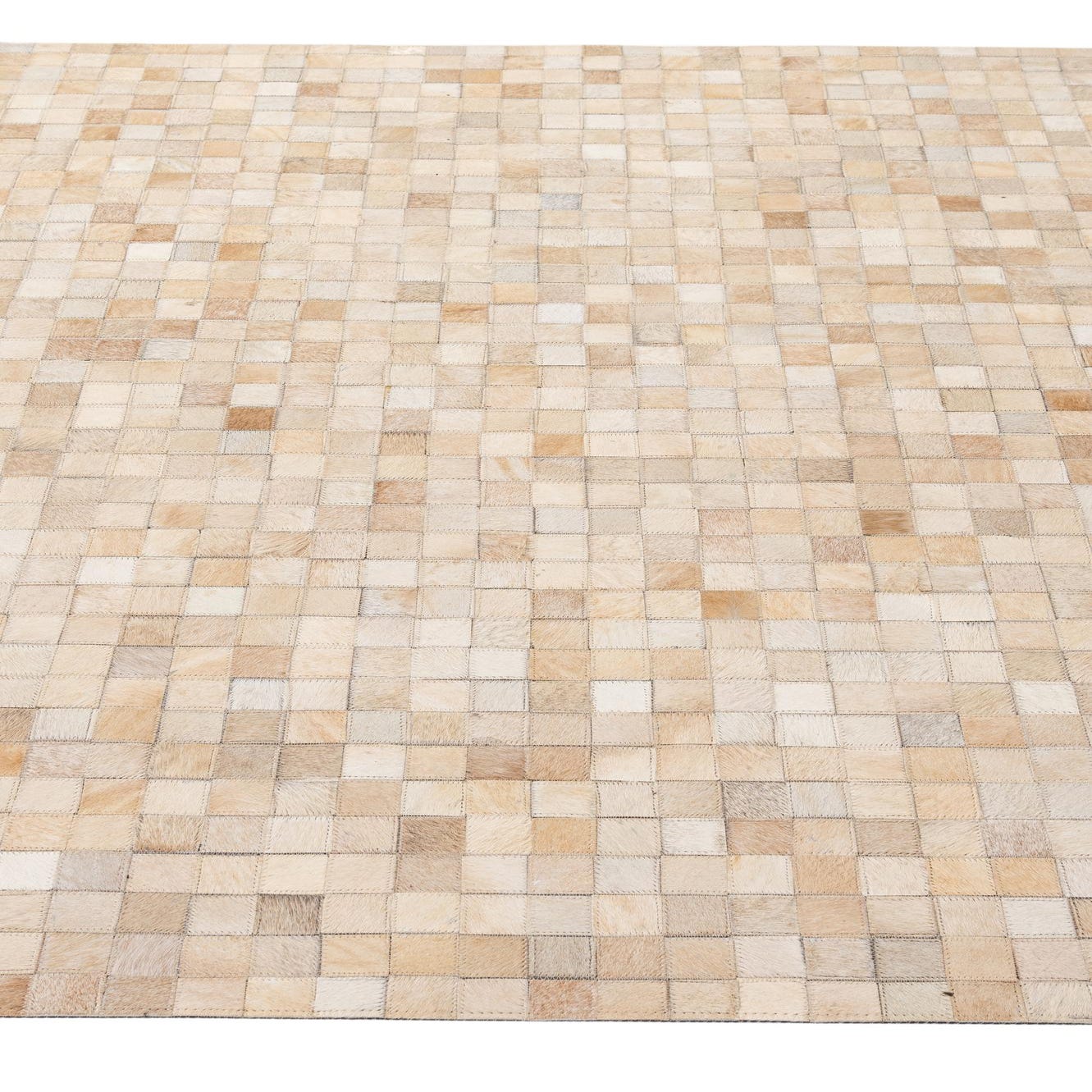 A 5x8 rectangular Cowhide & Leather rug featuring a modern patchwork pattern in shades of brown, tan, and ivory.