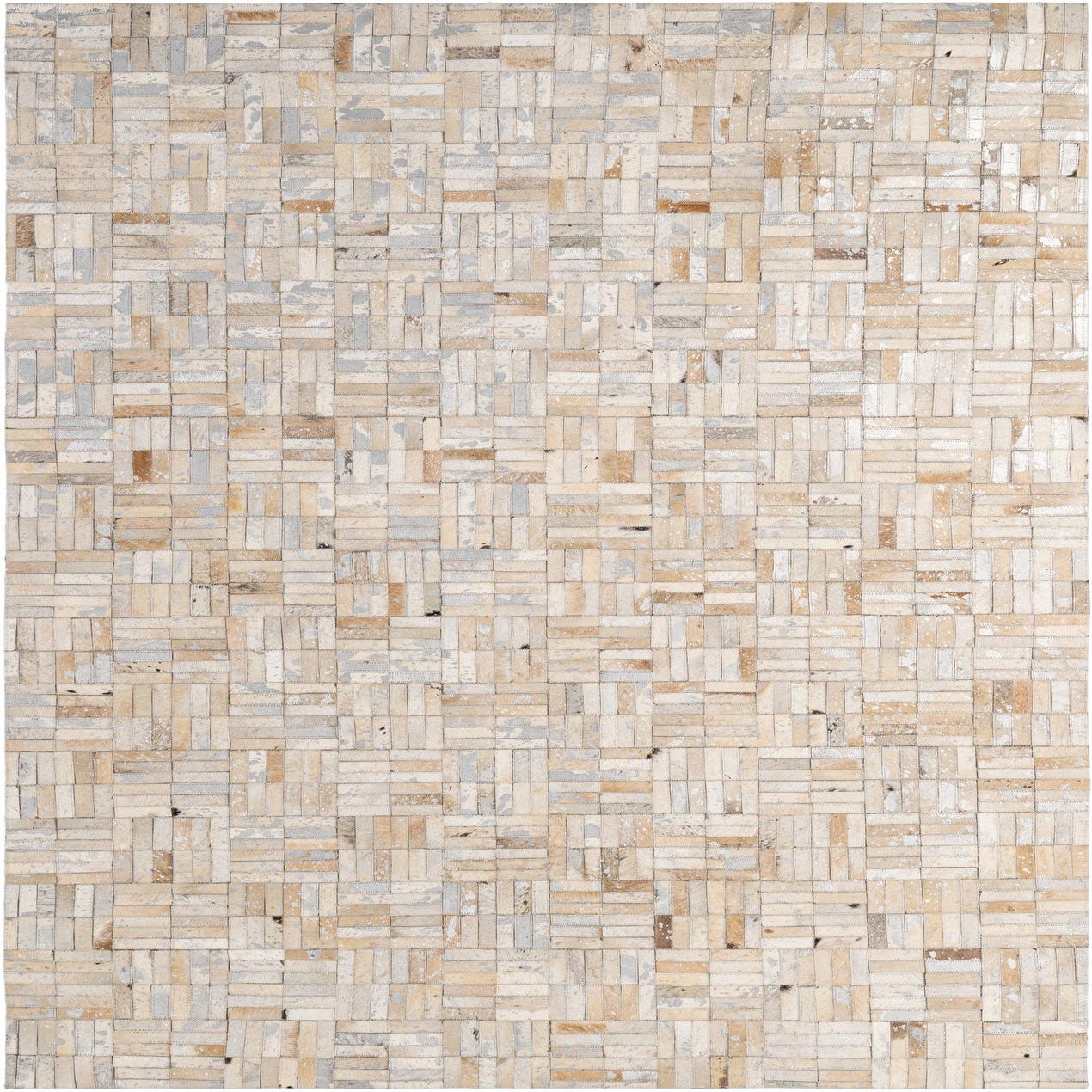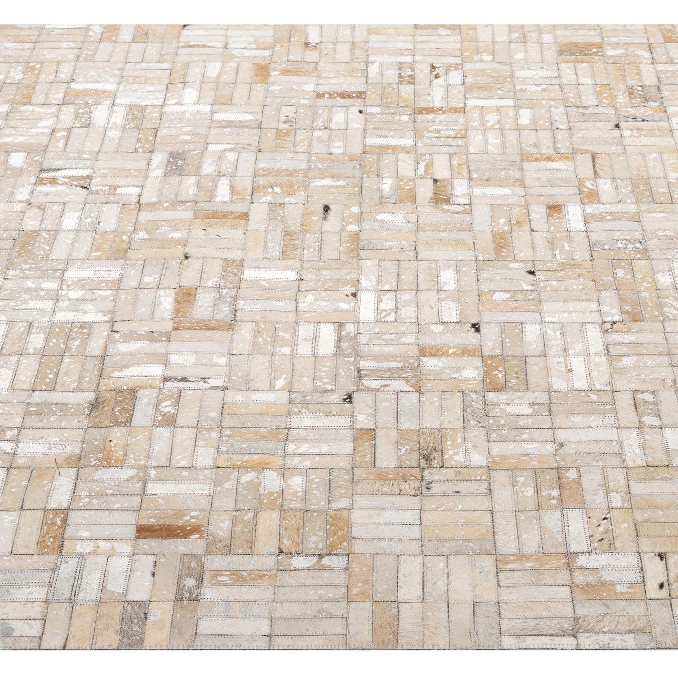Handmade from cowhide and leather, this patchwork rug arranges narrow rectangular strips into a refined, parquet-like grid. The beige background sets a calm base while ivory, tan, silver, and light brown patches create soft tonal movement across the surface. Visible stitching and the natural grain of each hide lend subtle texture—smooth, hair-on-hide panels with leather seams that add a low-profile, tactile quality underfoot.