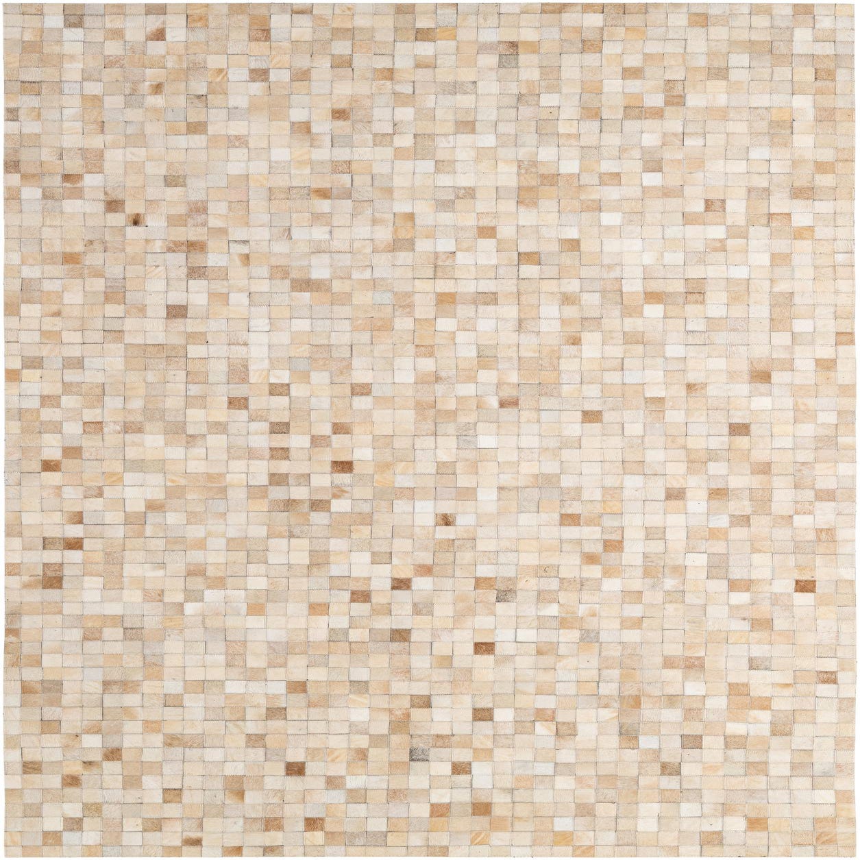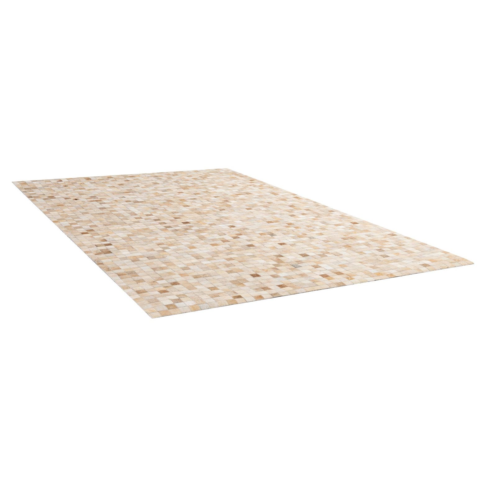 A rectangular 5x8 modern patchwork cowhide rug in shades of brown, tan, and ivory, perfect for a living room.