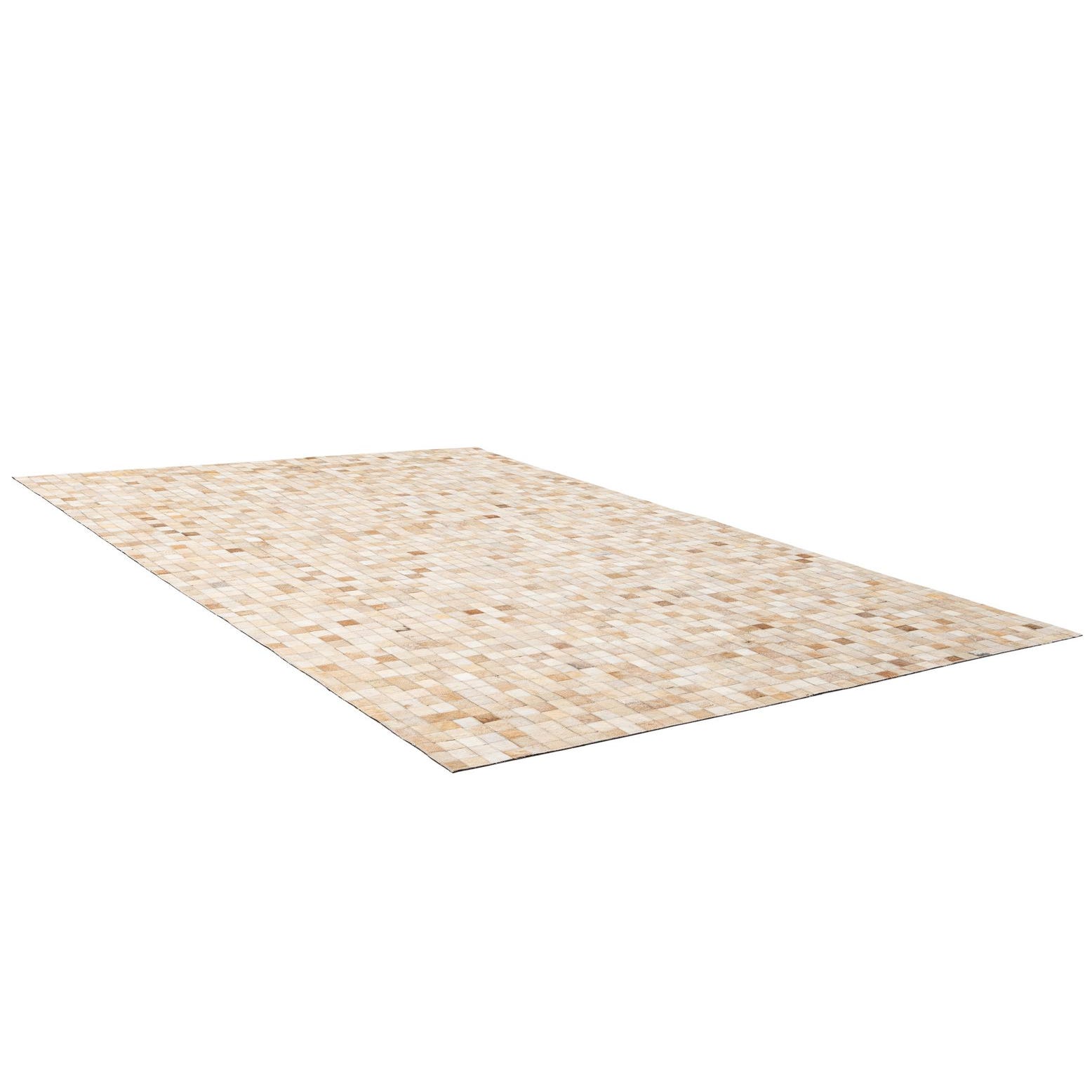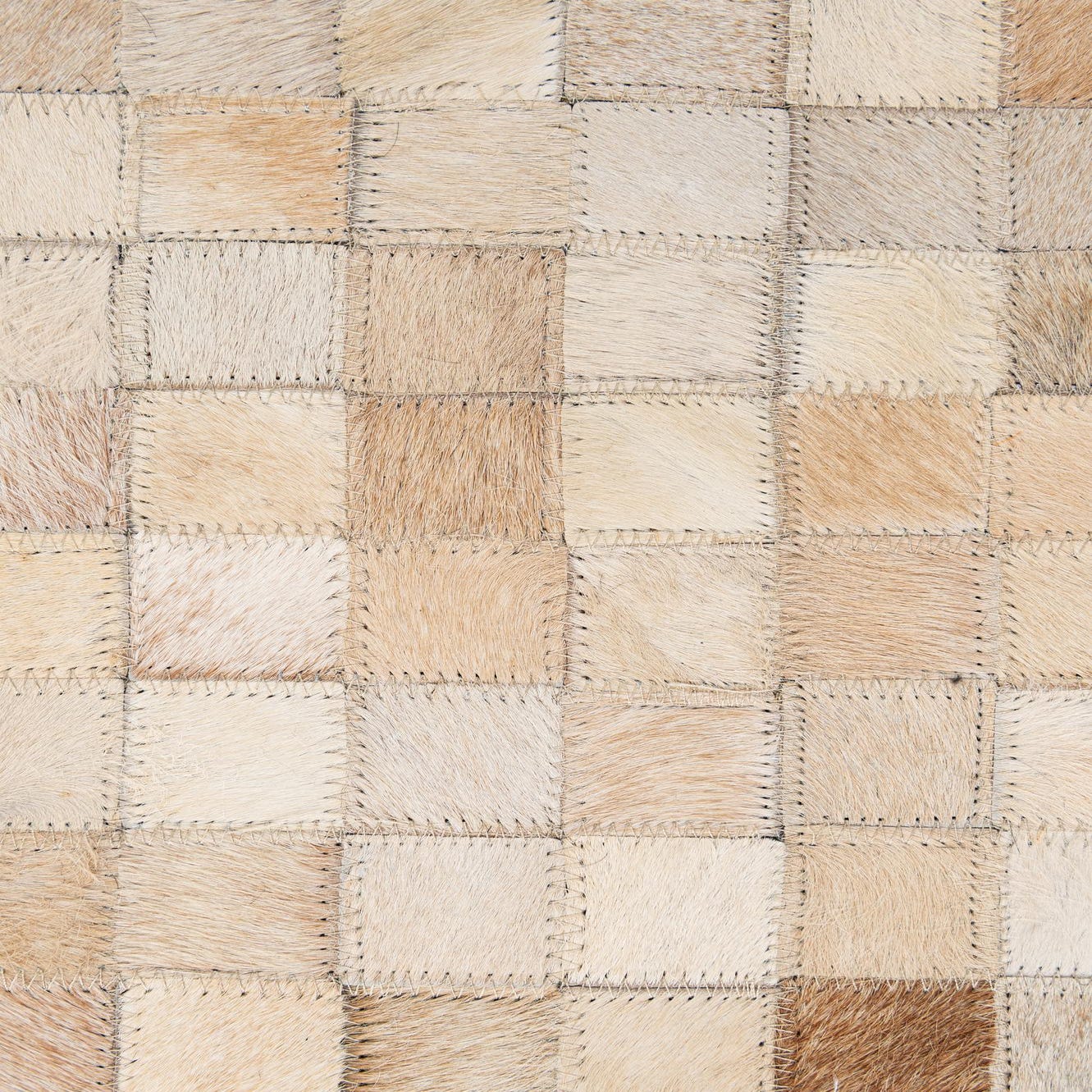 A 5x8 rectangular Cowhide Patchwork rug featuring a modern pattern of various brown, tan, and ivory squares.