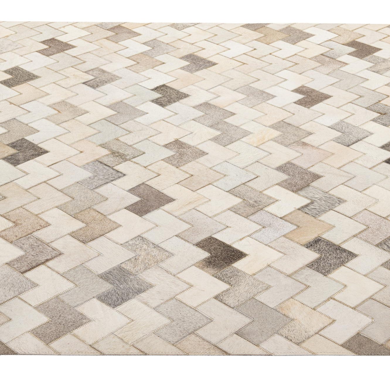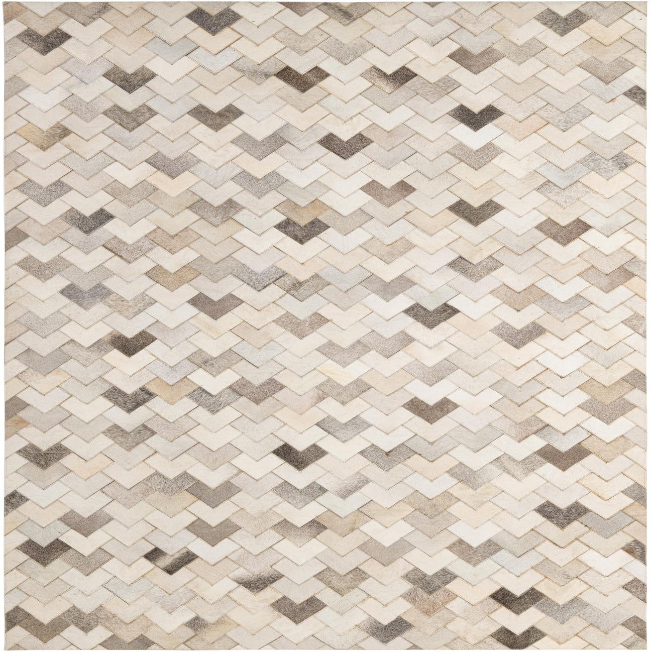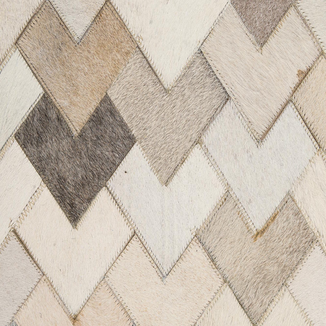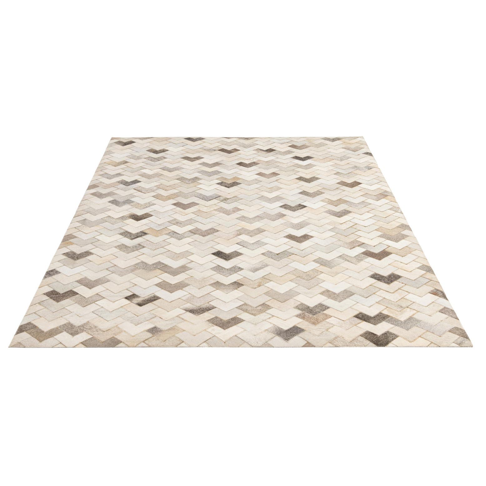 5x8 rectangular Cowhide - Patchwork rug featuring a modern chevron pattern in shades of brown, tan, ivory, and cream.