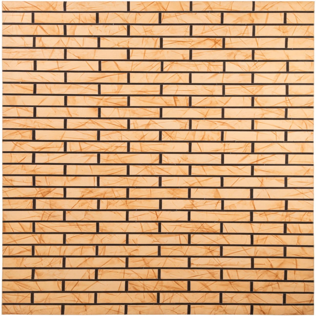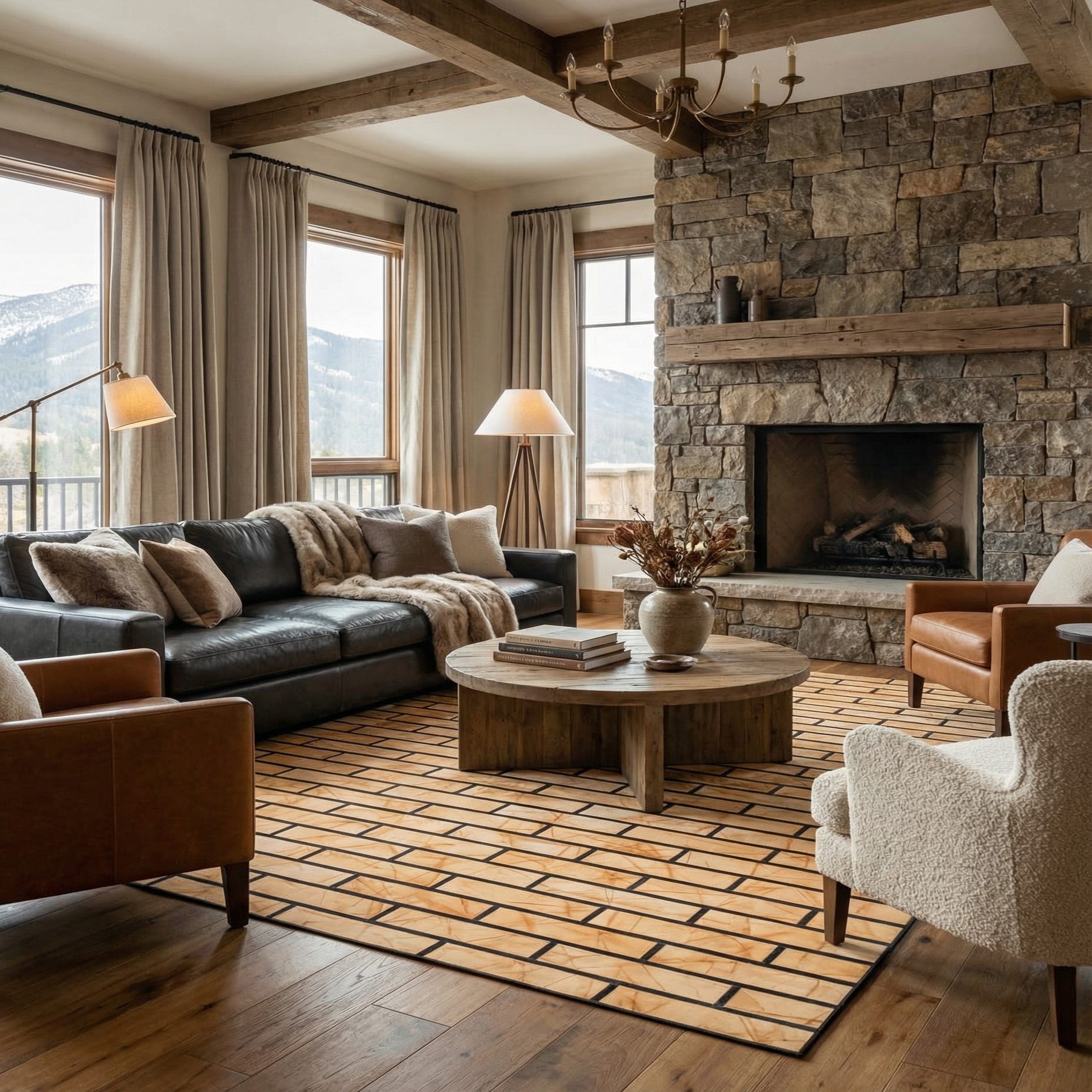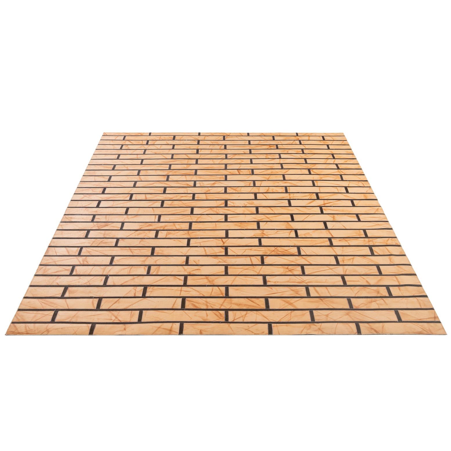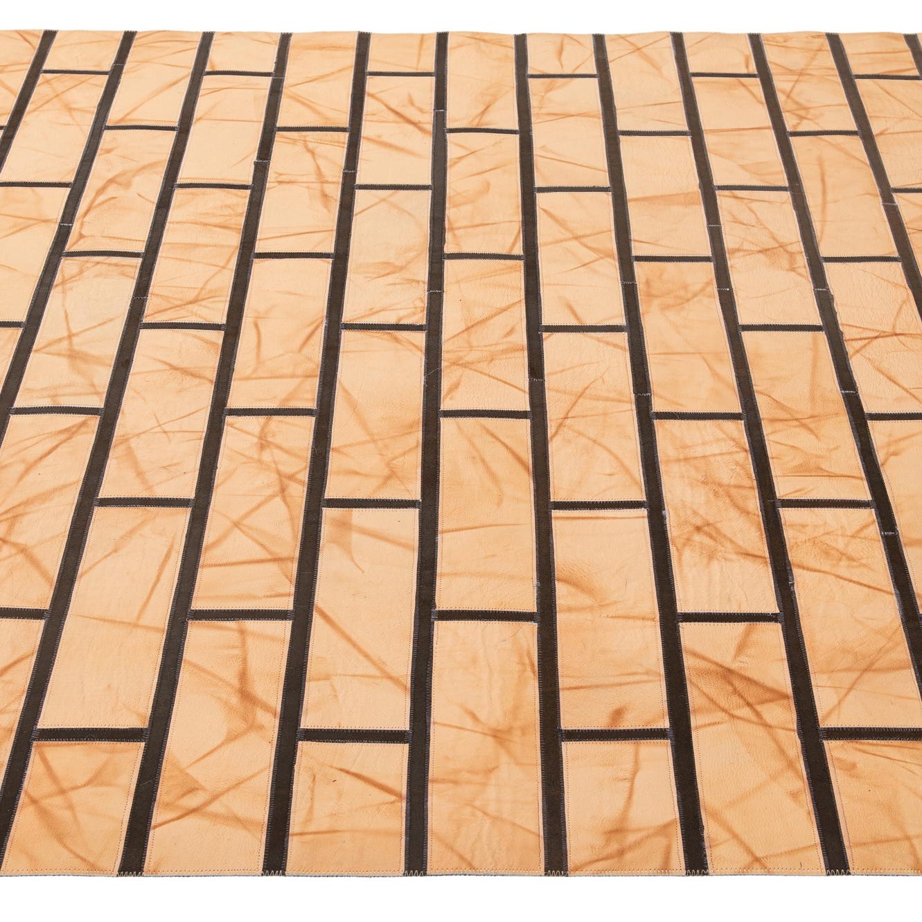 A 5x8 rectangular Cowhide - Patchwork rug featuring a modern brick-like pattern in varying shades of brown and tan, with ivory/cream undertones.