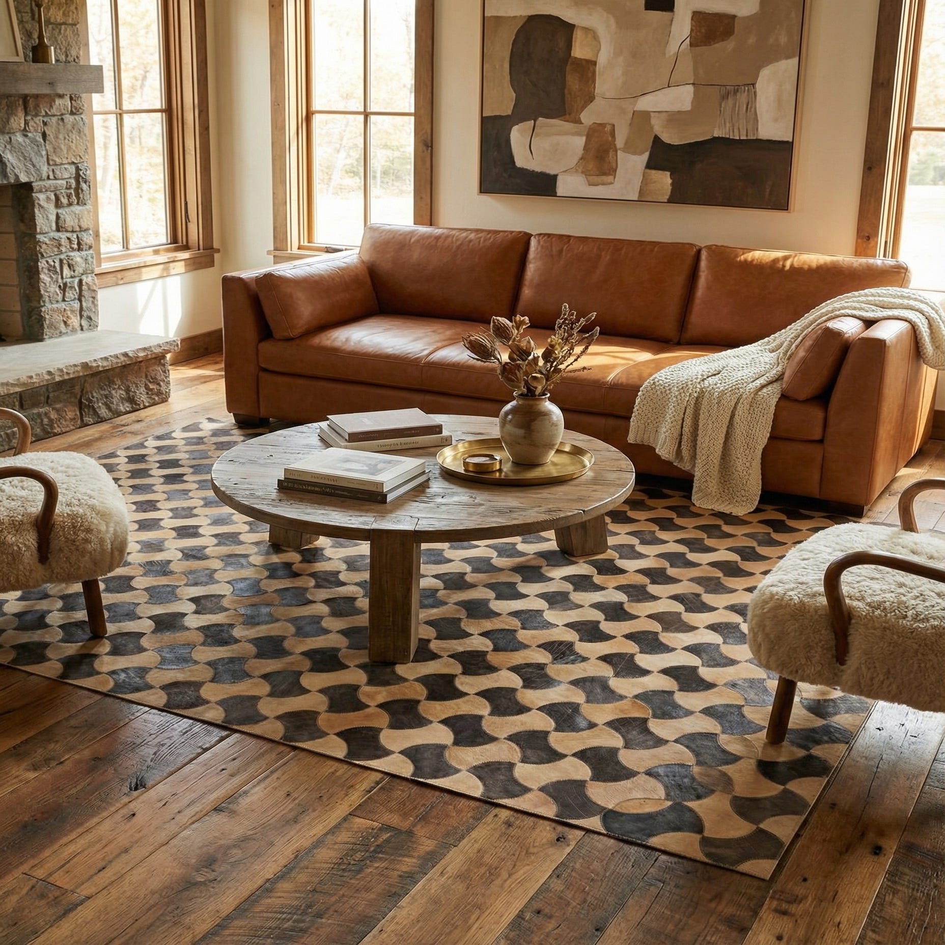 This piece pairs well with mid-century modern and contemporary interiors, where its graphic pattern can anchor a seating area or add contrast beneath a wood dining table. It also complements neutral, Scandinavian-inspired spaces or industrial lofts when layered over hardwood or concrete floors, and can serve as a striking entry or office accent that balances pattern with a muted palette.