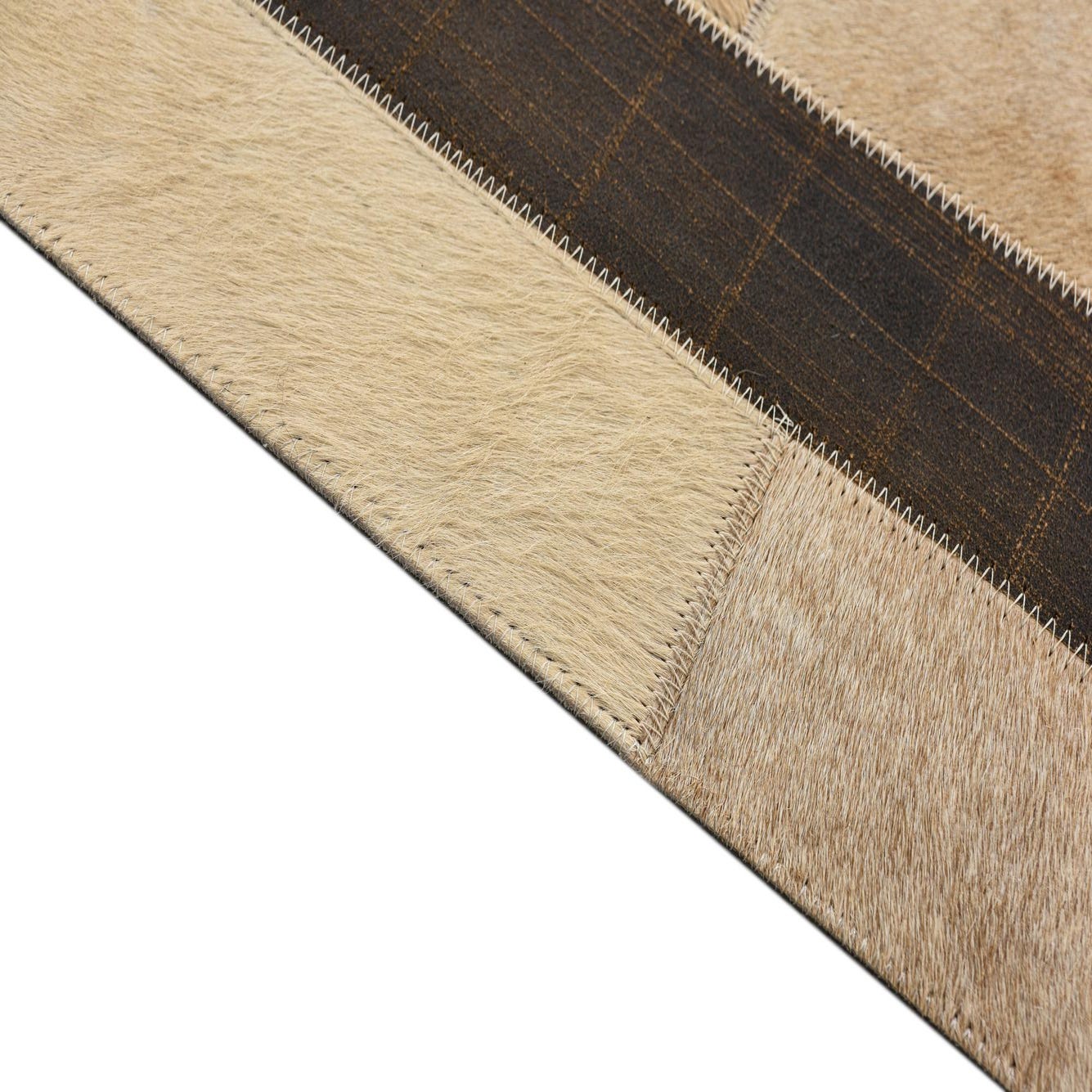 A 5x8 rectangular Cowhide rug featuring a modern pattern of alternating dark brown and light tan vertical strips.