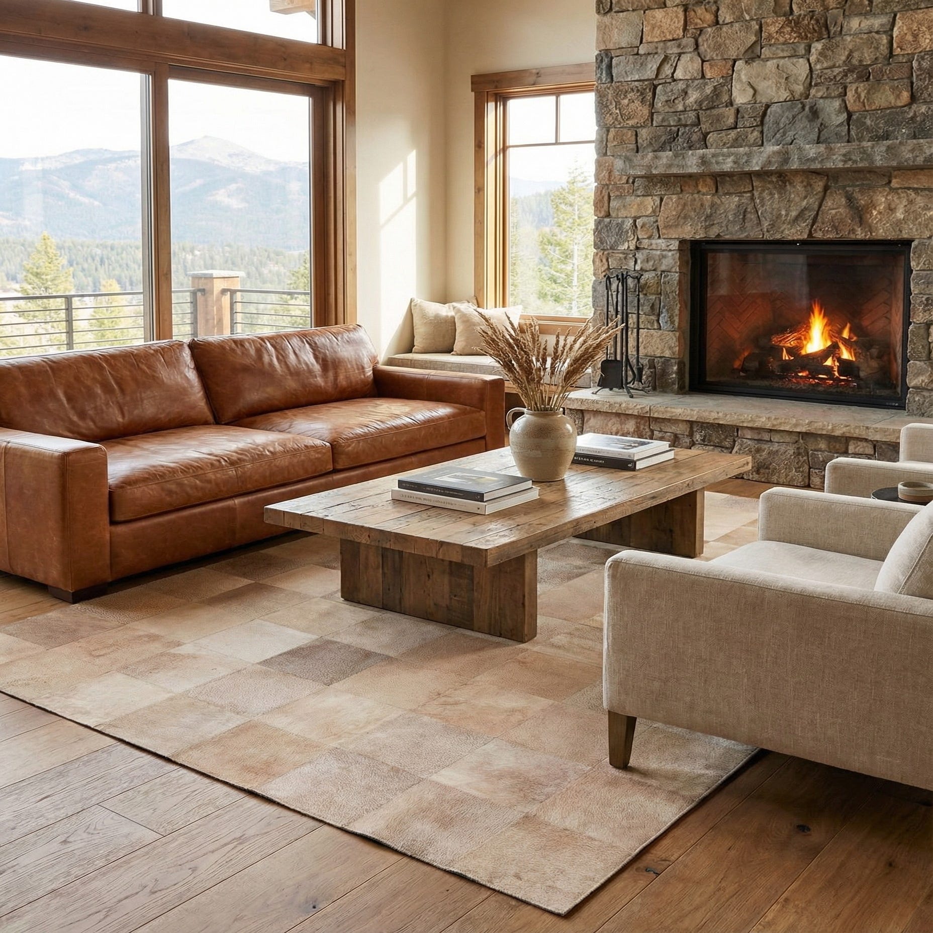 At 5x8 feet, this piece is well-suited for a variety of settings, including a central area in a living room under a coffee table, in a refined office space, or as a sophisticated touch in a modern bedroom. The natural variations in the hides create subtle patterns that work well with minimalist decor, emphasizing clean lines and quality materials. Additionally, the earthy tones can complement a rustic or southwestern aesthetic, bringing an organic feel to the design.