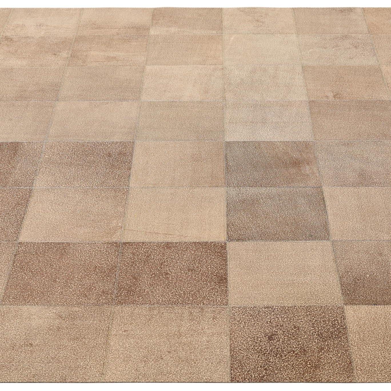 This Cowhide Collection rug is a handcrafted testament to understated elegance with its beige and brown color palette, harmoniously merging in a patchwork of natural cowhide squares. The background color showcases varying shades of beige, offering a sense of warmth and neutrality, making it a versatile addition to any interior space. The tactile texture of cowhide and leather lends itself to a unique sensory experience underfoot.