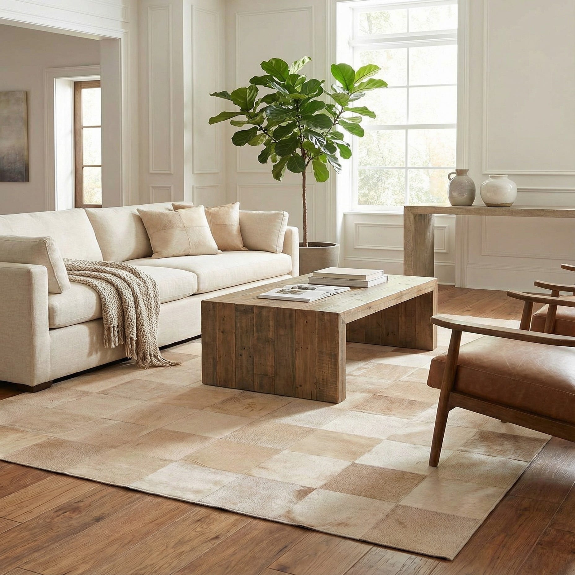 This rug pairs well with warm wood furniture and neutral upholstery; place it under a coffee table to anchor a living area or at the foot of a bed for understated texture. It works especially well in minimalist or Scandinavian interiors where subtle detail matters, and it also complements transitional or rustic schemes when layered with linen, brass accents, or reclaimed-wood pieces.