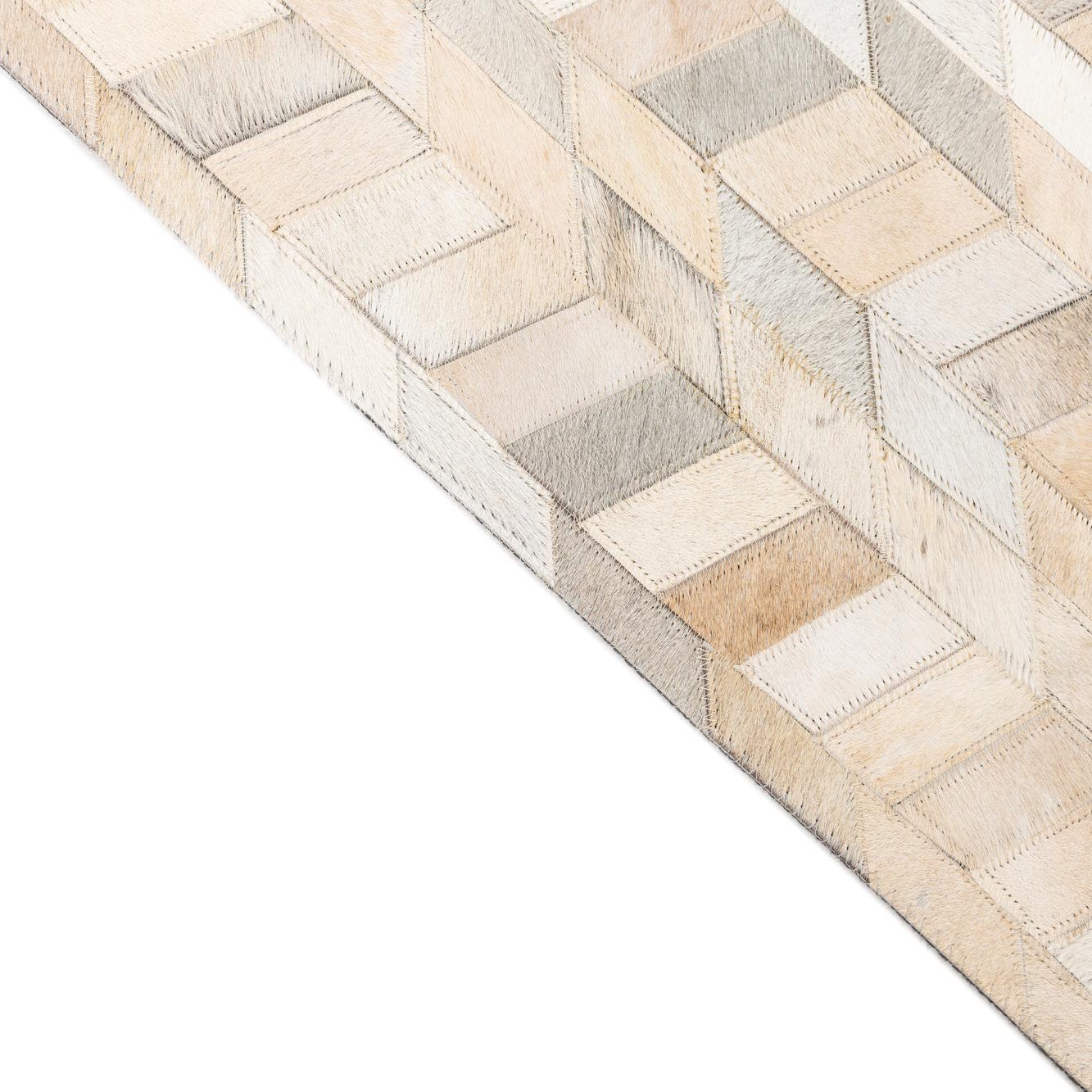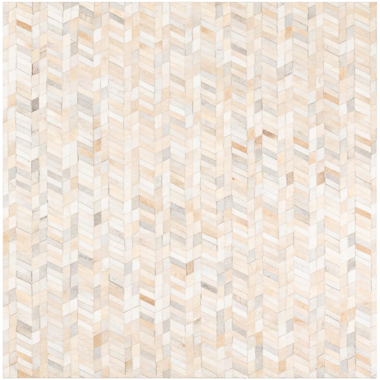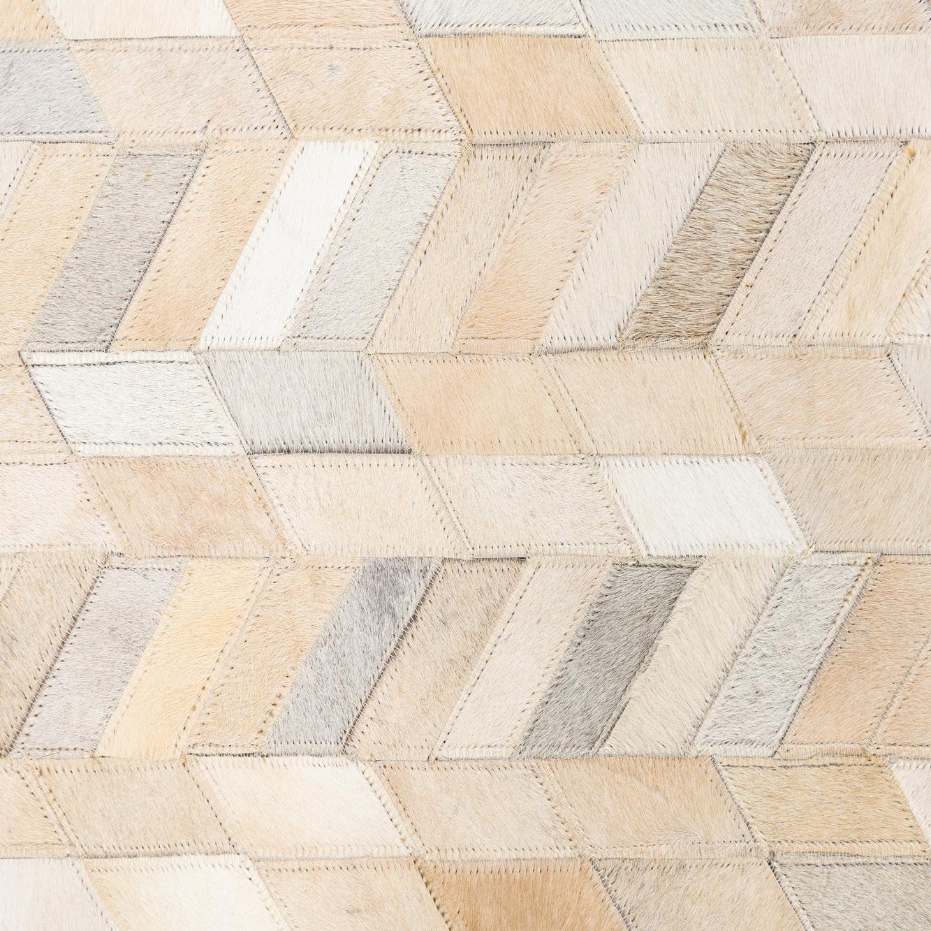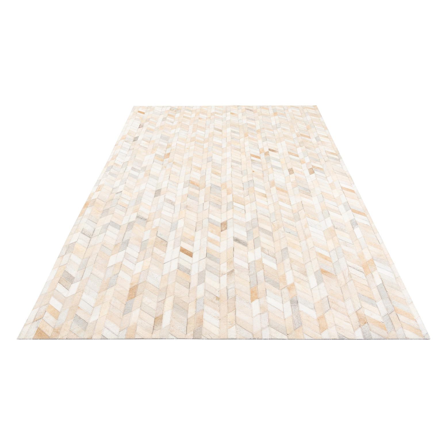 A 5x8 rectangular Cowhide Leather rug featuring a modern chevron pattern in shades of brown, tan, and ivory.