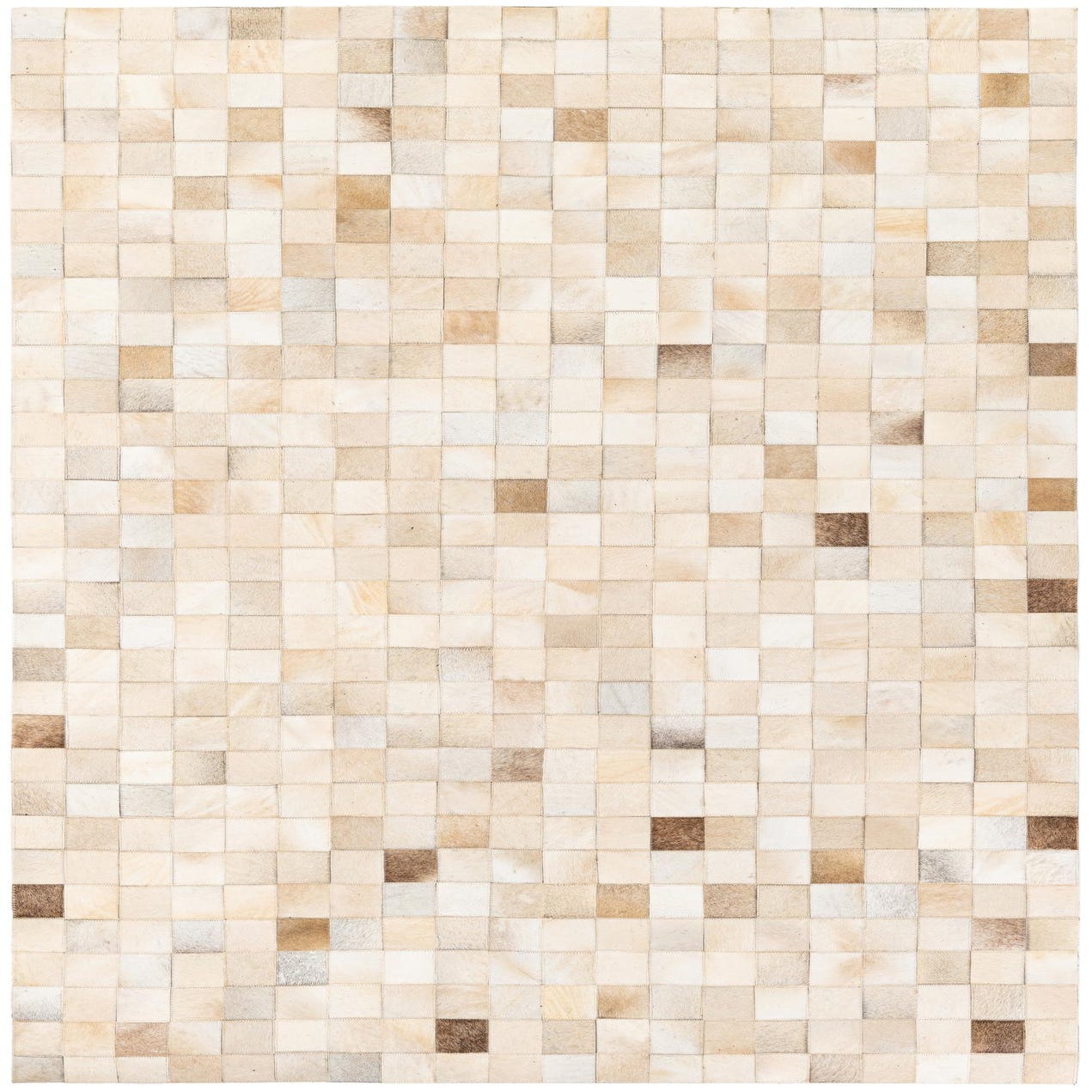 A 5x8 rectangular Cowhide Stocks rug by Rugs.com, featuring a modern patchwork of brown, tan, and ivory cowhide squares.
