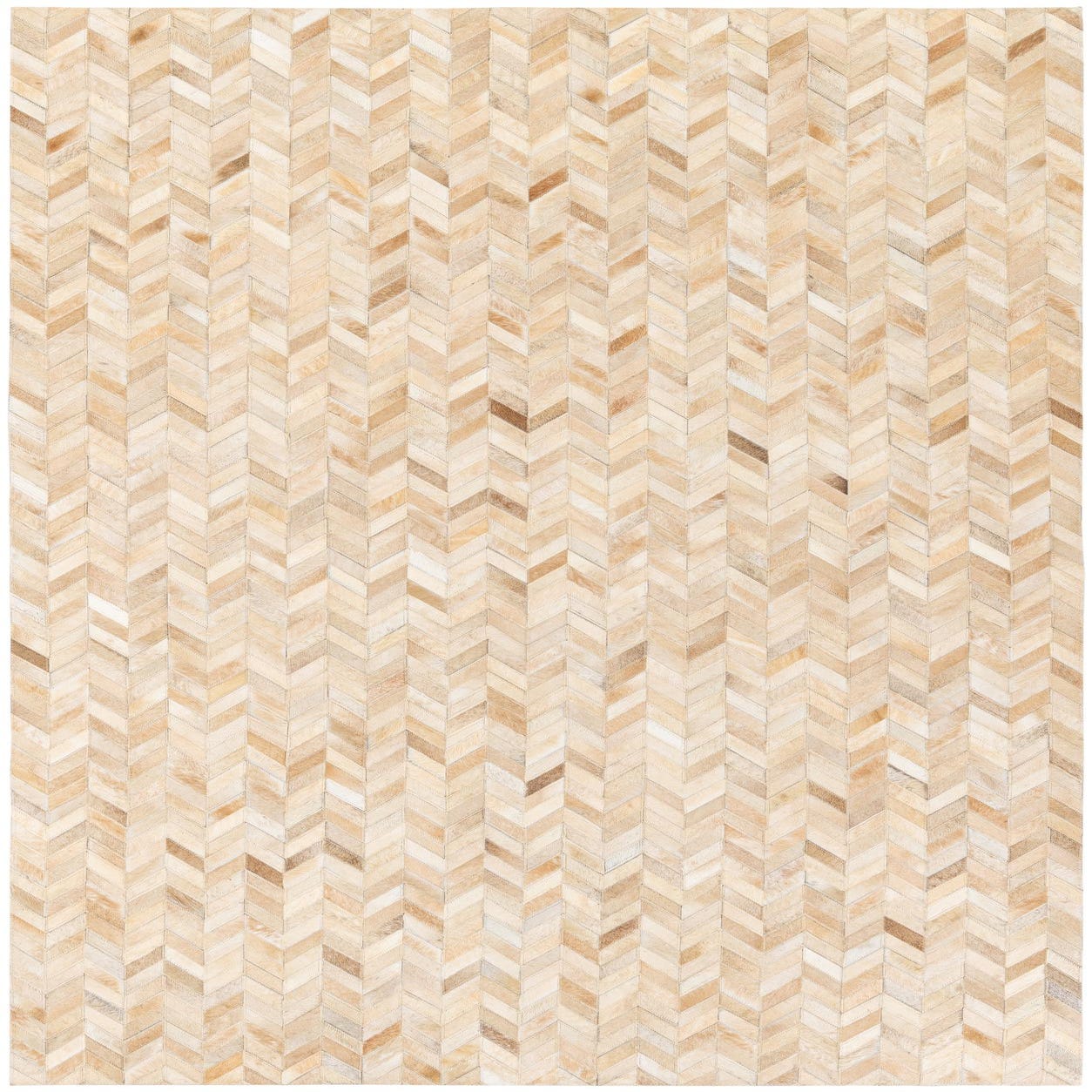 A 5x8 rectangular Cowhide Stocks rug from Rugs.com, featuring a modern chevron pattern in varied shades of brown, tan, and cream.