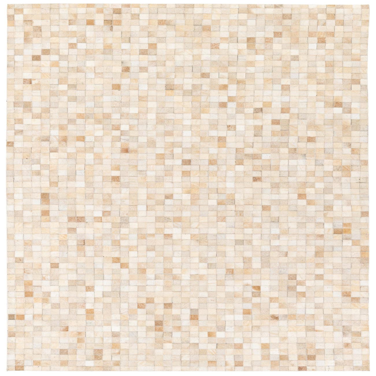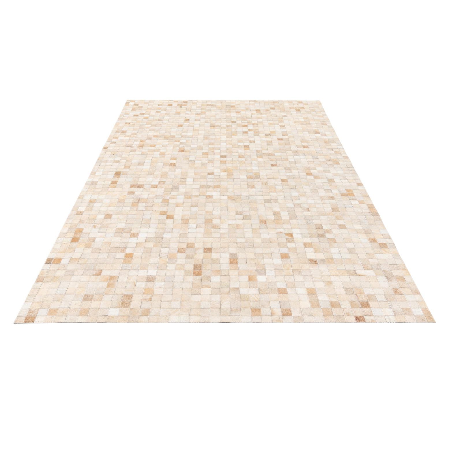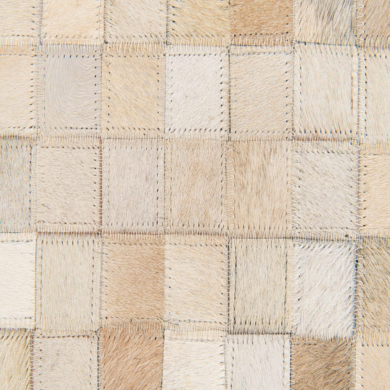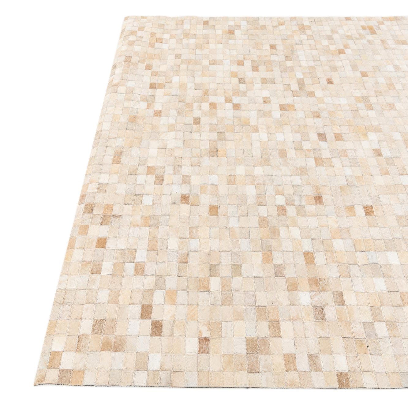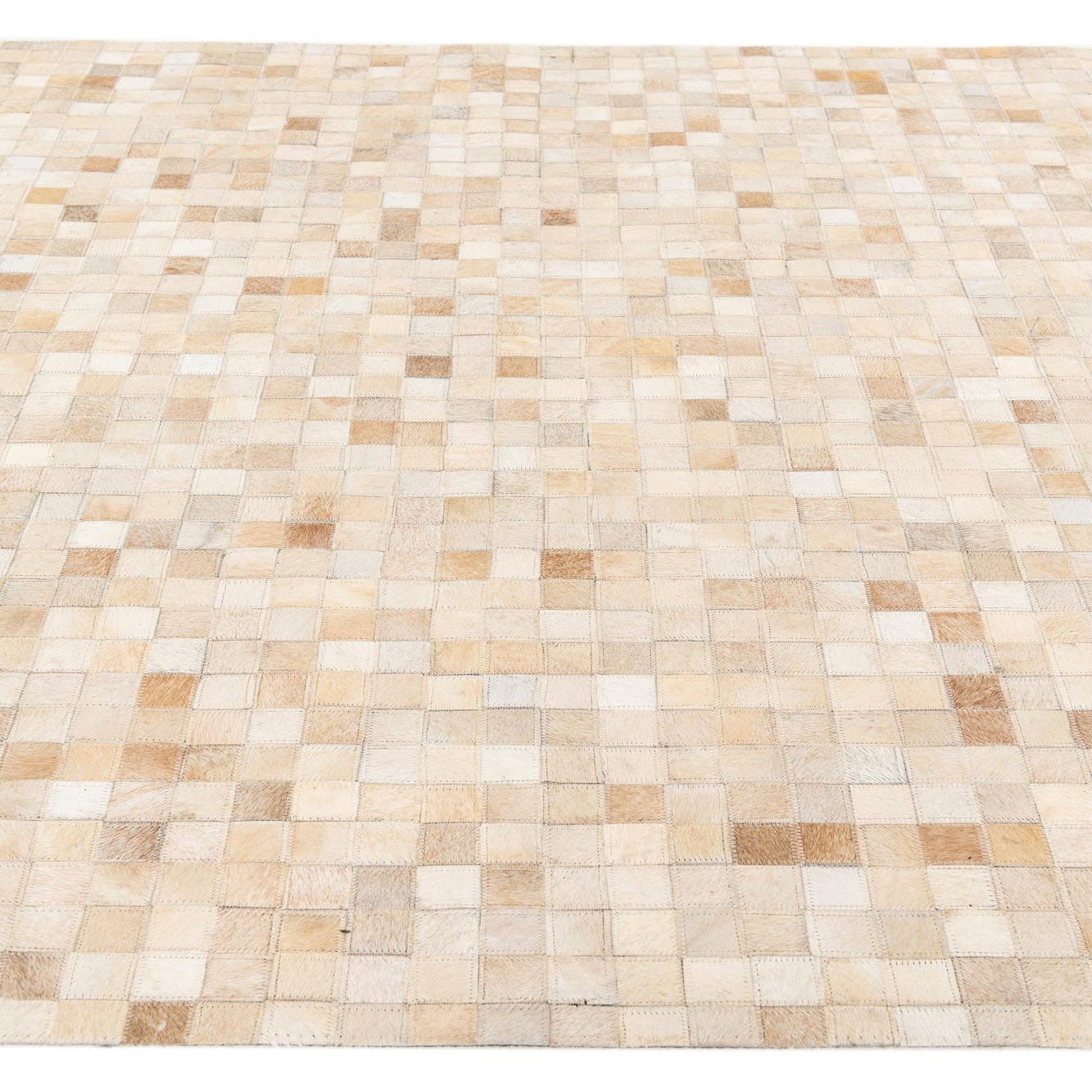 A 5x8 rectangular Cowhide Stocks rug by Rugs.com, featuring a modern patchwork of brown, tan, and ivory cowhide squares.