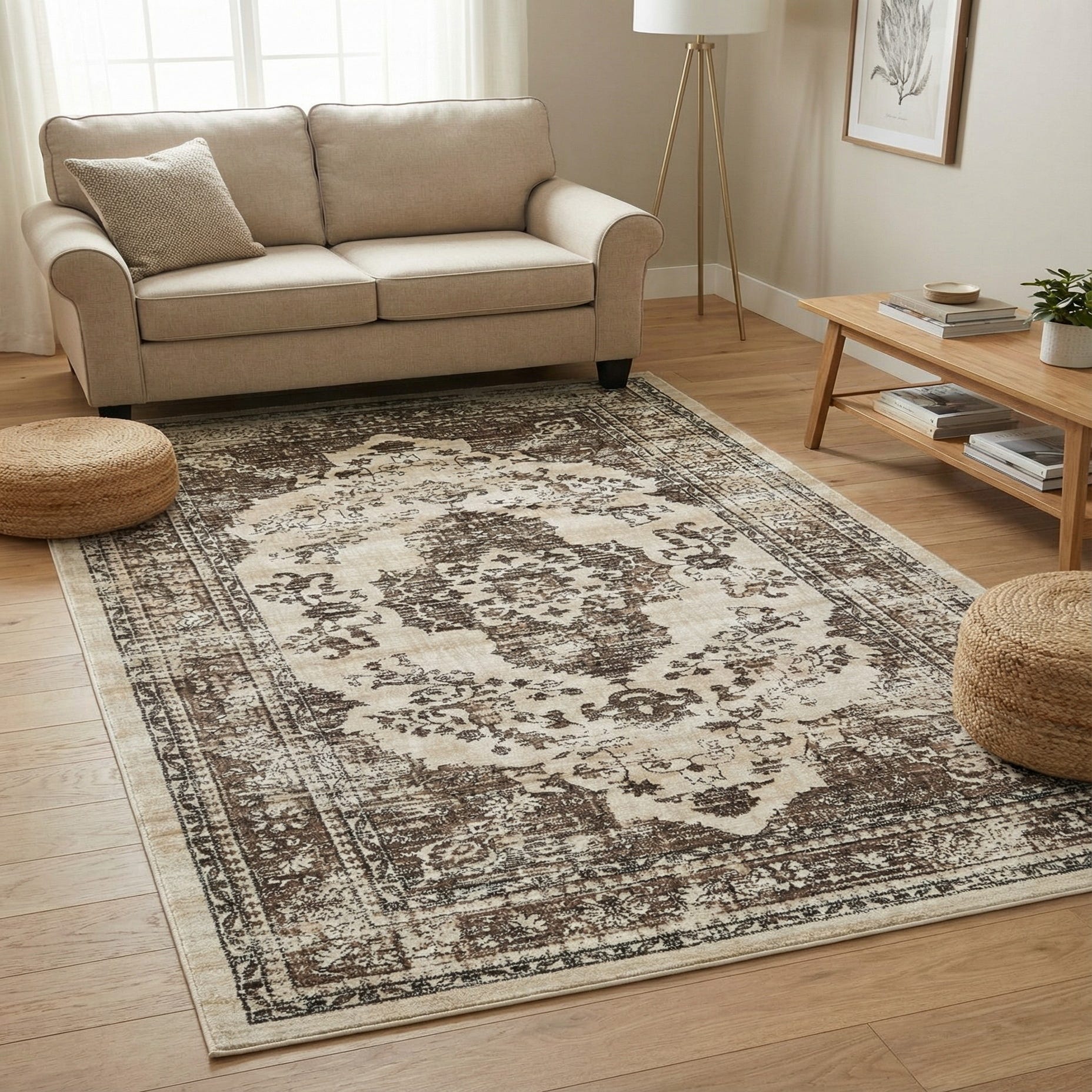 Primary color is Beige. Colors in this rug include: Beige, Black, Brown, Light Brown.
