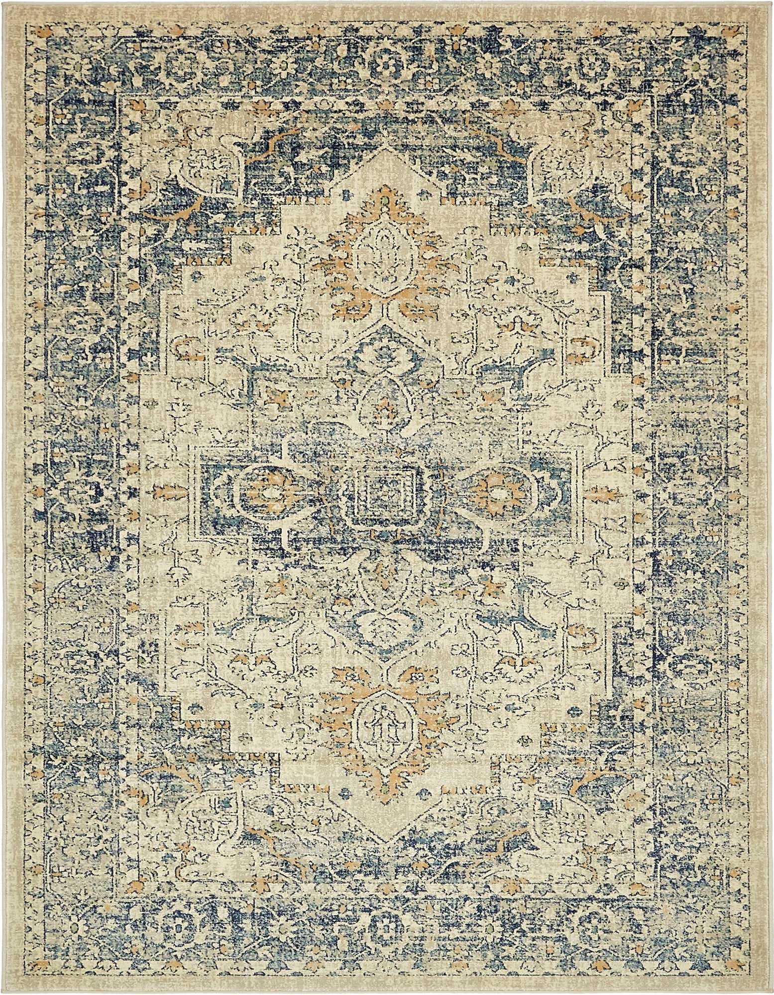 Primary color is Beige. Colors in this rug include: Beige, Blue, Navy Blue, Tan.