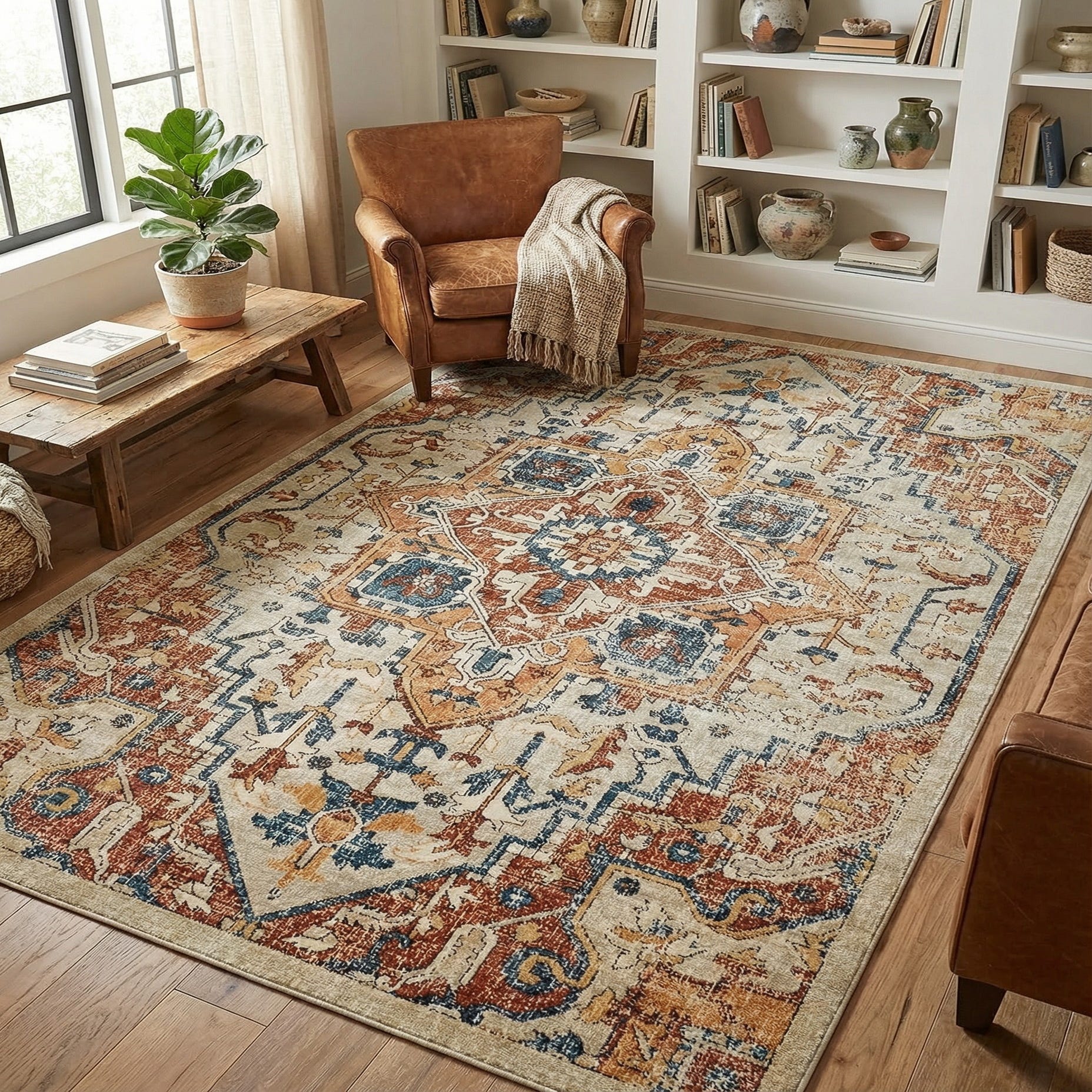 A traditional medallion design with a gently distressed finish, this rug pairs classic motifs with a relaxed, lived-in look. A beige field sets a neutral stage for a central geometric medallion and scrolling floral elements rendered in warm rust-orange and red, balanced by blue and navy accents, touches of brown and bright yellow. The pattern has softened edges and layered color washes that give the surface visual texture while keeping the overall impression grounded and approachable.
