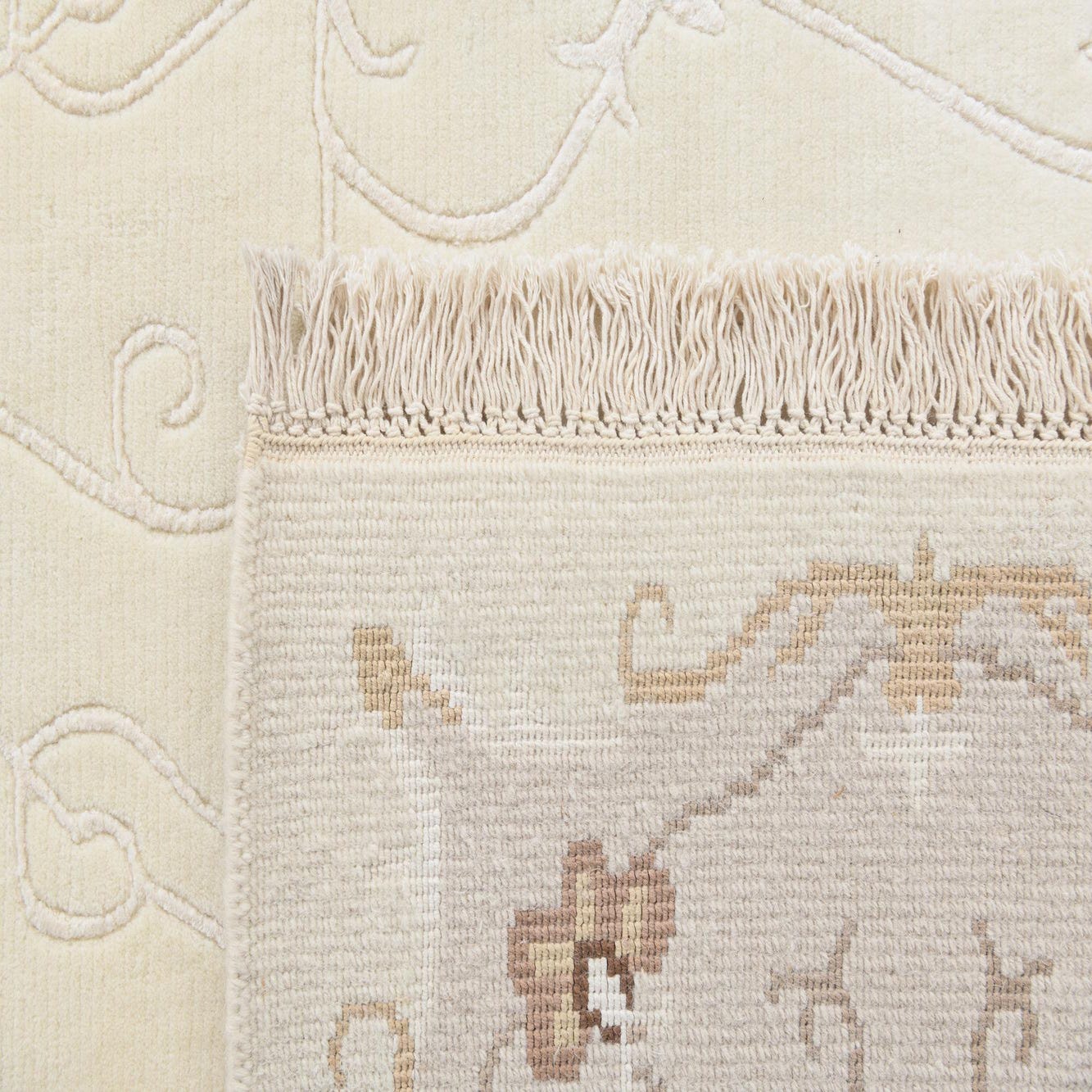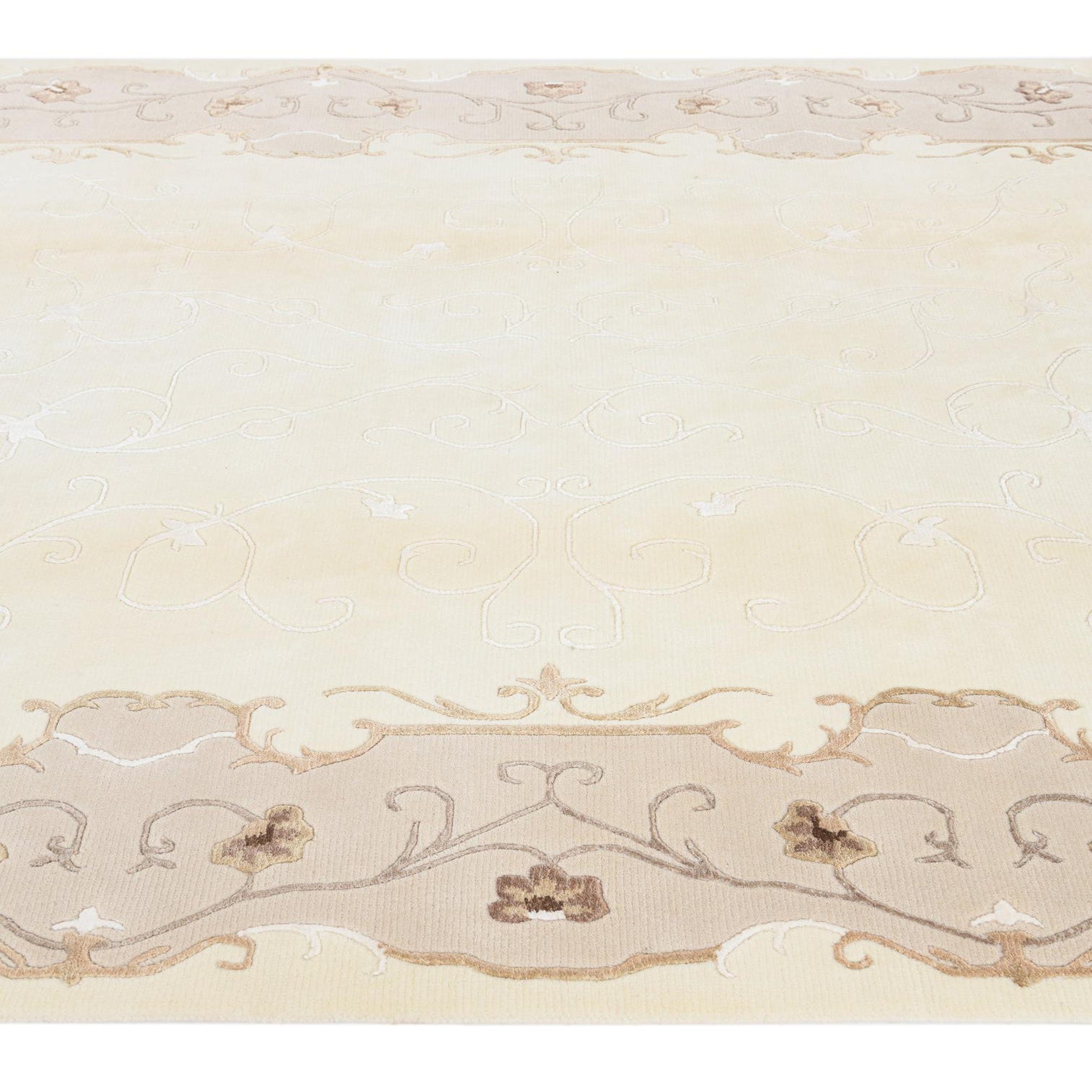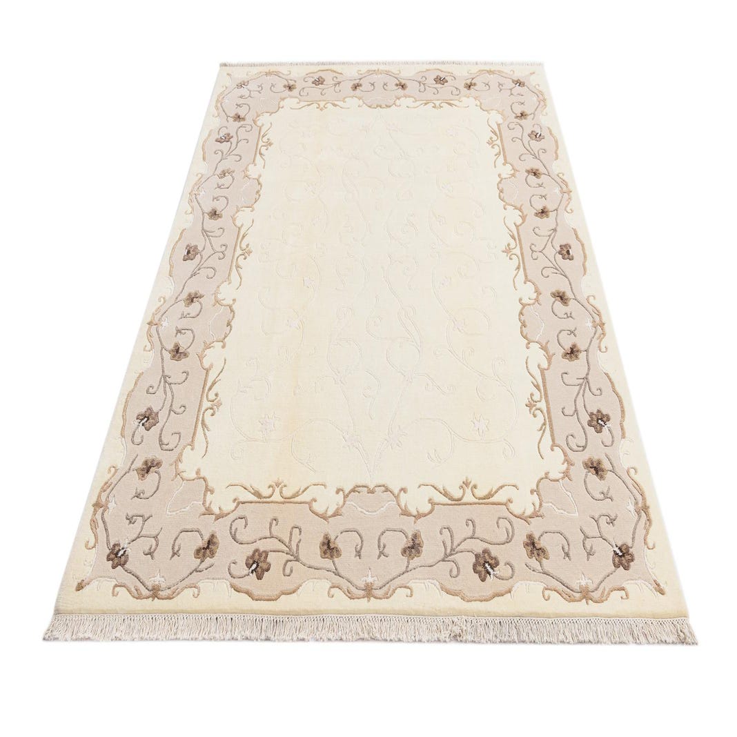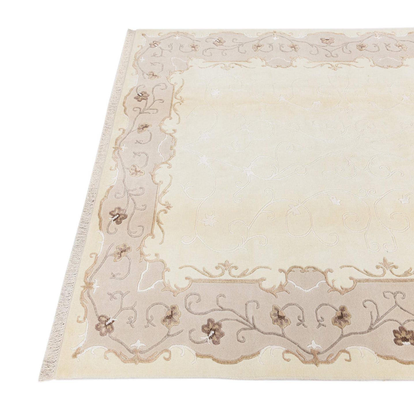 The Darya Collection offers a hand-made rug crafted from a harmonious blend of wool and cotton, providing both durability and softness underfoot. This 5x8 area rug features a symmetrical pattern with ornate scrolling vines and floral motifs that create a sophisticated and classic aesthetic. The palette includes shades of beige, ivory, light brown, and tan, set against a neutral beige background, which easily complements a range of color schemes.