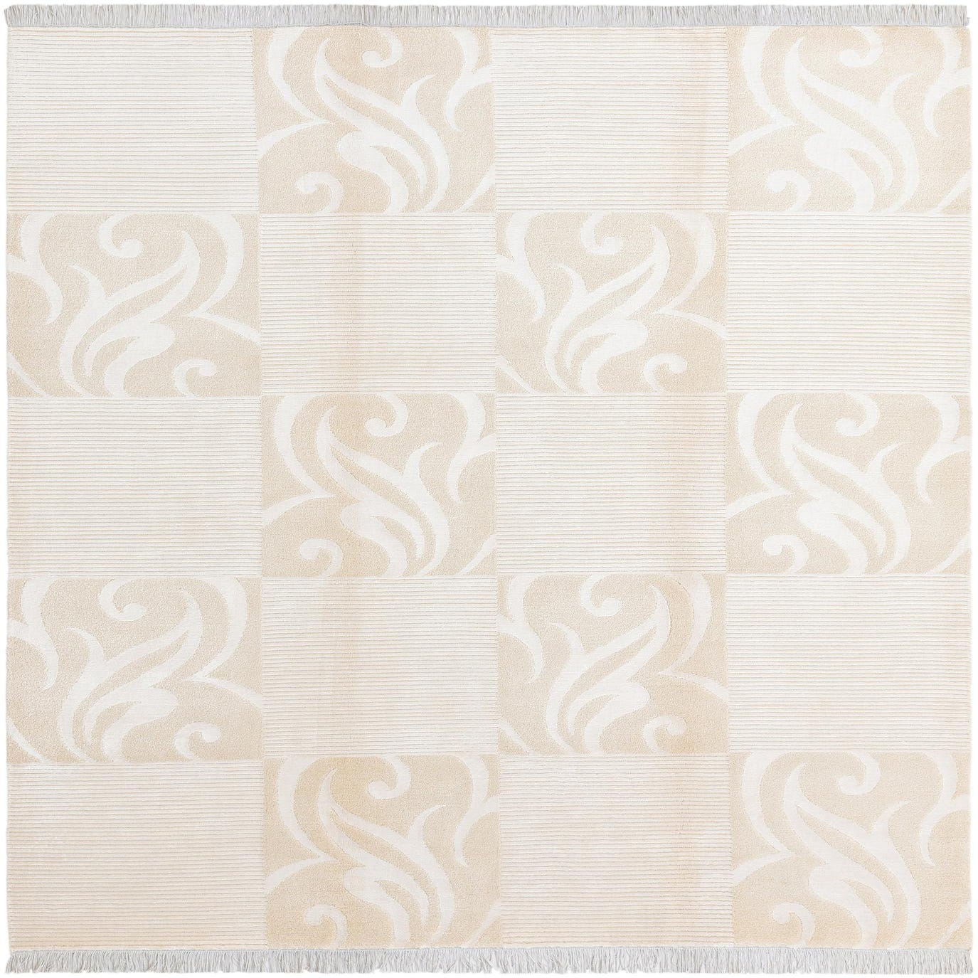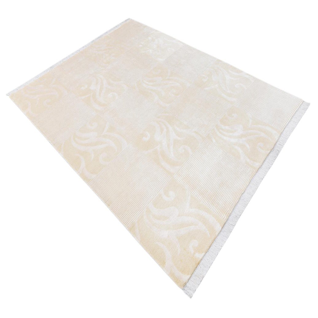 A 5x8 rectangular Darya rug with a modern Persian pattern in alternating squares of ivory scrollwork and tan horizontal stripes, featuring fringed ends.