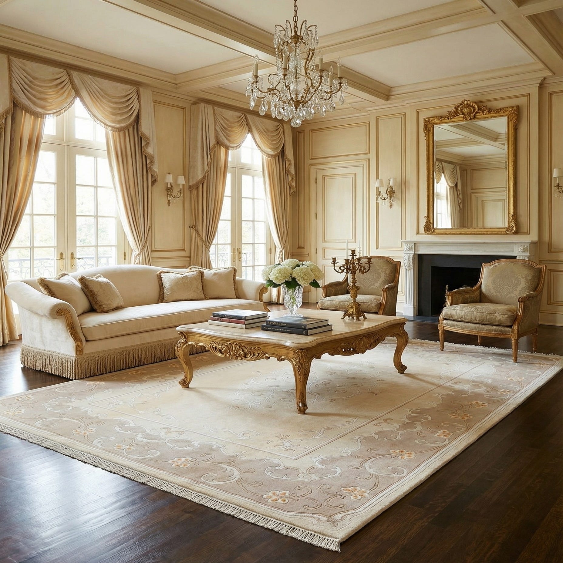 As an interior design element, this rug would seamlessly fit into a classical setting, enhance a transitional space with its blend of old and new, or bring a touch of elegance to a minimalistic environment. It is a versatile piece that can serve as a unifying element within a variety of interior spaces.