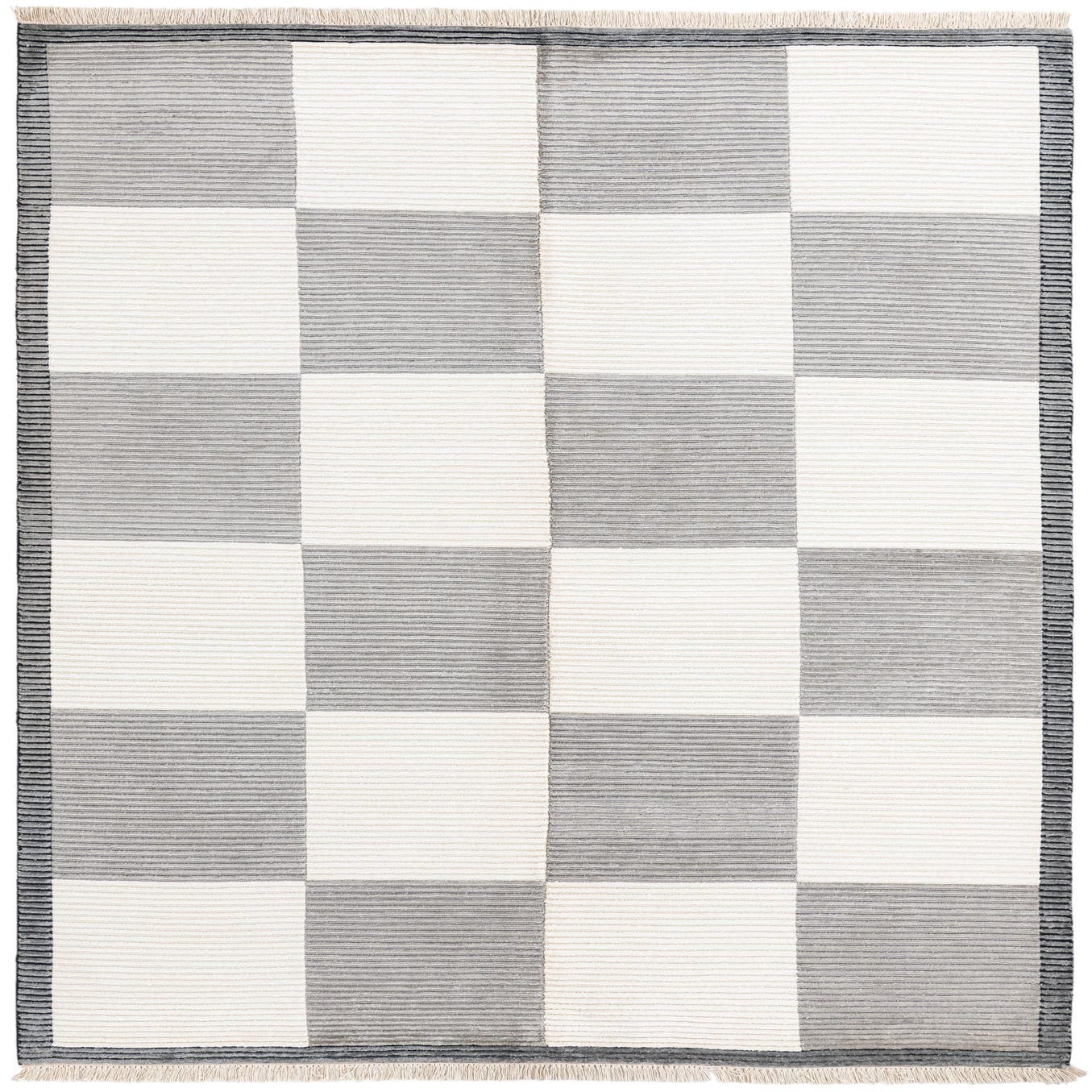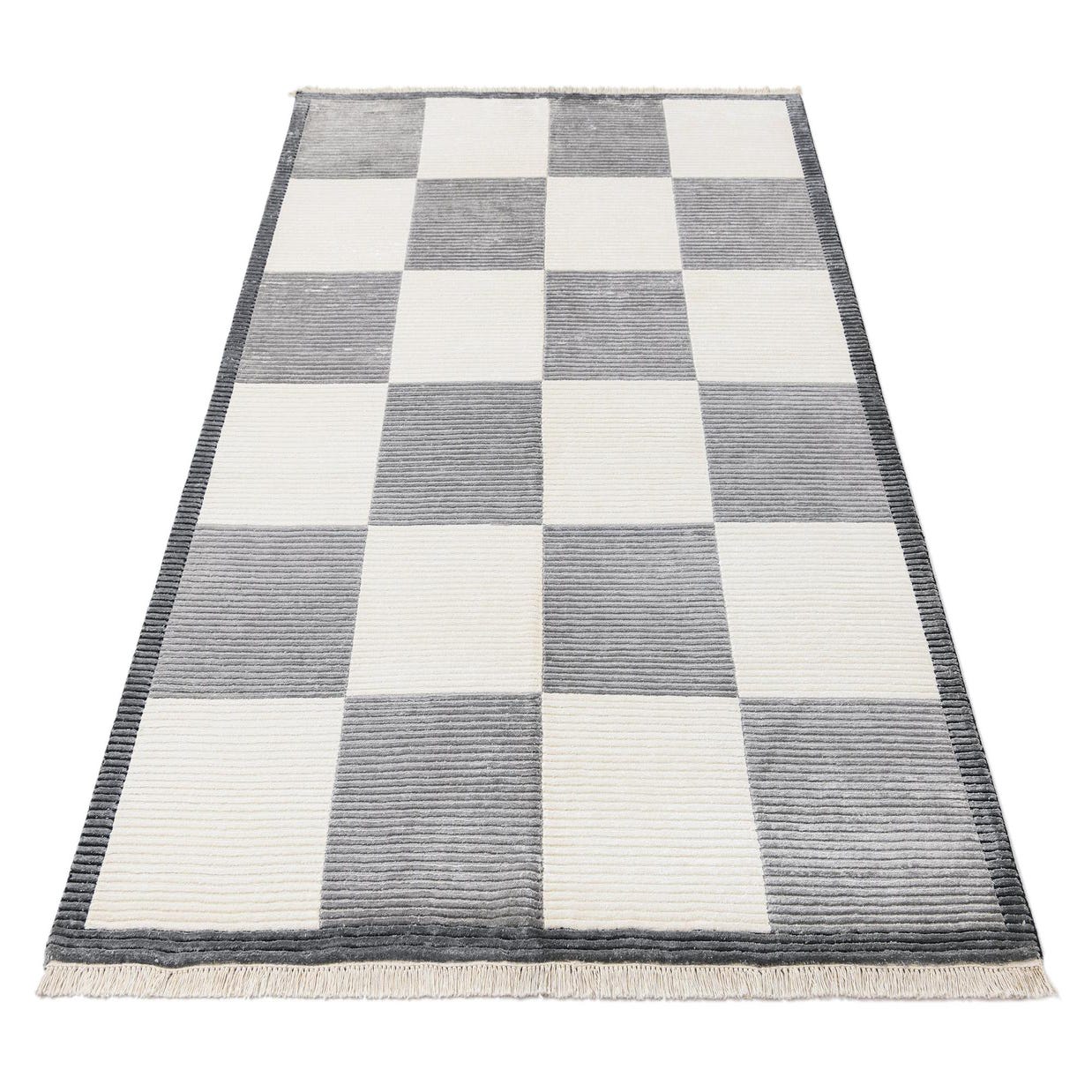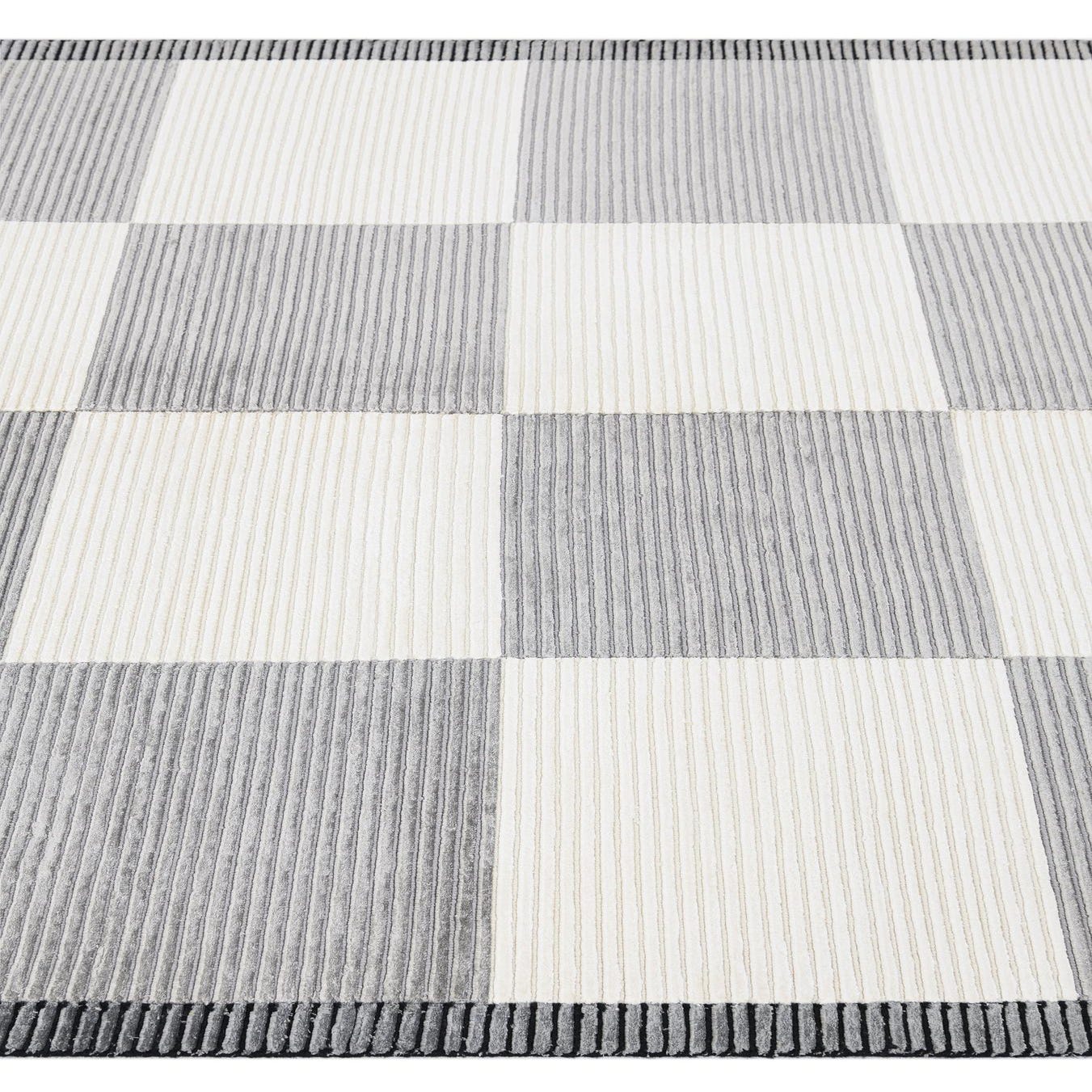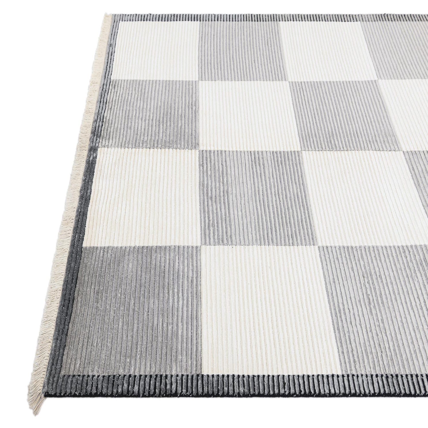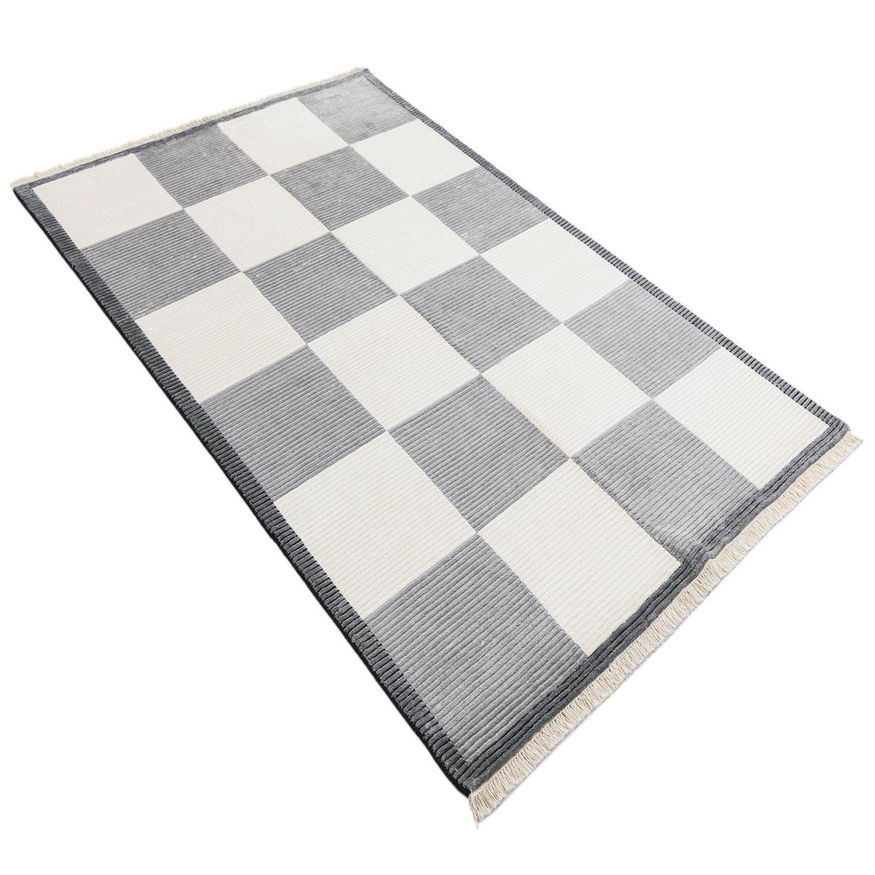 A 5x8 rectangular Darya rug with a modern checkerboard pattern in alternating brown and ivory squares, featuring a high pile.