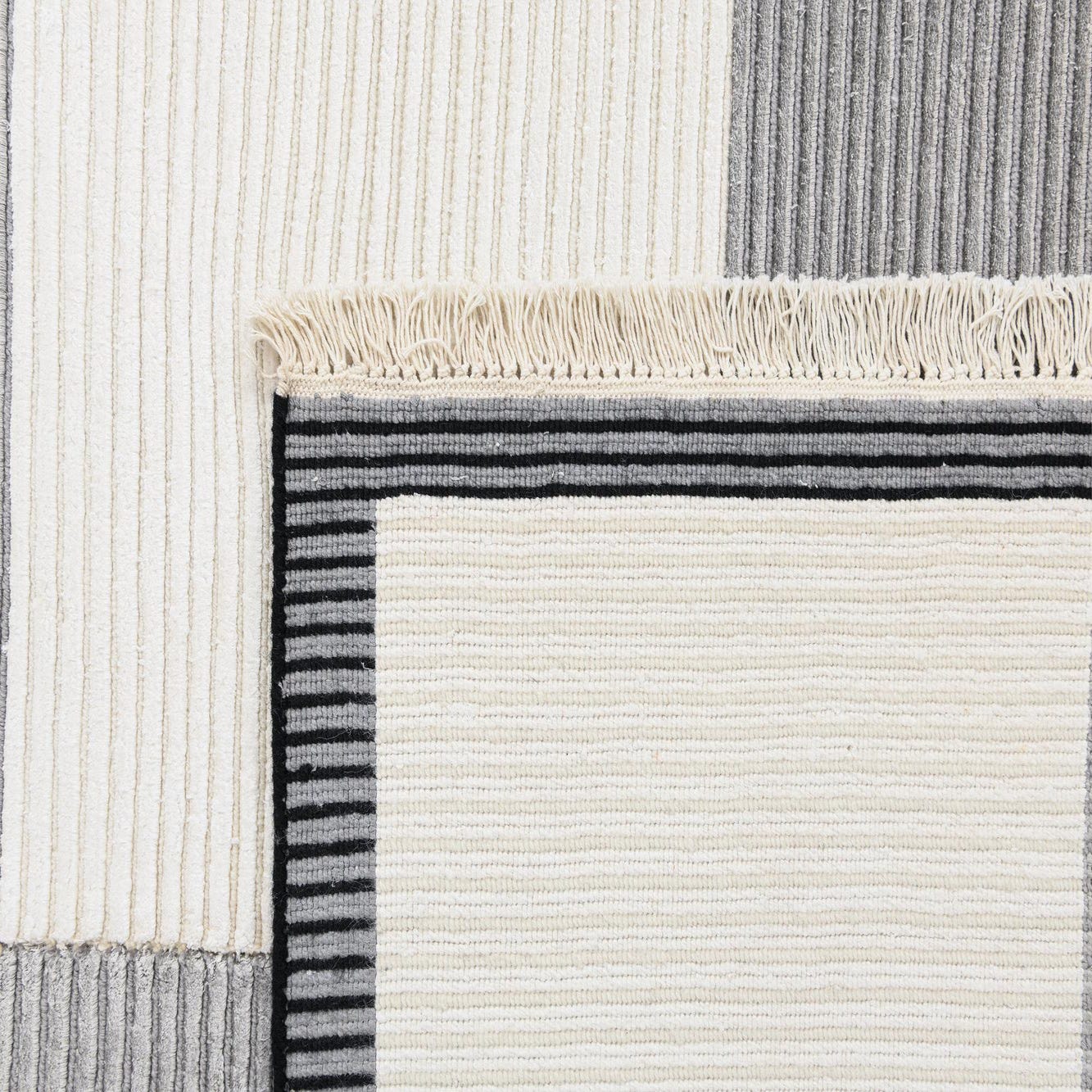 Primary color is Beige. Colors in this rug include: Beige, Black, Gray.