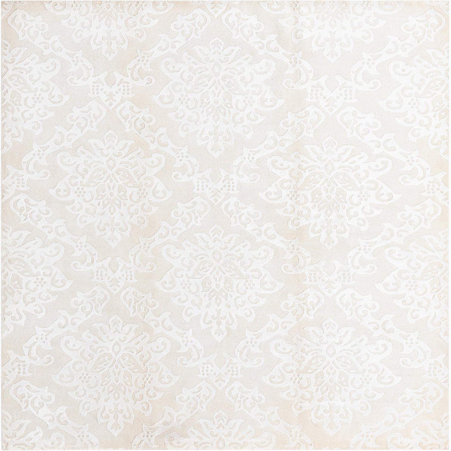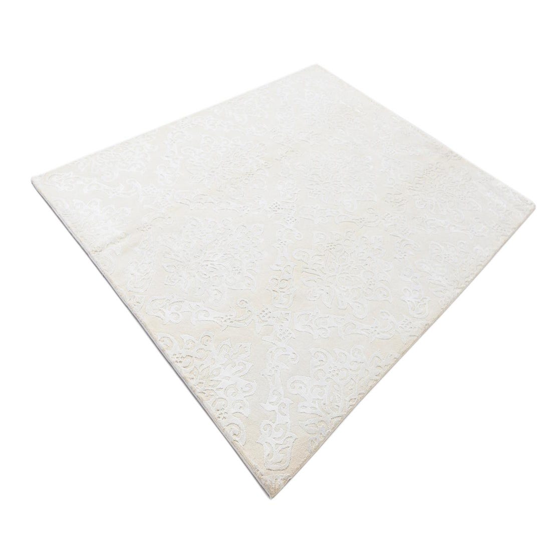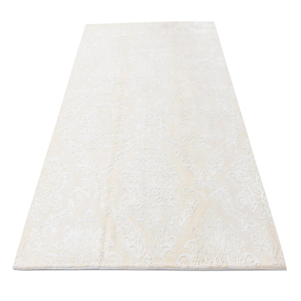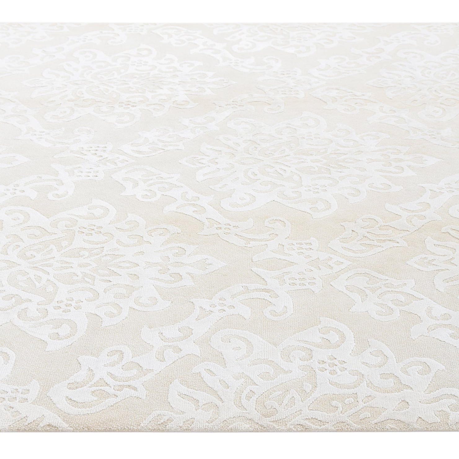A classic damask medallion pattern in ivory is woven across a warm beige ground, forming an elegant repeating motif of scrolling arabesques and floral accents. Hand made of wool and cotton, the rug offers a tactile contrast: the wool pile provides a soft, resilient surface underfoot while the cotton foundation adds structure and a gentle, low-relief texture where the pattern rises slightly above the background.