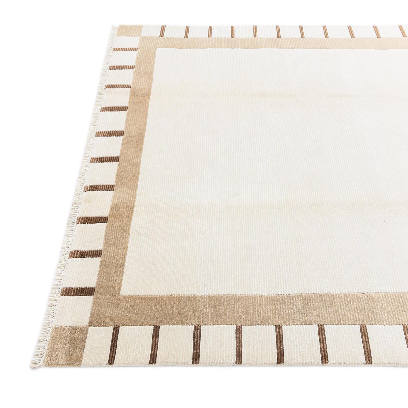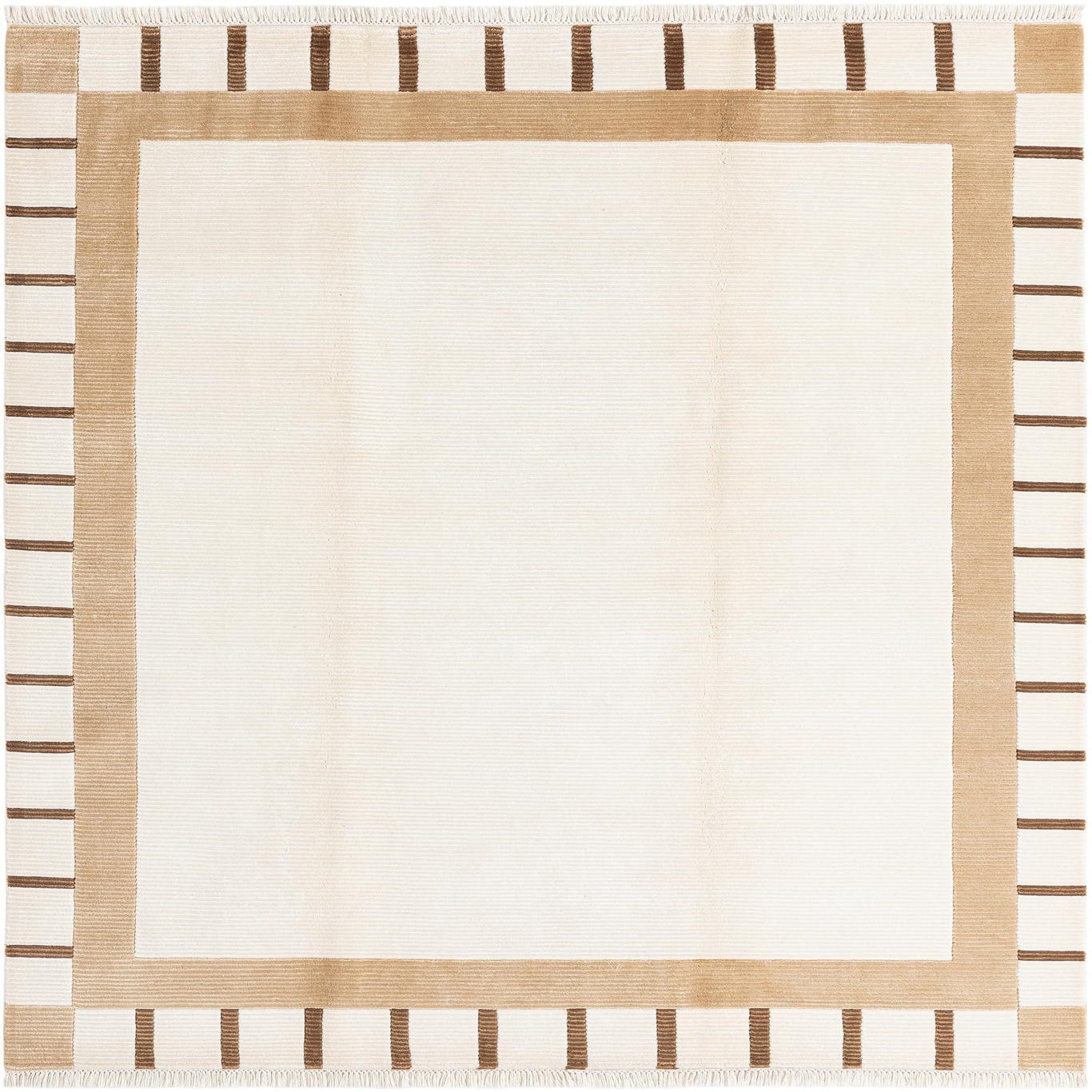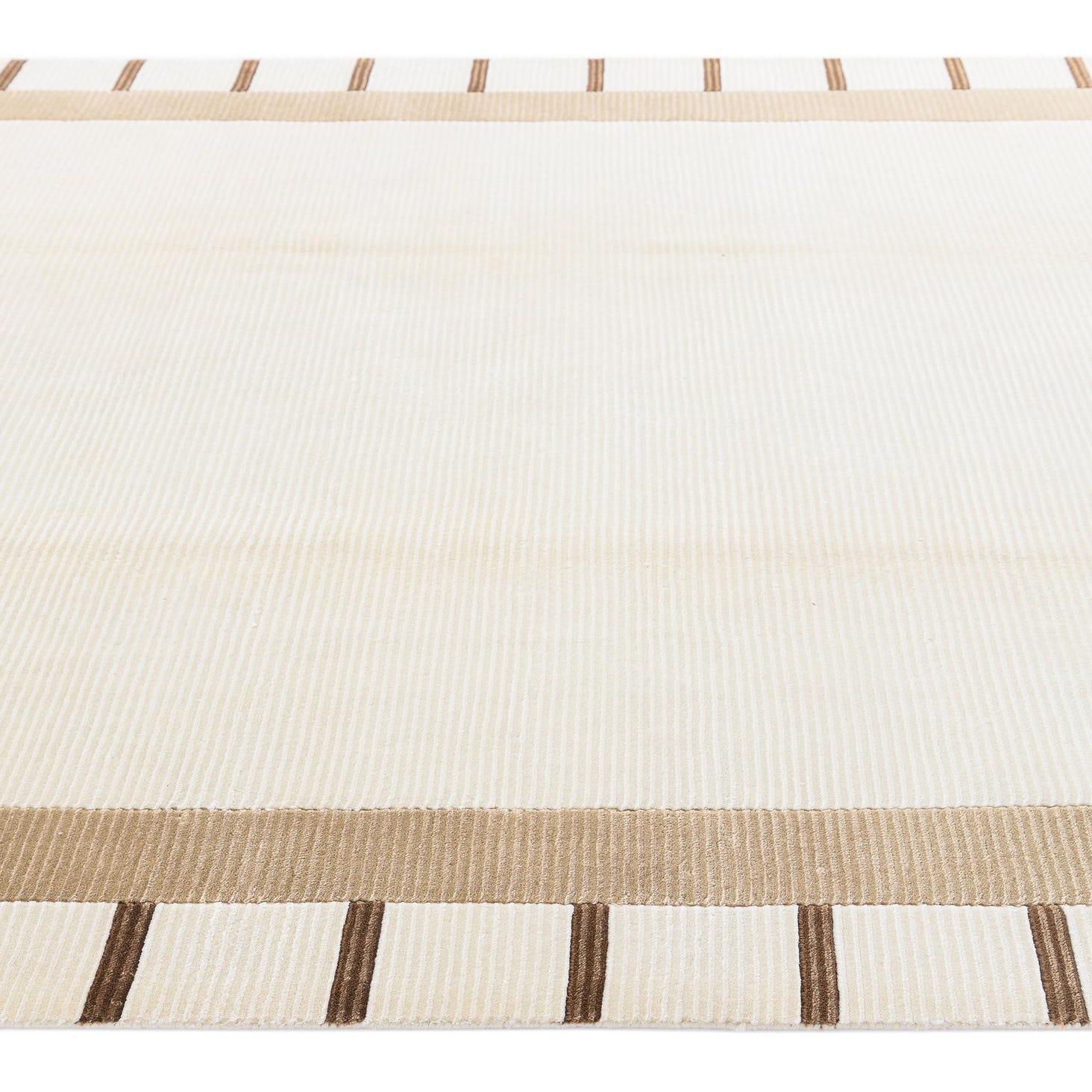 A rectangular 5x8 modern Persian rug with a cream center and a wide tan border featuring dark brown stripes.