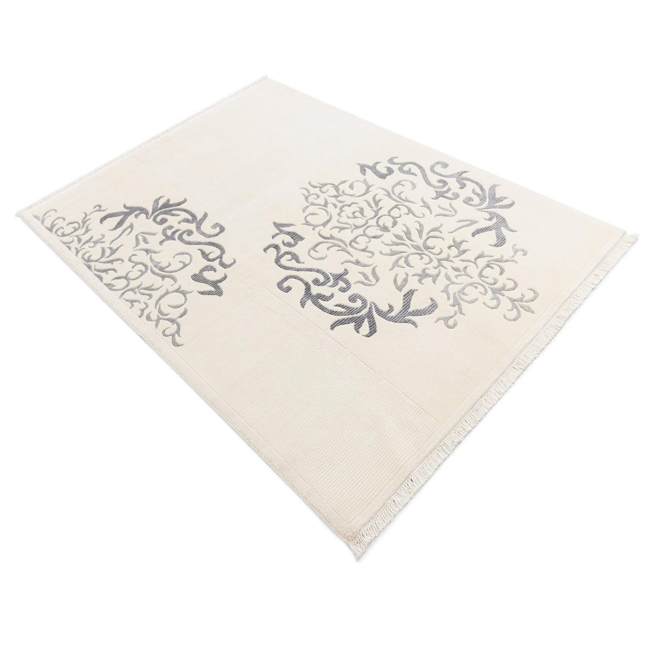 The Darya Collection offers a sophisticated 5x8 handcrafted rug that is a beautiful blend of wool and cotton, displaying a serene beige background complemented by details in shades of gray, ivory, and silver. The rug showcases an elegant pattern featuring traditional damask motifs that bring a timeless aesthetic to any space.