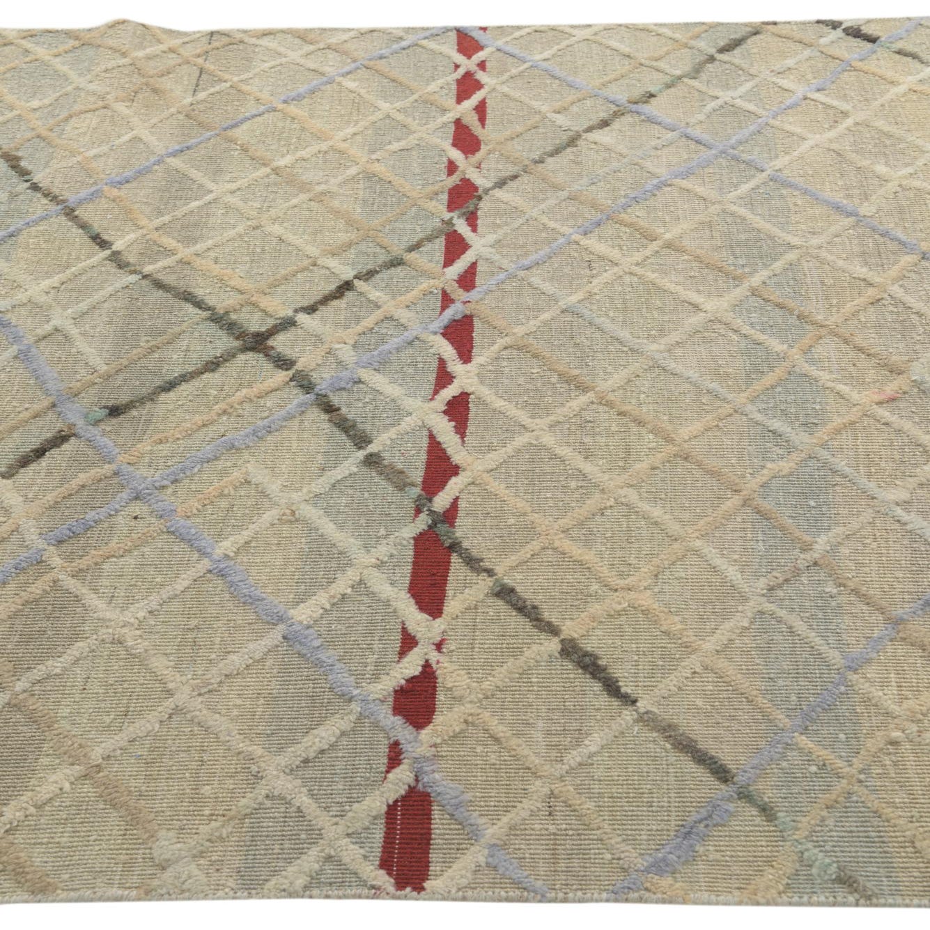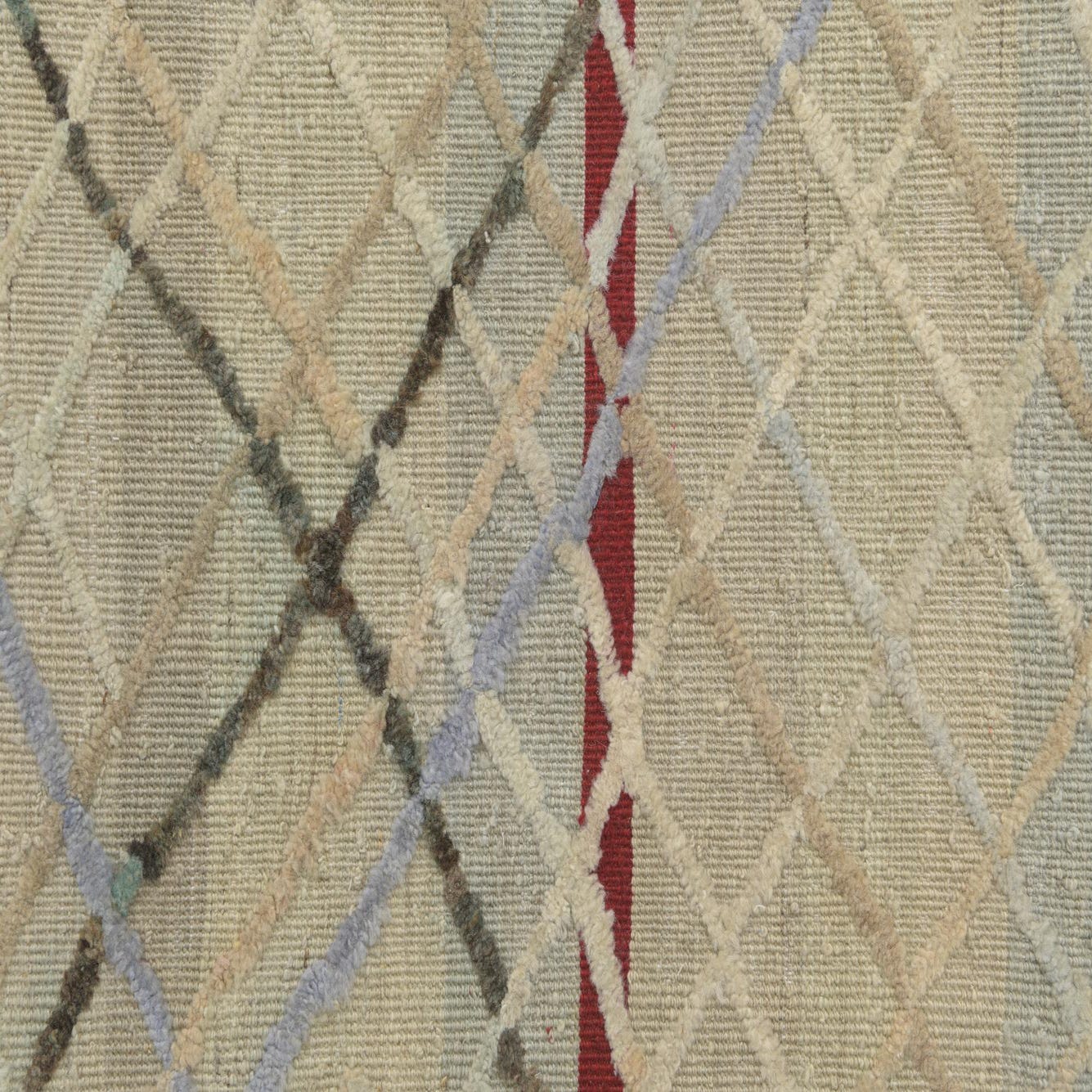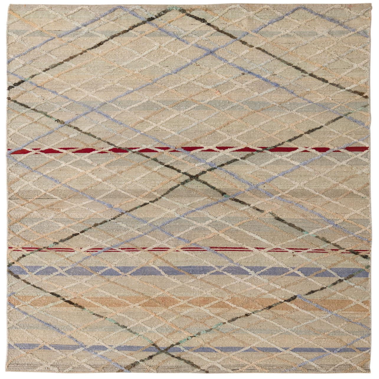 The Darya Collection 5x8 rug is a hand-knotted piece crafted from 100% wool, ensuring a durable and long-lasting addition to your living space. The rug displays a beige background, accented with an array of colors including black, blue, brown, gray, and red. This piece features a distinctive pattern with geometric lines and motifs that intersect and create a lattice-like design across the field. The texture of the wool provides a soft, plush feel underfoot.