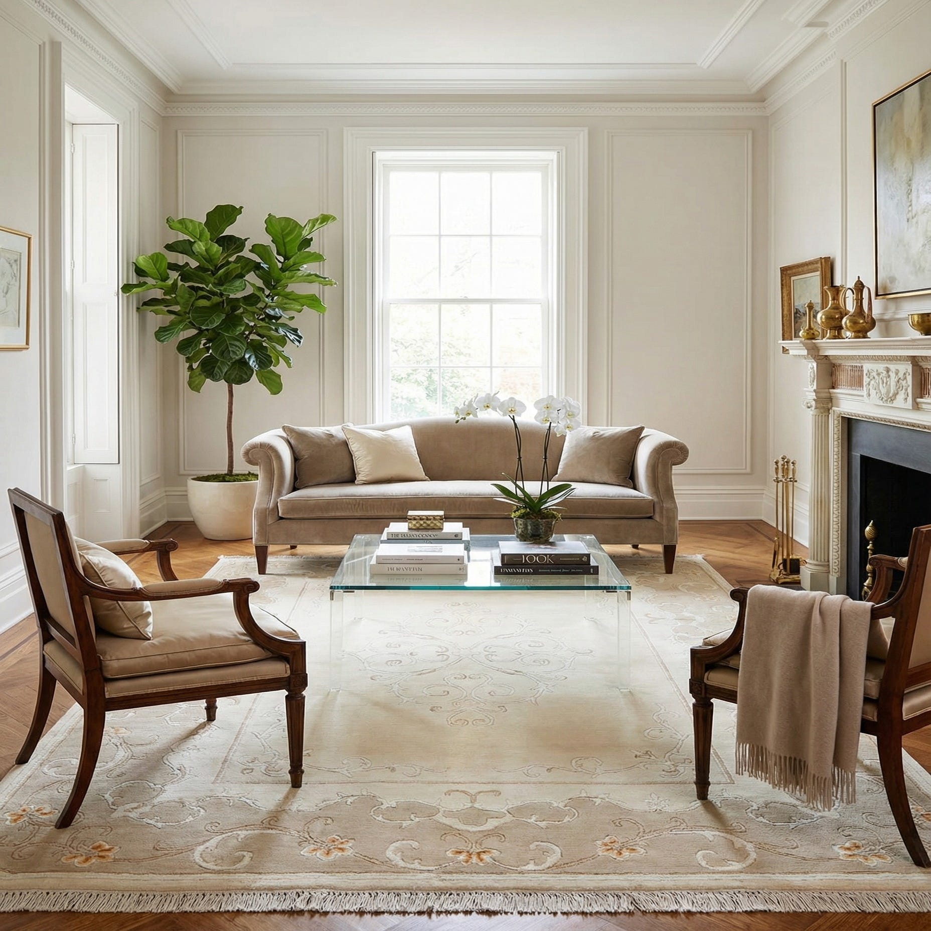 The texture of this rug is characteristic of wool, providing a soft and inviting underfoot experience. The meticulous hand-knotted construction ensures durability and a touch of artisan craftsmanship to any room. This rug would integrate seamlessly into traditional settings or add a touch of timelessness to more contemporary interiors. Its neutral color scheme makes it highly adaptable to various color palettes, whether serving as a subtle foundation in a monochromatic room or as a gentle contrast in a richer, more colorful setting.