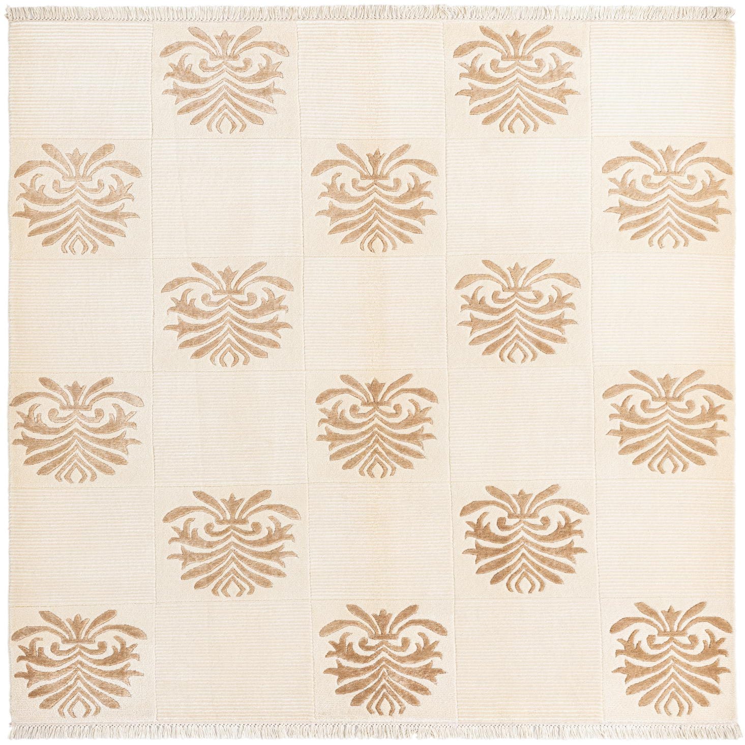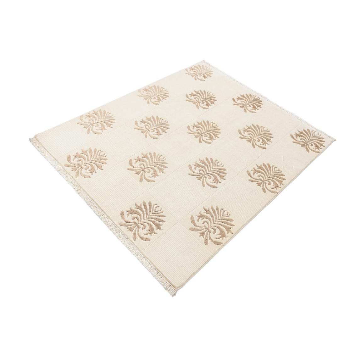 A 5x8 rectangular Darya rug with a modern oriental pattern in cream and tan, featuring high pile and fringe.