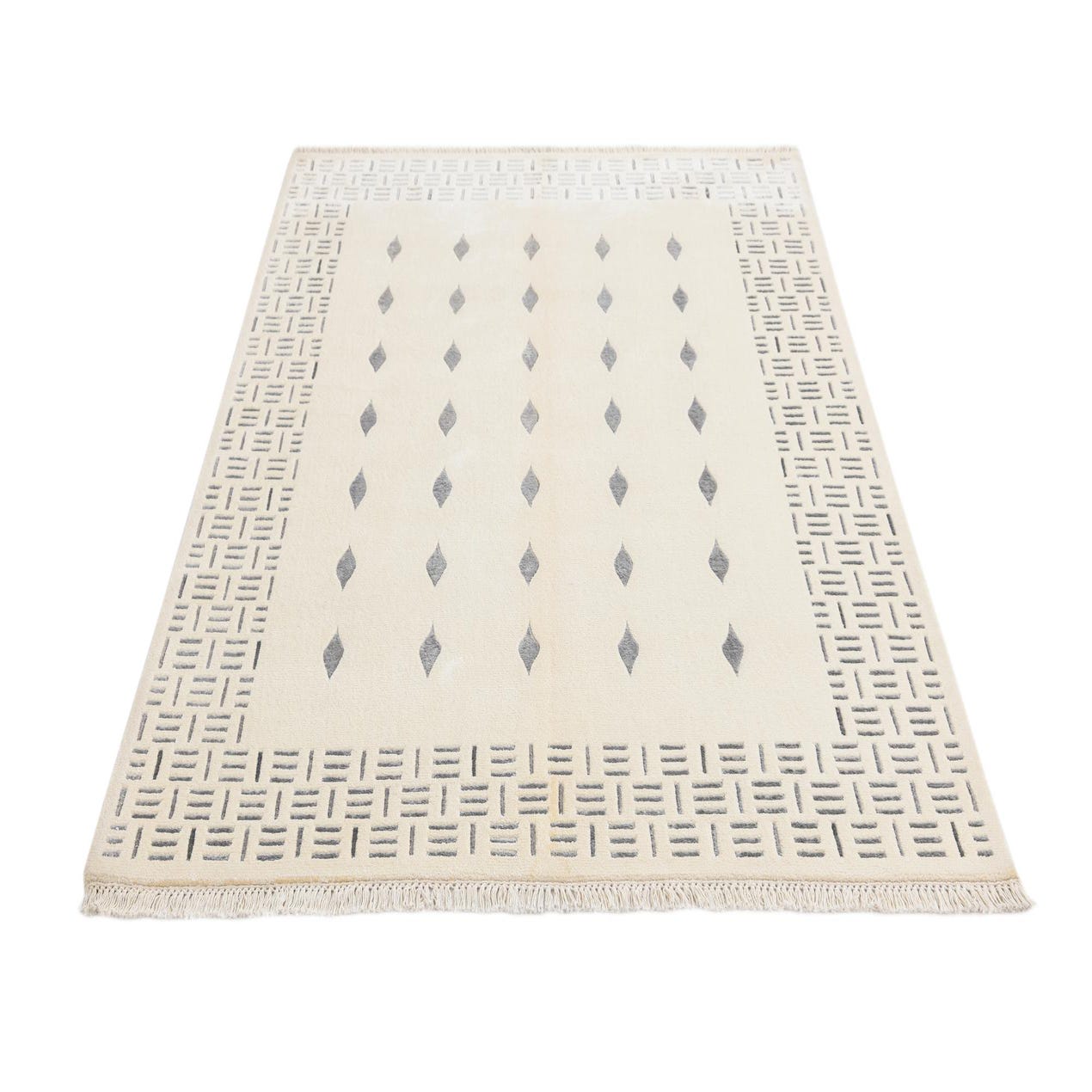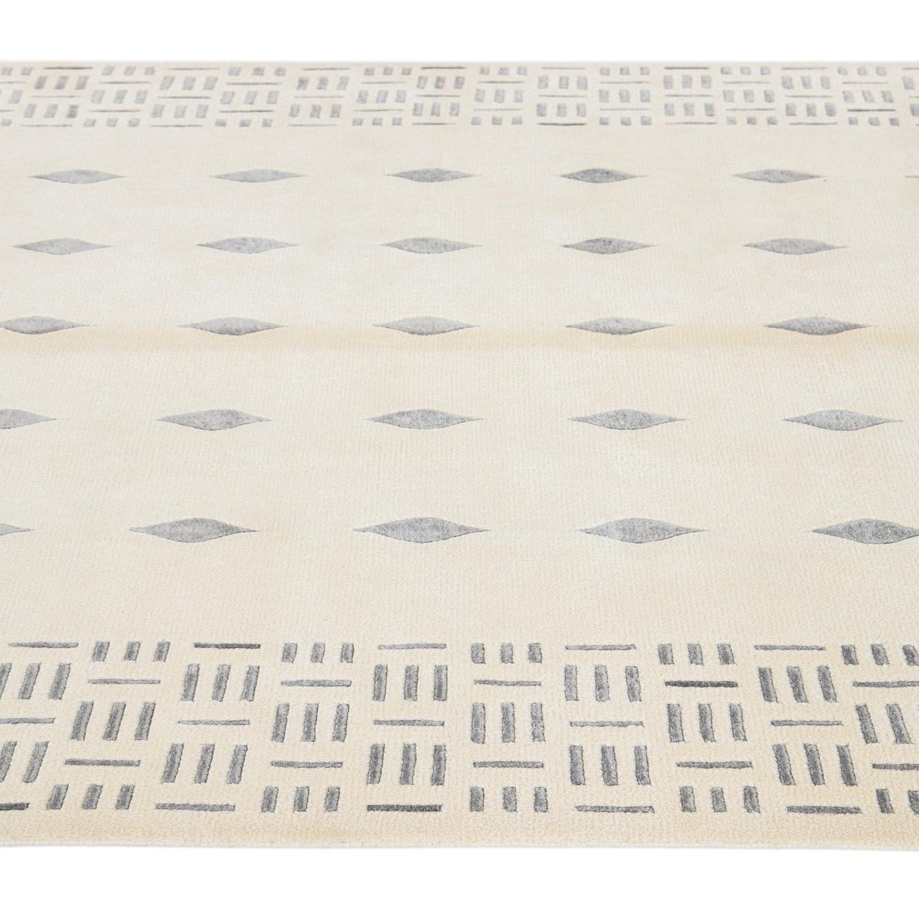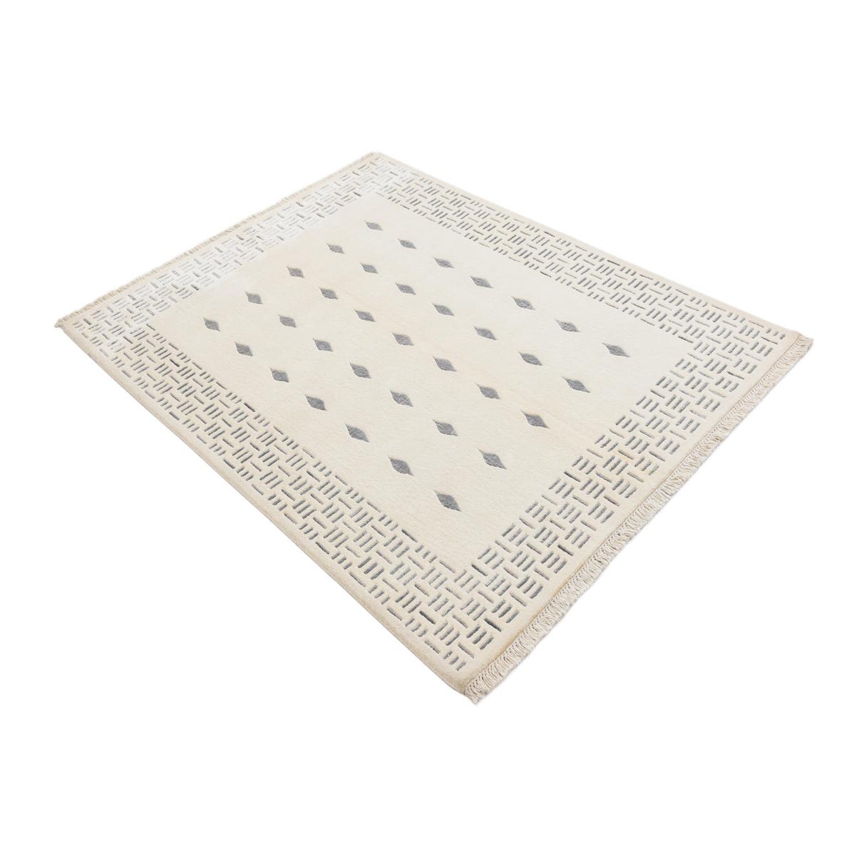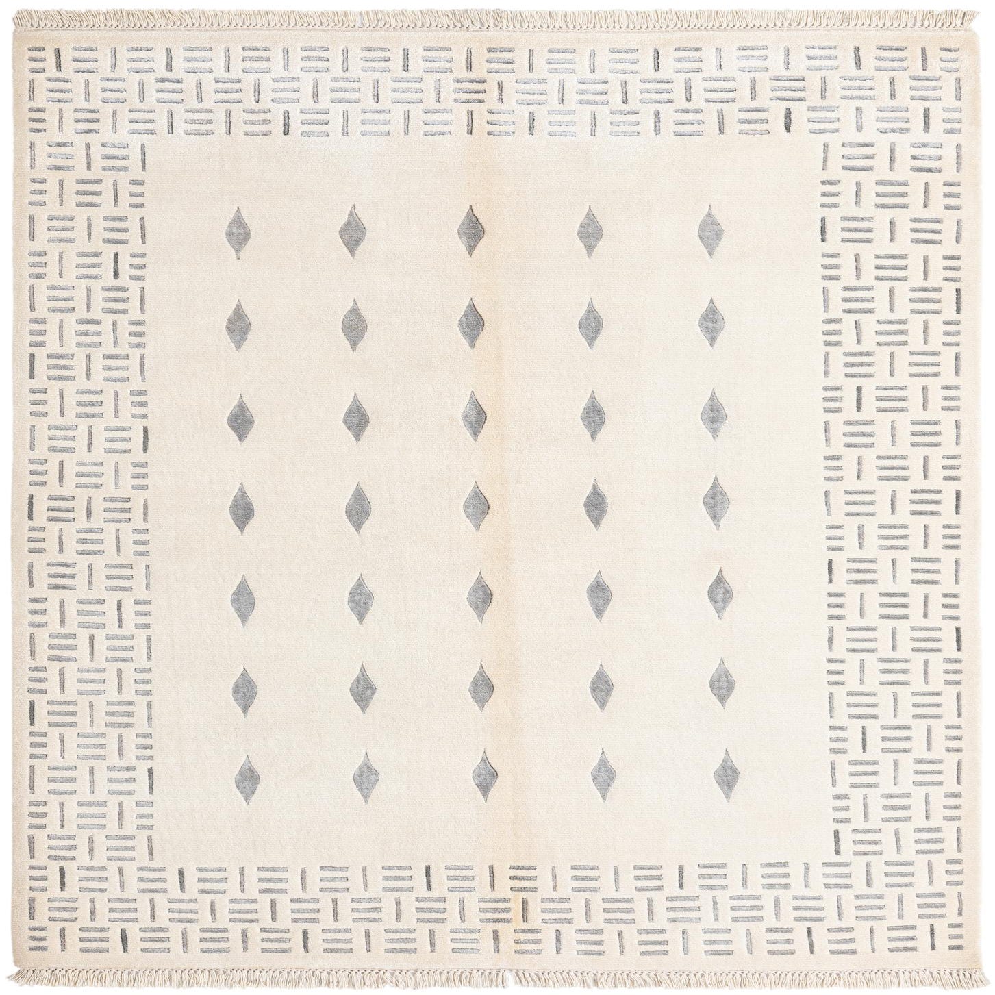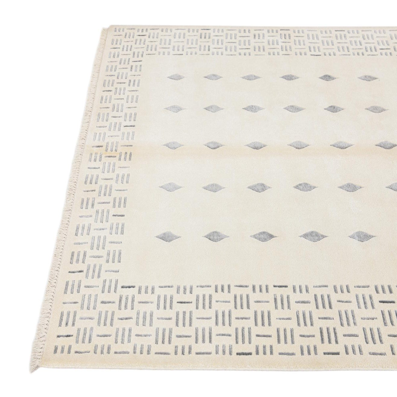 A 5x8 rectangular Darya rug with a cream field, gray diamond pattern, and gray geometric border.