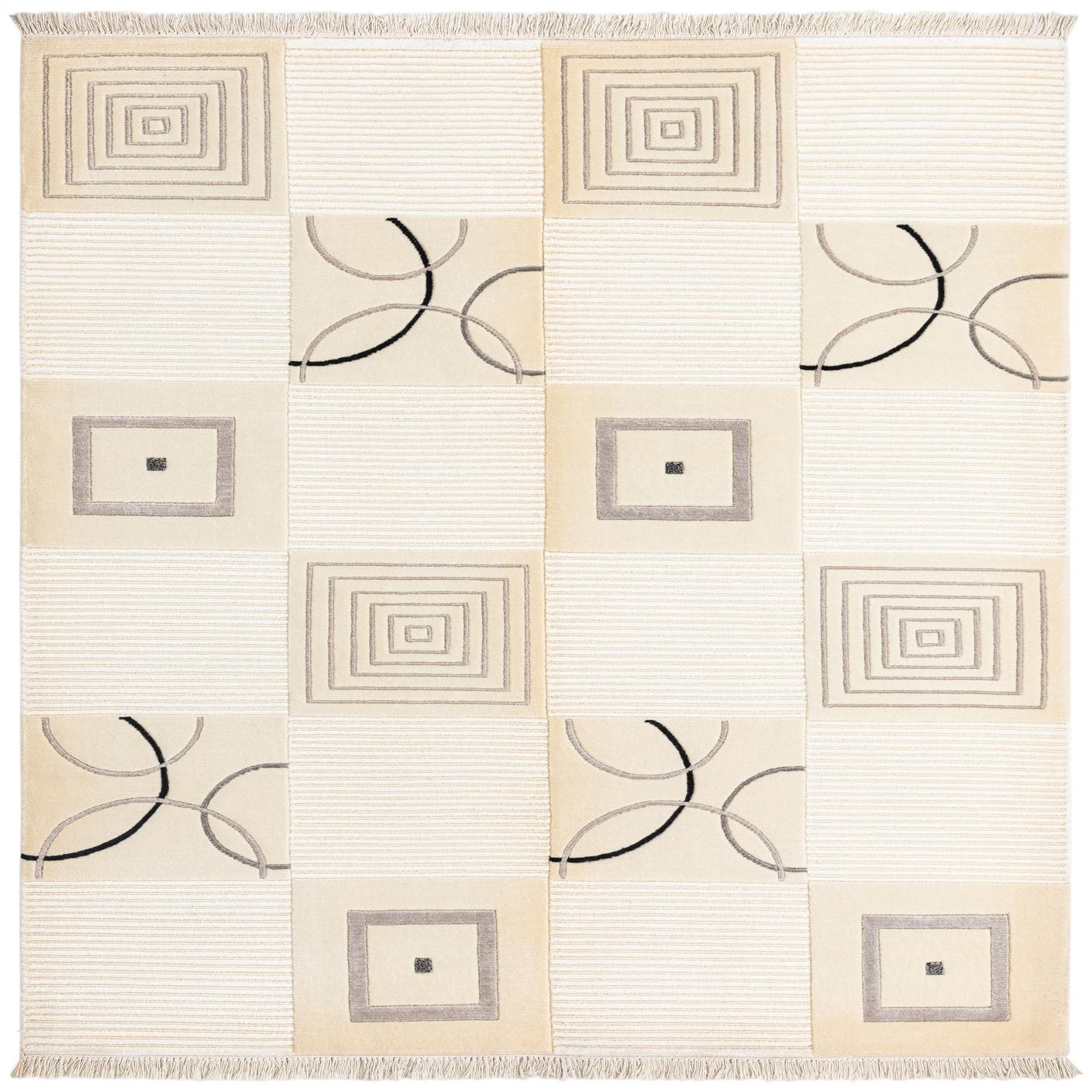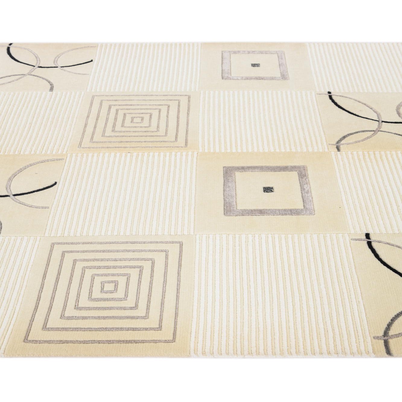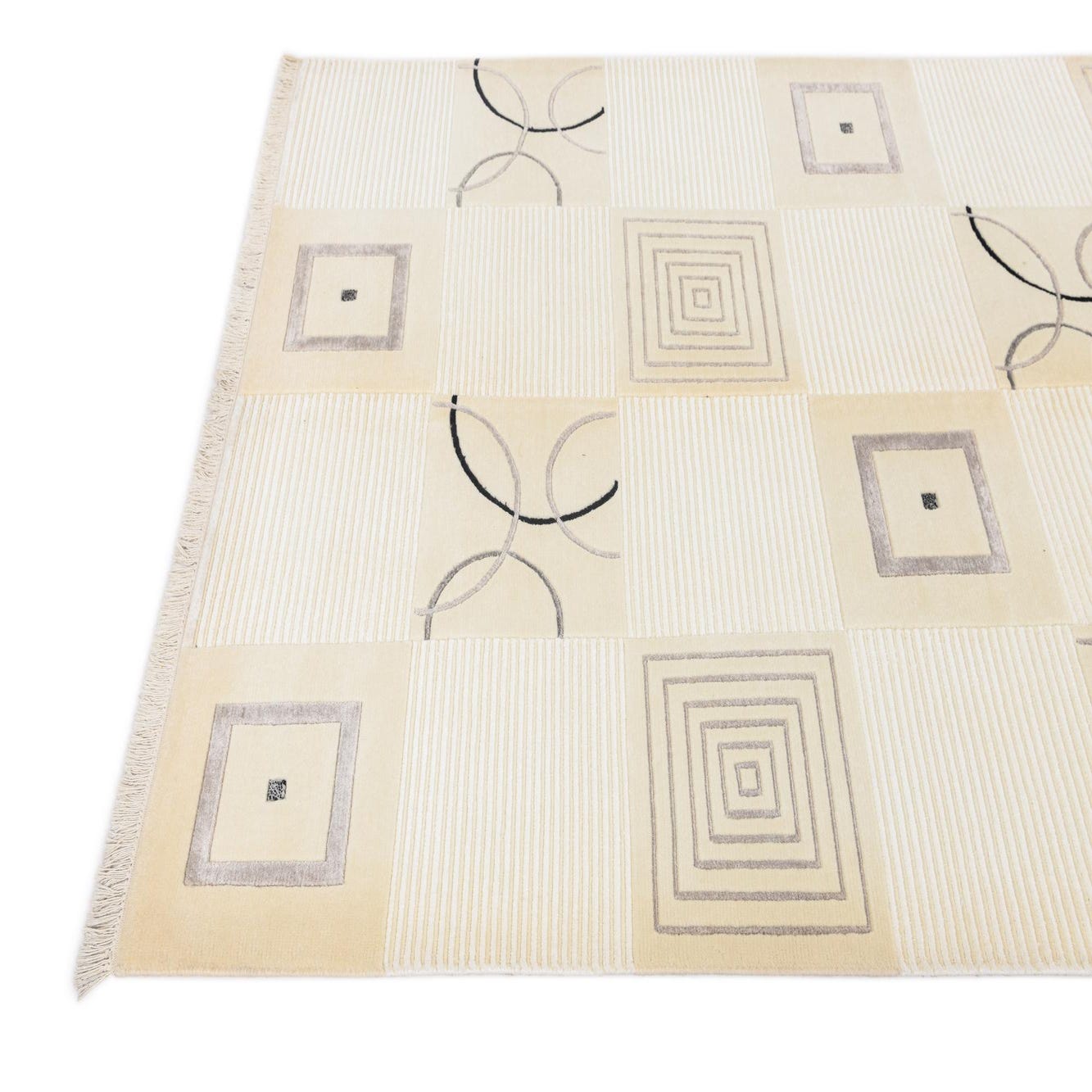Its balanced grid-like pattern features alternating squares, some with concentric square outlines and others with a more free-form circular motif, creating visual interest without overwhelming the space. The texture of this rug is crafted to provide a soft yet durable surface, reflecting the quality of its woolen fibers and hand-knotted construction.