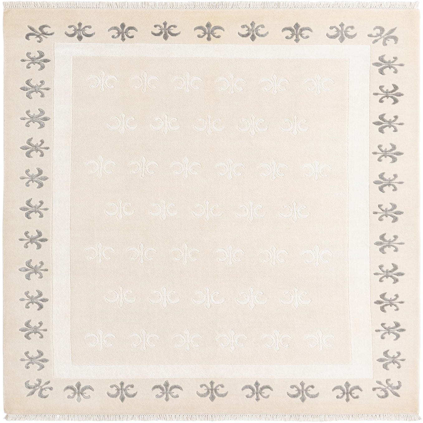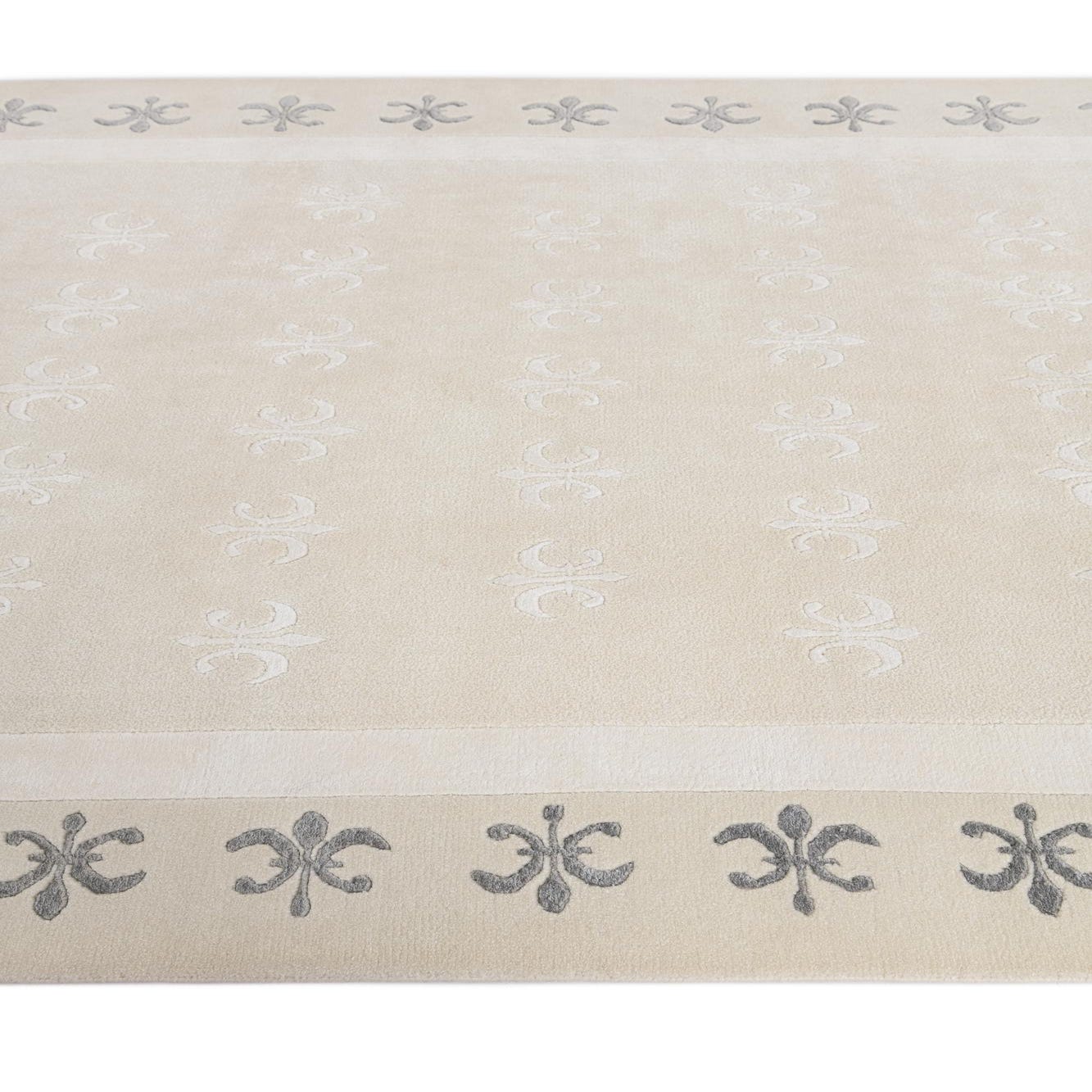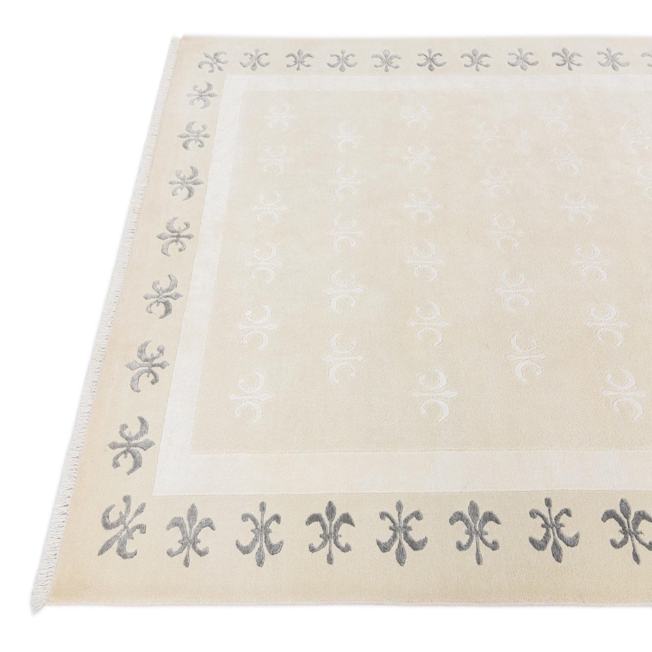 The Darya collection presents a 5x8 hand-knotted rug crafted from 100% wool, offering durability alongside a soft and inviting texture. This piece features a neutral beige background that serves as a versatile base for an array of interior design styles. Accentuating the beige are patterns and borders in a harmonious blend of gray, ivory, and silver hues. The design showcases an elegant border of stylized fleur-de-lis motifs framing a clean, open field. This subtle yet sophisticated pattern lends itself to a refined aesthetic.