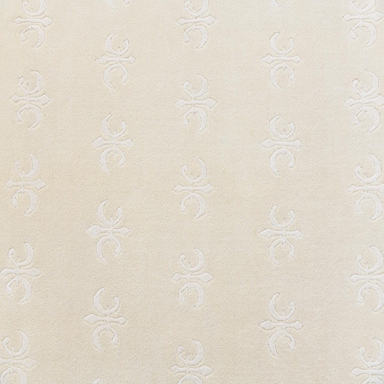 A 5x8 rectangular Darya rug in cream and tan wool, featuring a border of gray fleur-de-lis motifs and a field of lighter cream fleur-de-lis patterns.