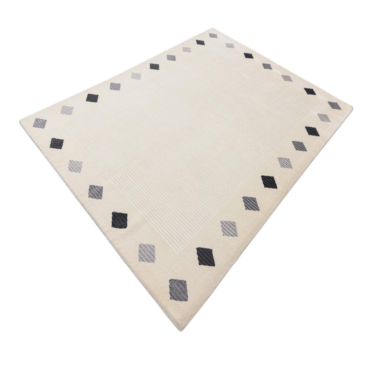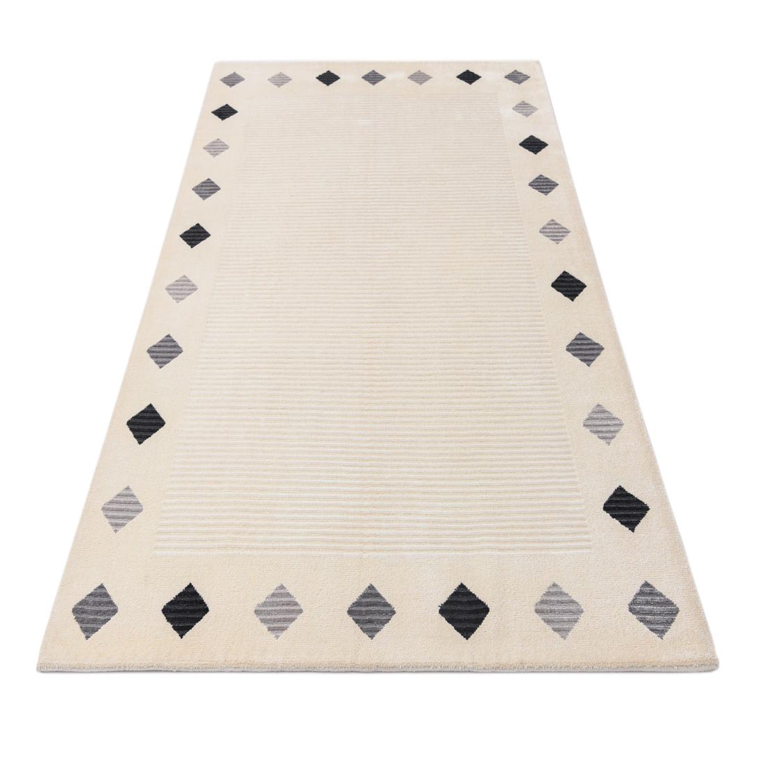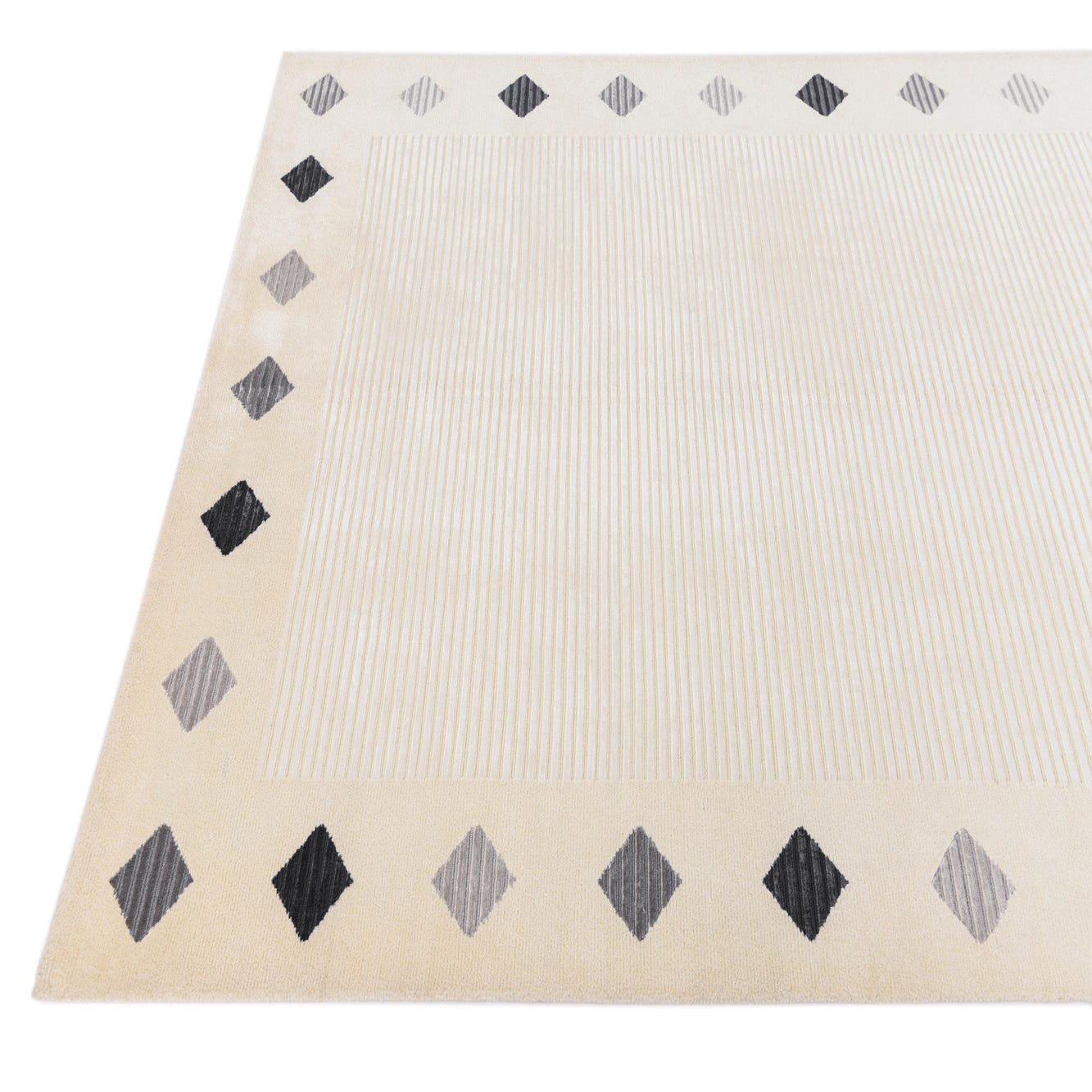 The Darya collection 5x8 rug is hand-knotted of 100% wool, offering durability and a plush texture underfoot. This piece features a versatile beige background complemented by an array of geometric accents in black, gray, and silver hues. The design showcases a central field with a striated pattern, adding depth and visual interest, framed by a border of diamond motifs.