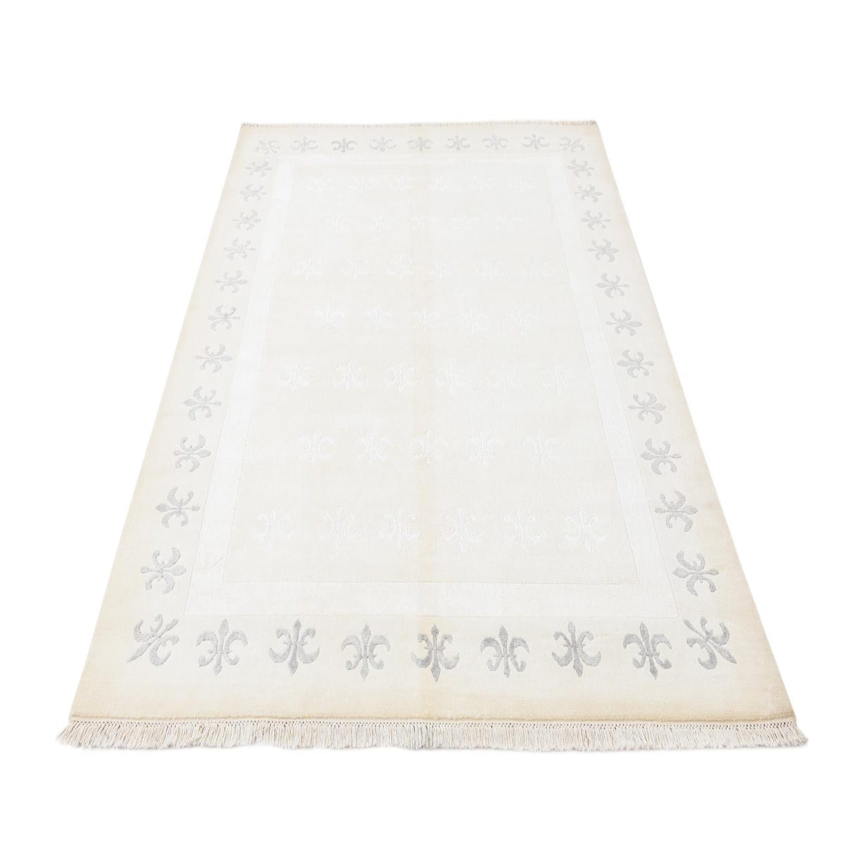 A 5x8 rectangular Darya Collection wool rug in cream and brown with a modern Oriental fleur-de-lis pattern.