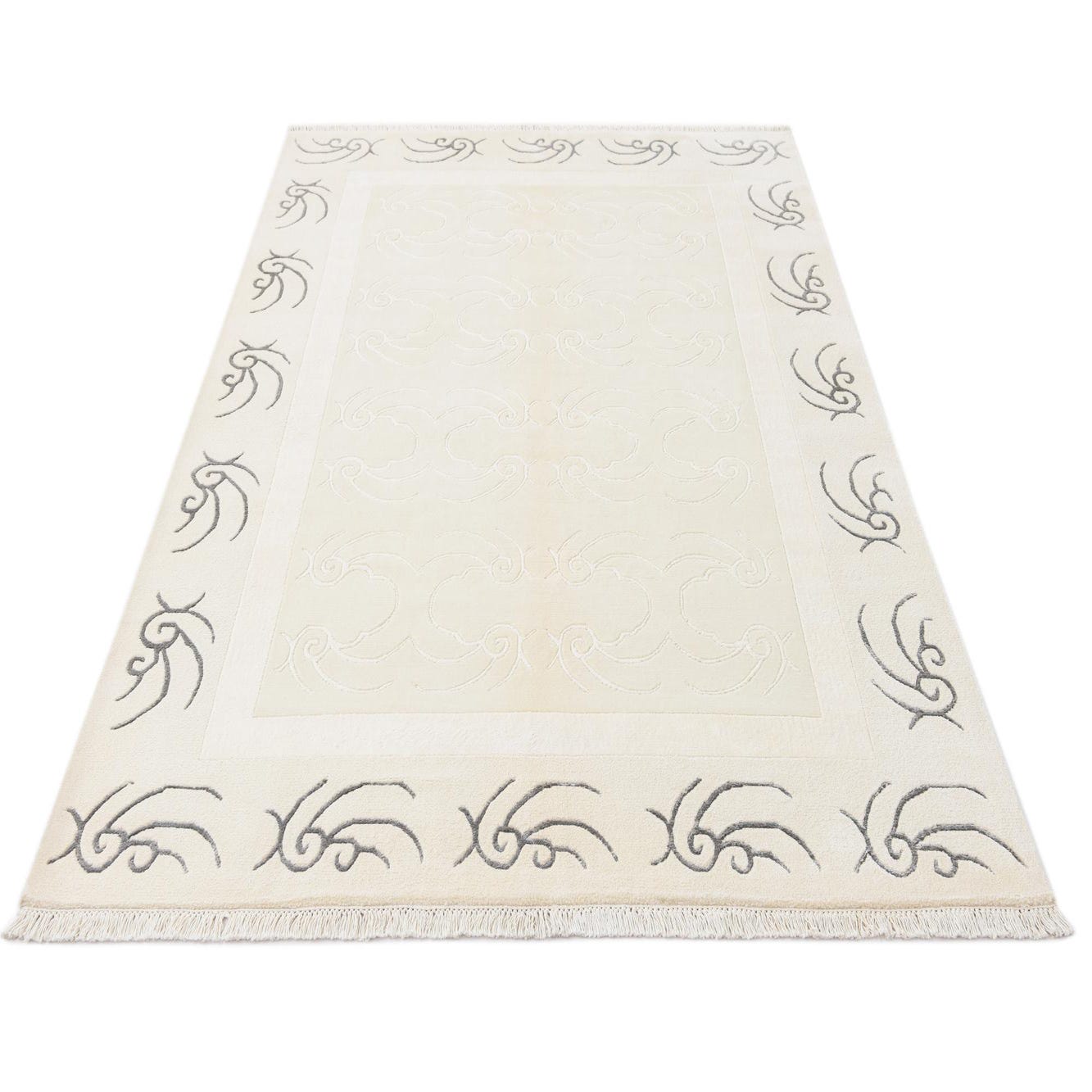 A 5x8 rectangular Darya rug with a cream field and subtle tan oriental pattern, framed by a border of grey scroll motifs.