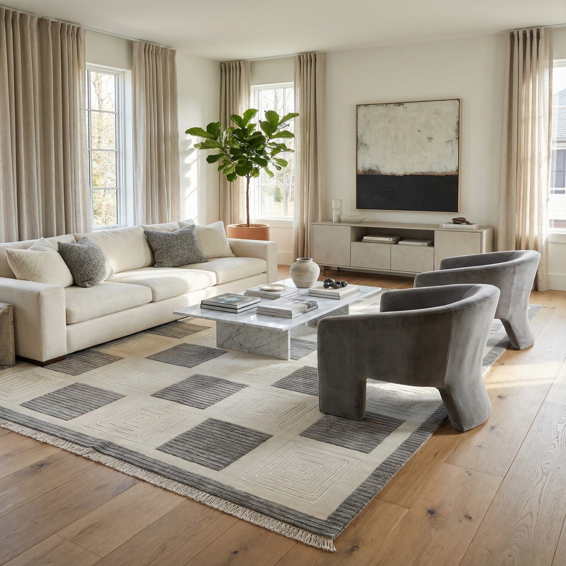 This rug's neutral color palette makes it an excellent choice for complementing a range of decors, from minimalist and modern to more traditional settings. It's well-suited for anchoring furniture in a living room, adding warmth to a bedroom, or providing a soft, luxurious surface underfoot in a study. The sophisticated pattern pairs well with both solid-colored and textured furnishings, allowing for a seamless integration into existing design schemes or acting as a foundation for a new aesthetic.