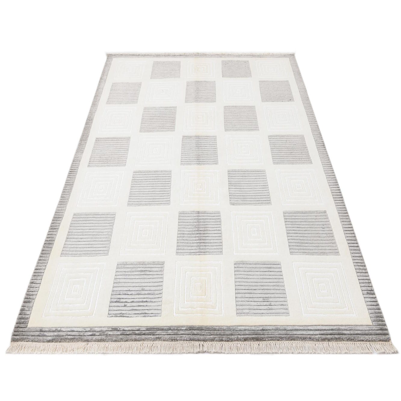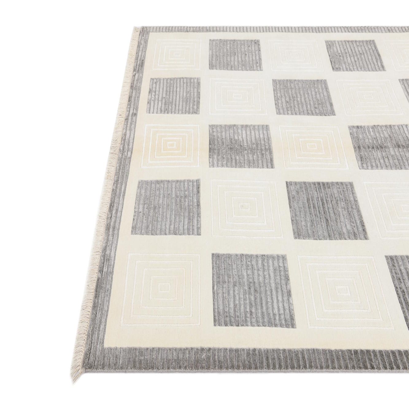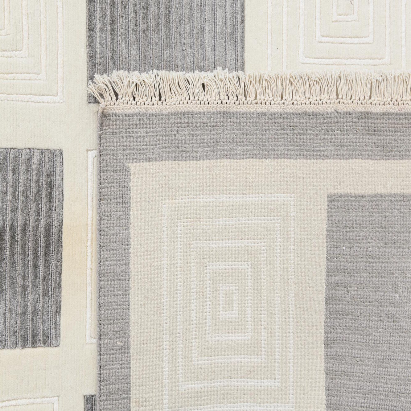The Darya Collection offers a hand-knotted rug crafted from 100% wool, featuring a modern geometric pattern that is both timeless and contemporary. The rug's design showcases a series of squares and concentric rectangles in a grid-like formation, giving it a structured and sophisticated appeal. Colors in this rug include a harmonious blend of beige, gray, and ivory, with beige being the dominant background shade. Fringe detailing adds a classic touch to the rug's edges, enhancing its artisanal quality.