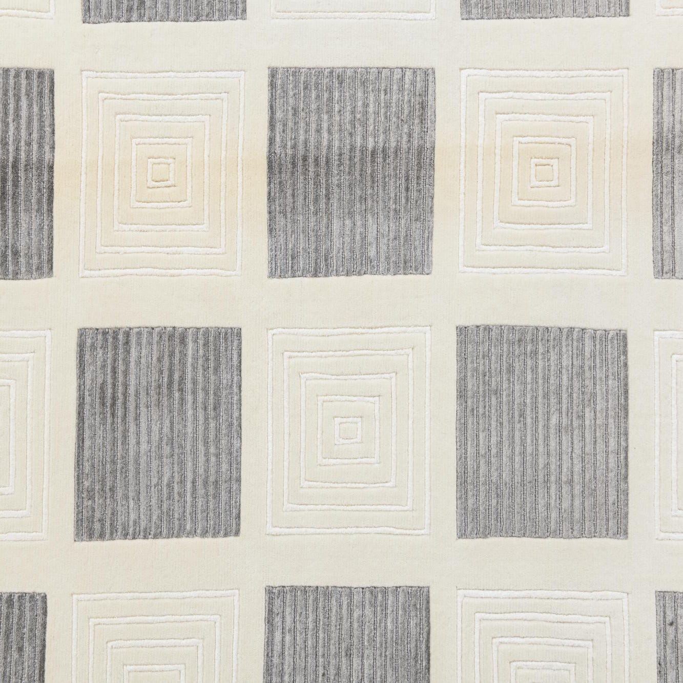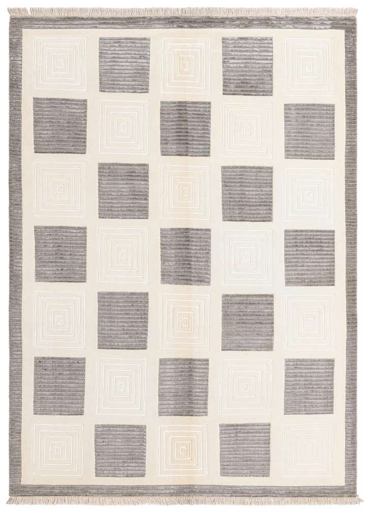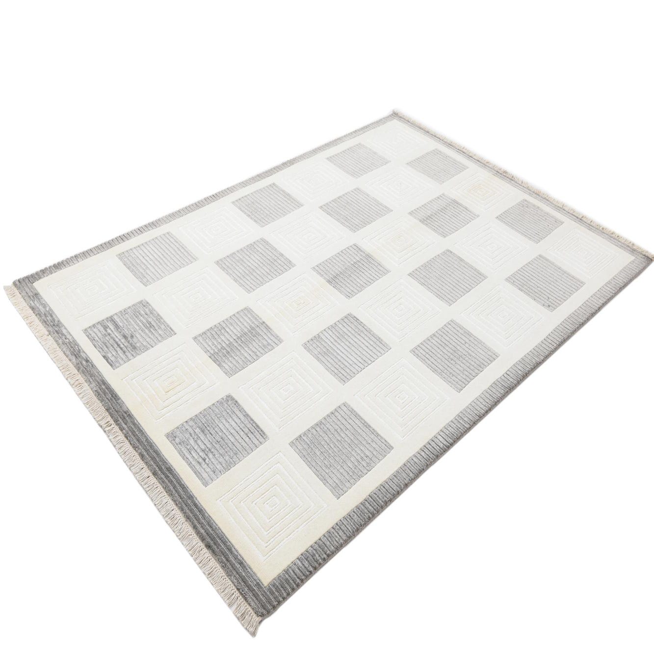 The Darya Collection offers a hand-knotted rug crafted from 100% wool, featuring a modern geometric pattern that is both timeless and contemporary. The rug's design showcases a series of squares and concentric rectangles in a grid-like formation, giving it a structured and sophisticated appeal. Colors in this rug include a harmonious blend of beige, gray, and ivory, with beige being the dominant background shade. Fringe detailing adds a classic touch to the rug's edges, enhancing its artisanal quality.