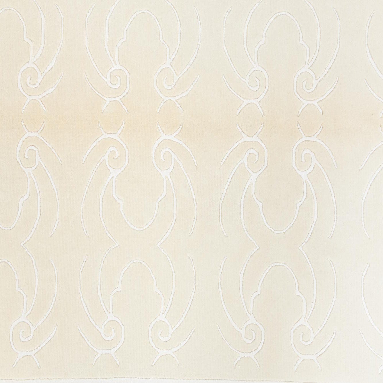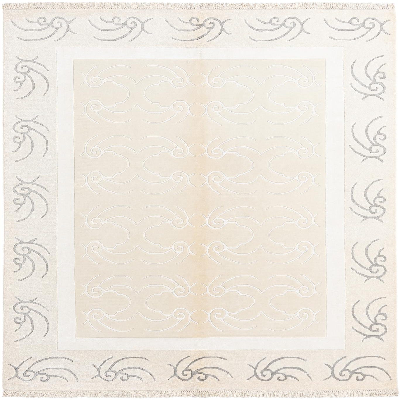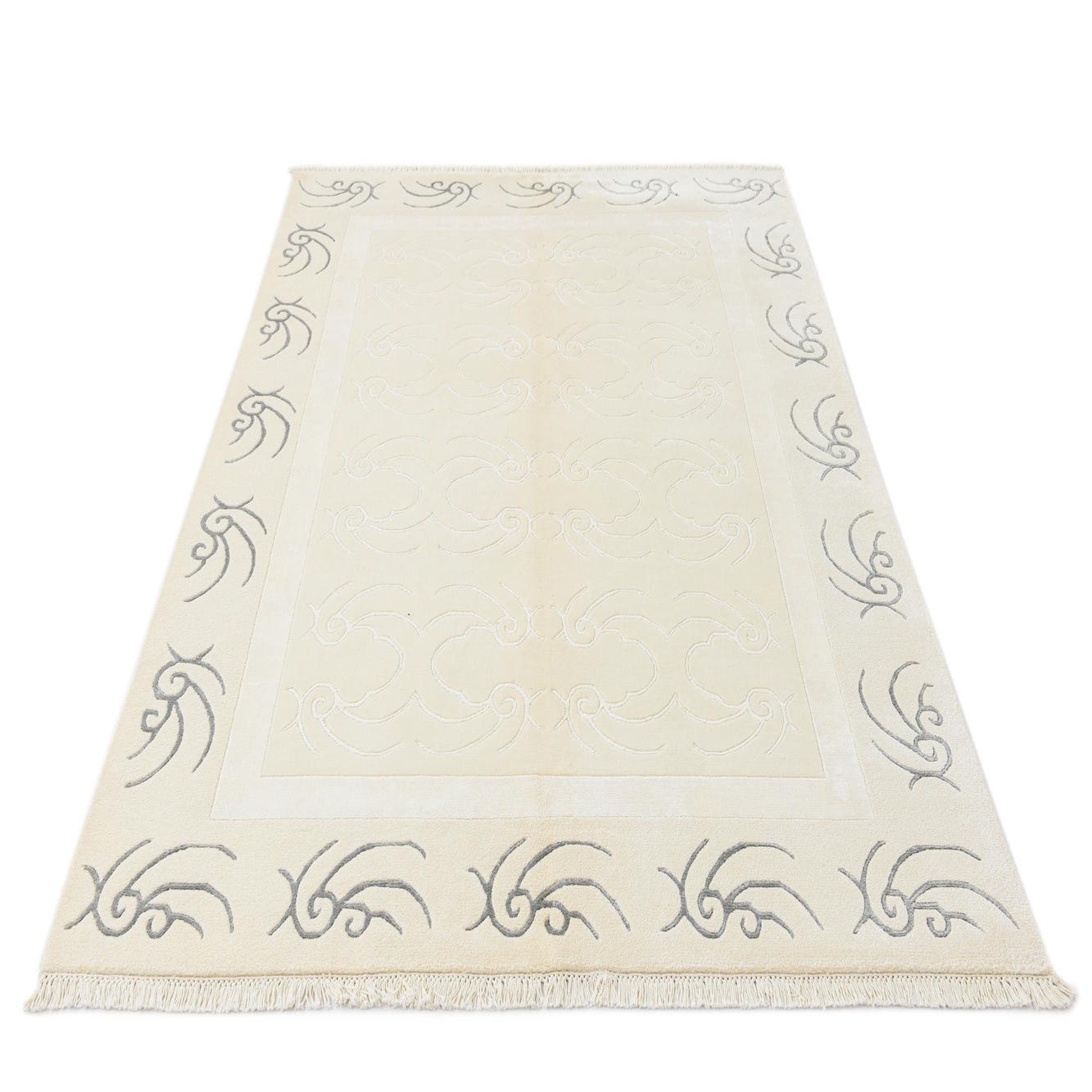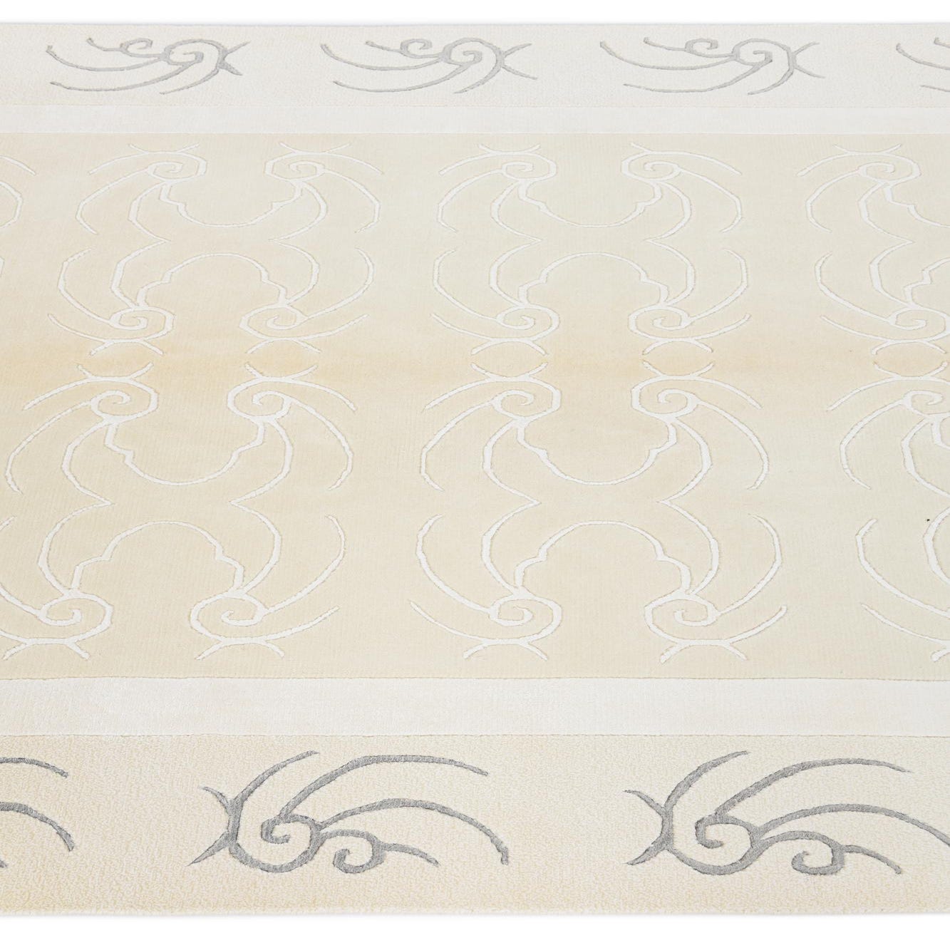 A 5x8 rectangular Darya rug in shades of cream and tan, featuring a modern oriental pattern with swirling motifs, suitable for a living room.