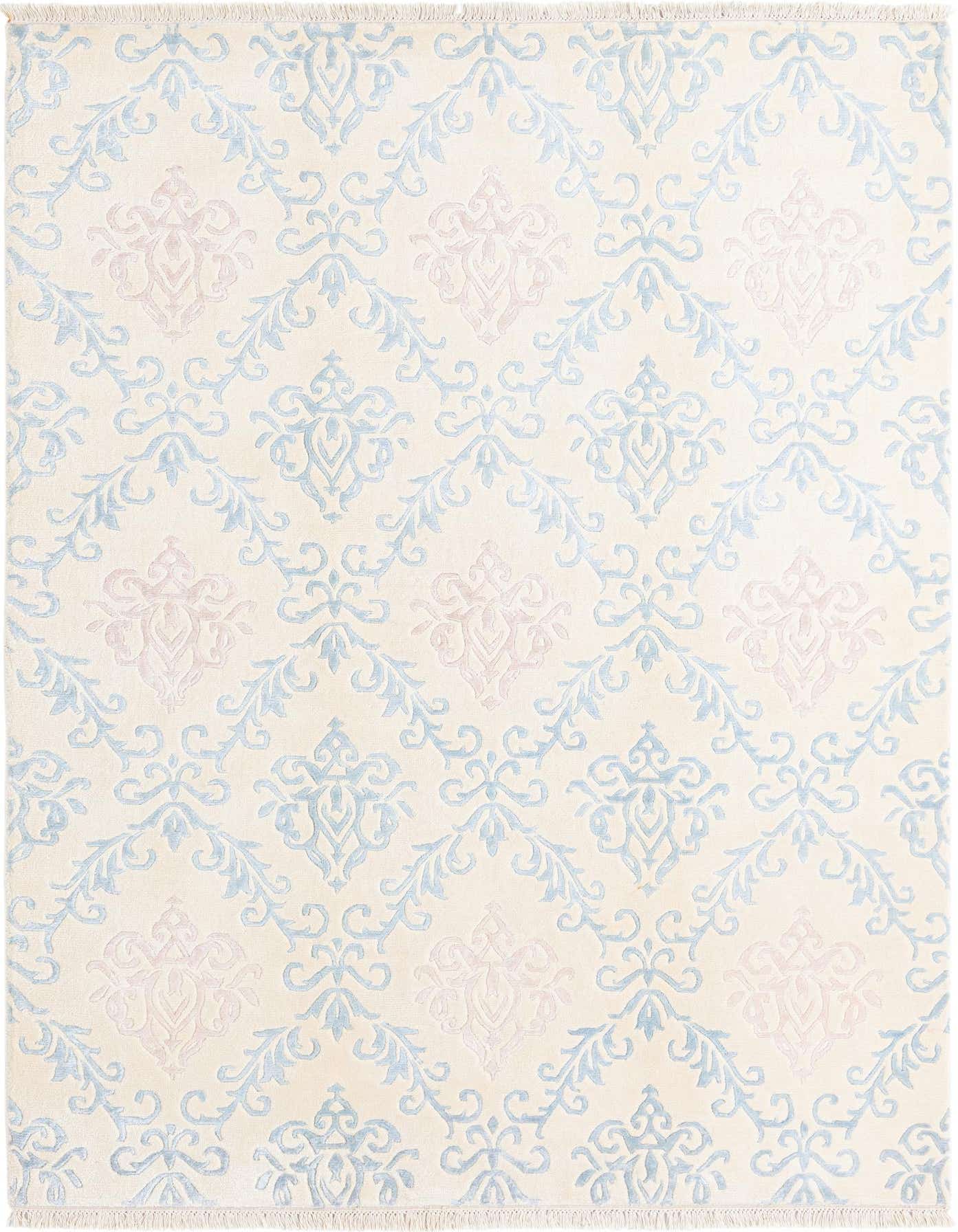 A 5x8 rectangular Darya rug with a cream background and a modern oriental pattern in light blue and blush pink.