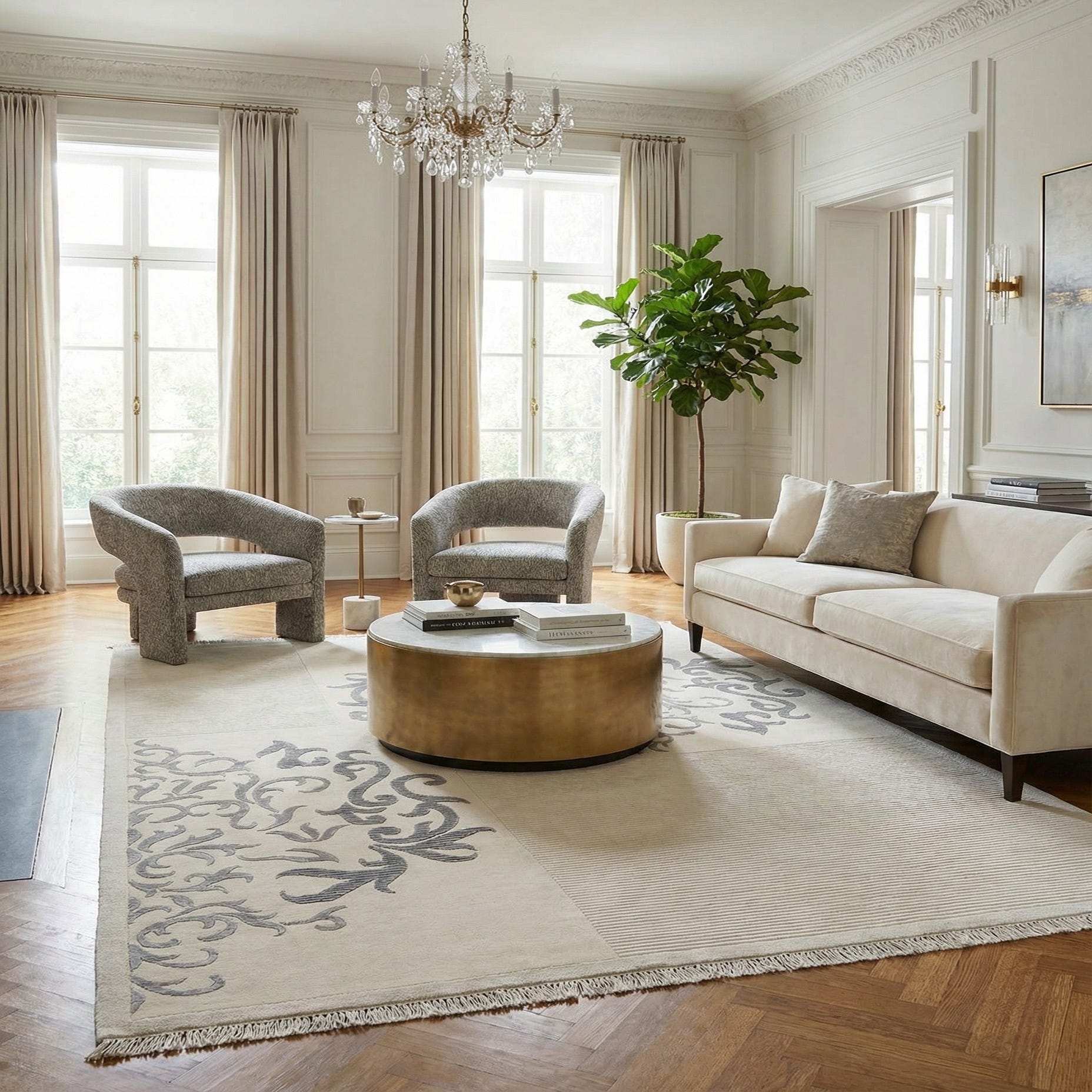 The pattern, reminiscent of classic damask, features elegant scrollwork and floral elements, lending a timeless charm to the piece. The neutral color palette ensures versatility, making this rug suitable for a range of interior design scenarios. From modern to traditional, the subtle sophistication of this rug would seamlessly integrate with minimalist decors, serve as a balanced foundation in Scandinavian-inspired spaces, or add a soft, decorative touch to a formal living room or dining area. Its hand-knotted construction promises a unique piece with character, poised to anchor a room with understated elegance.