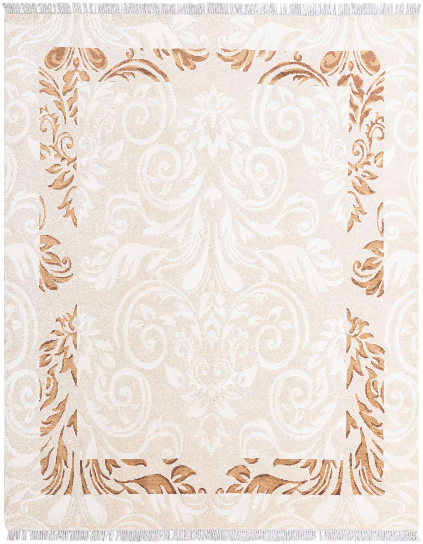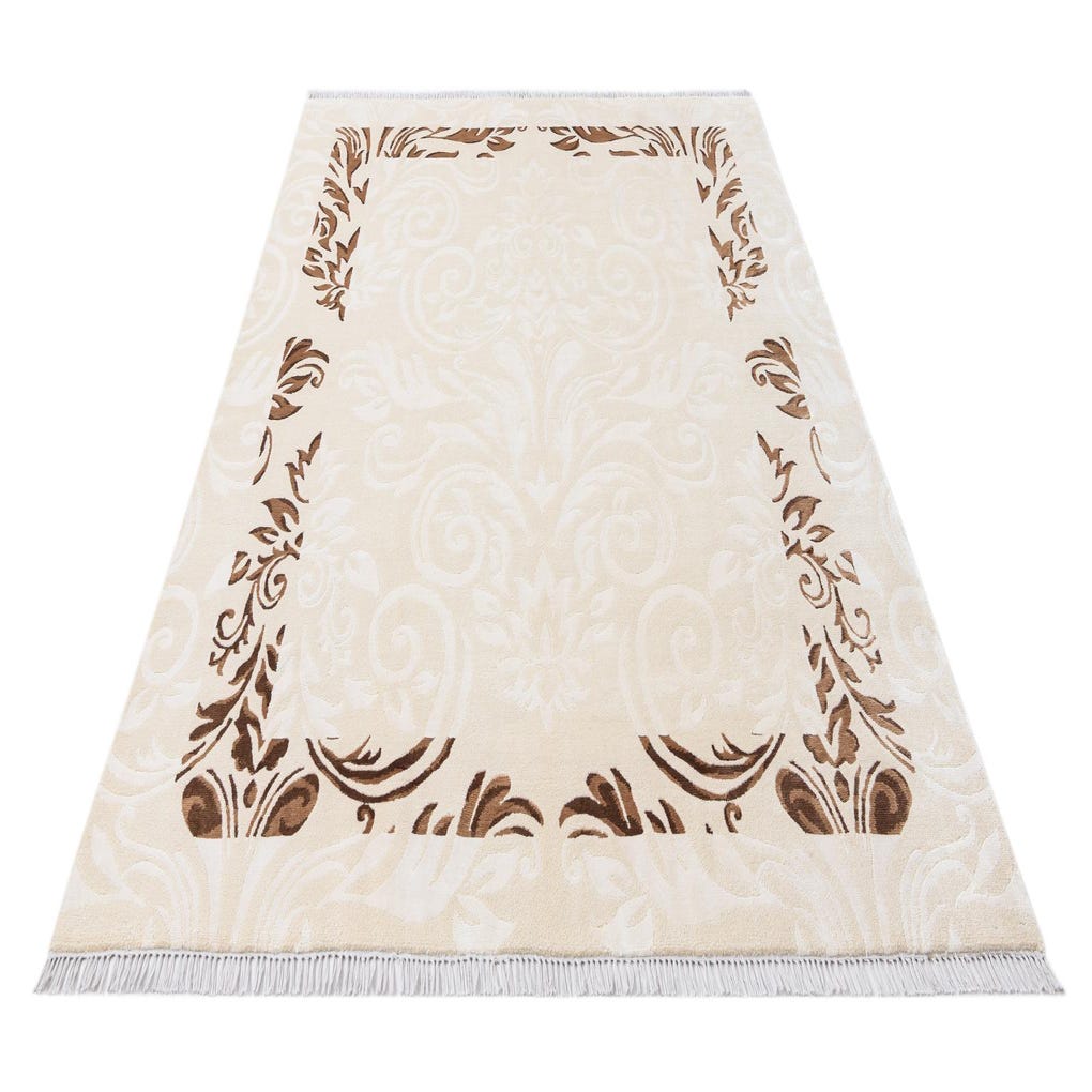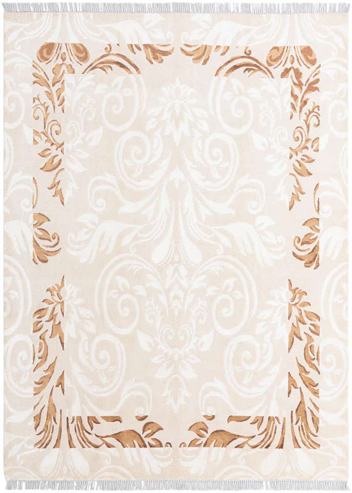 A 5x8 rectangular Darya rug with a modern pattern featuring brown and ivory floral motifs on a tan background.