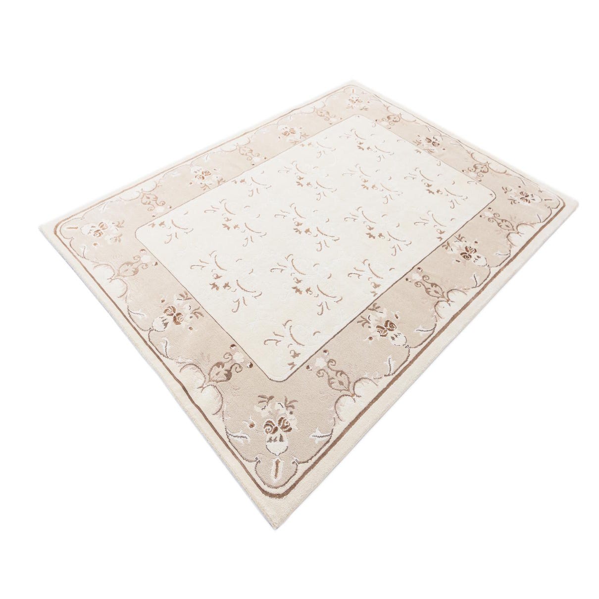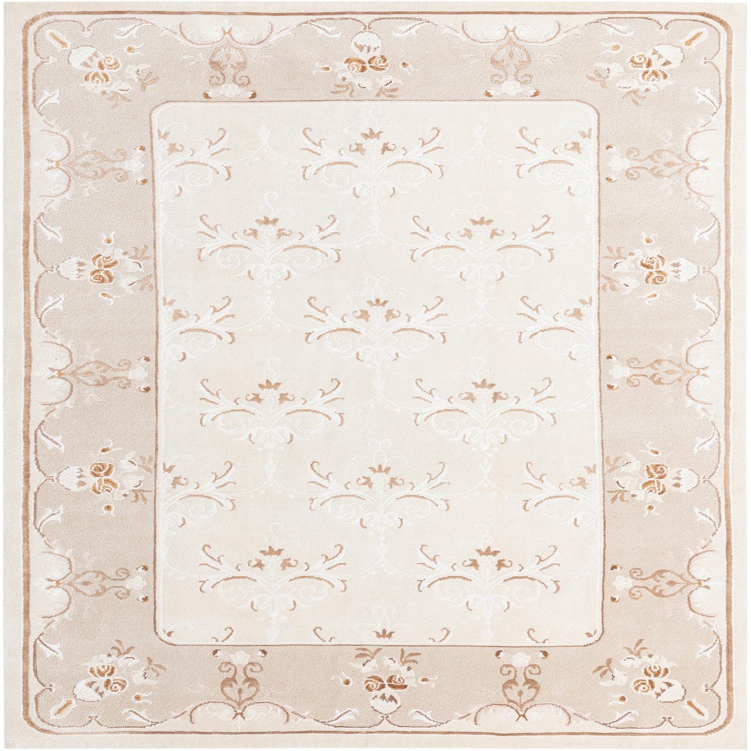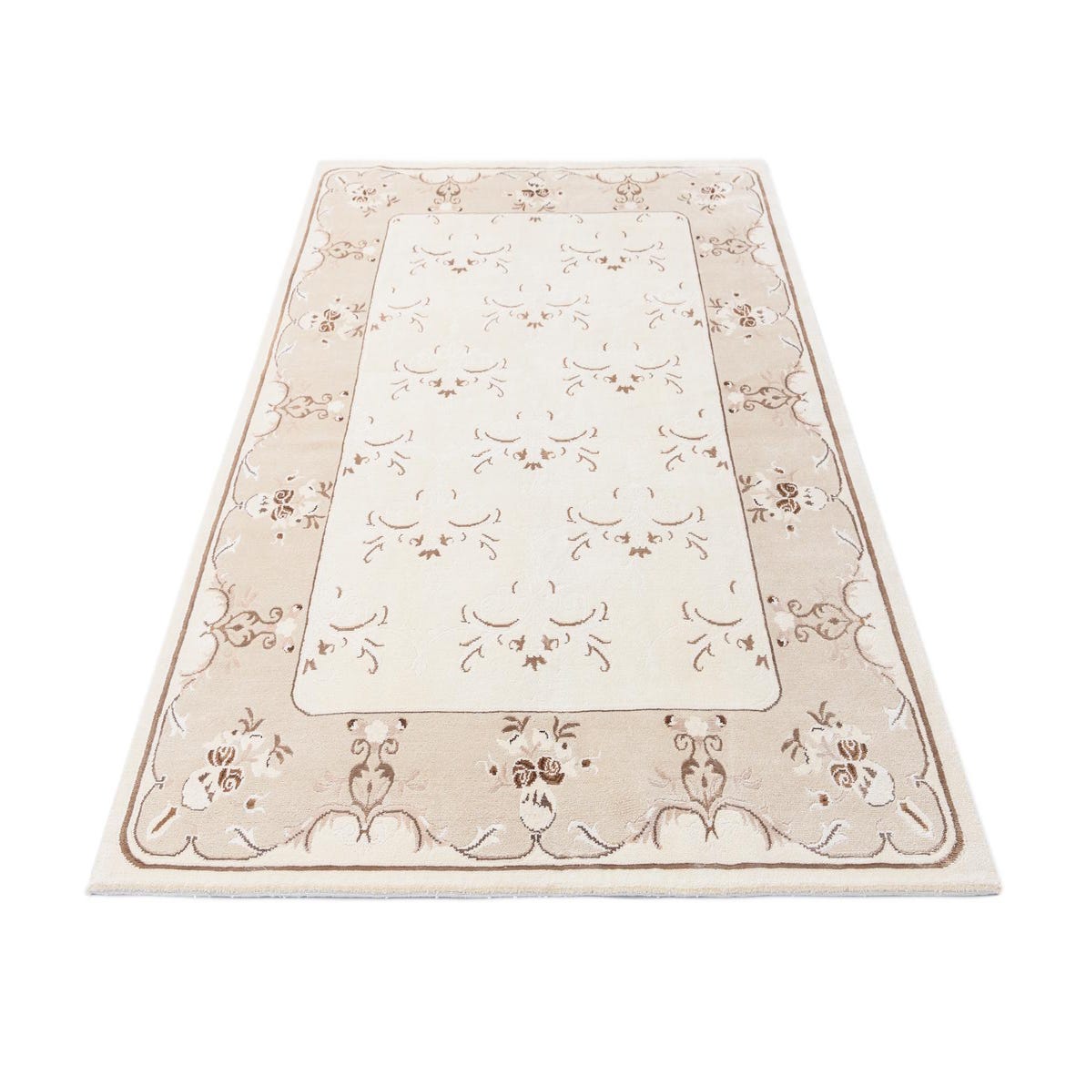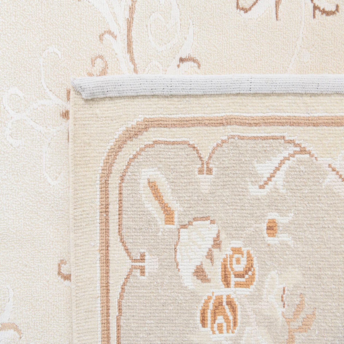 The Darya Collection presents a hand-knotted rug crafted from 100% wool, measuring 5x8 feet, and showcases a classic design that harmoniously blends into a range of interiors. The rug features an ornate pattern with subtle floral motifs, creating an elegant and timeless aesthetic. Colors present in the rug include a neutral beige background, complemented by accents of brown, ivory, and light brown which add depth and intricate detail to the design.
