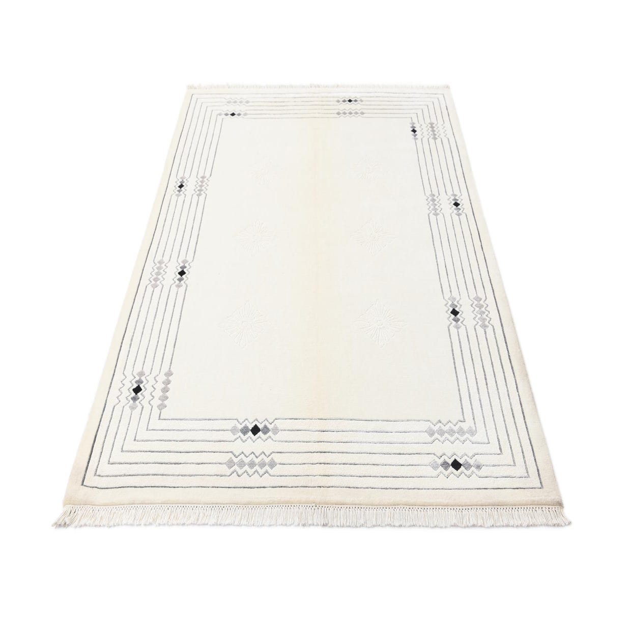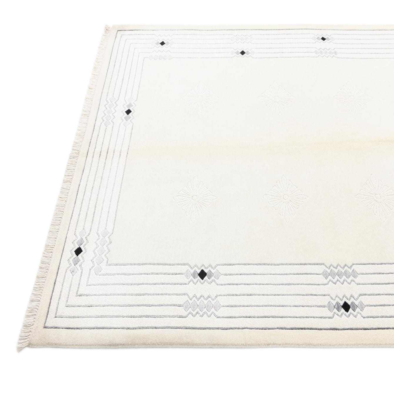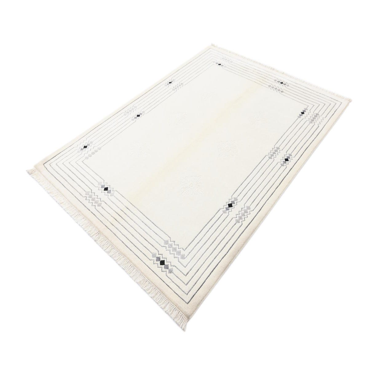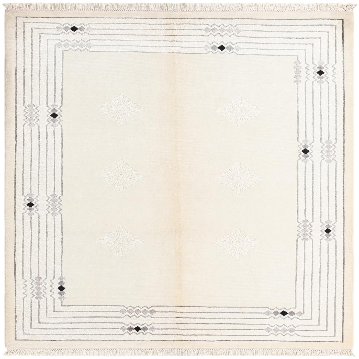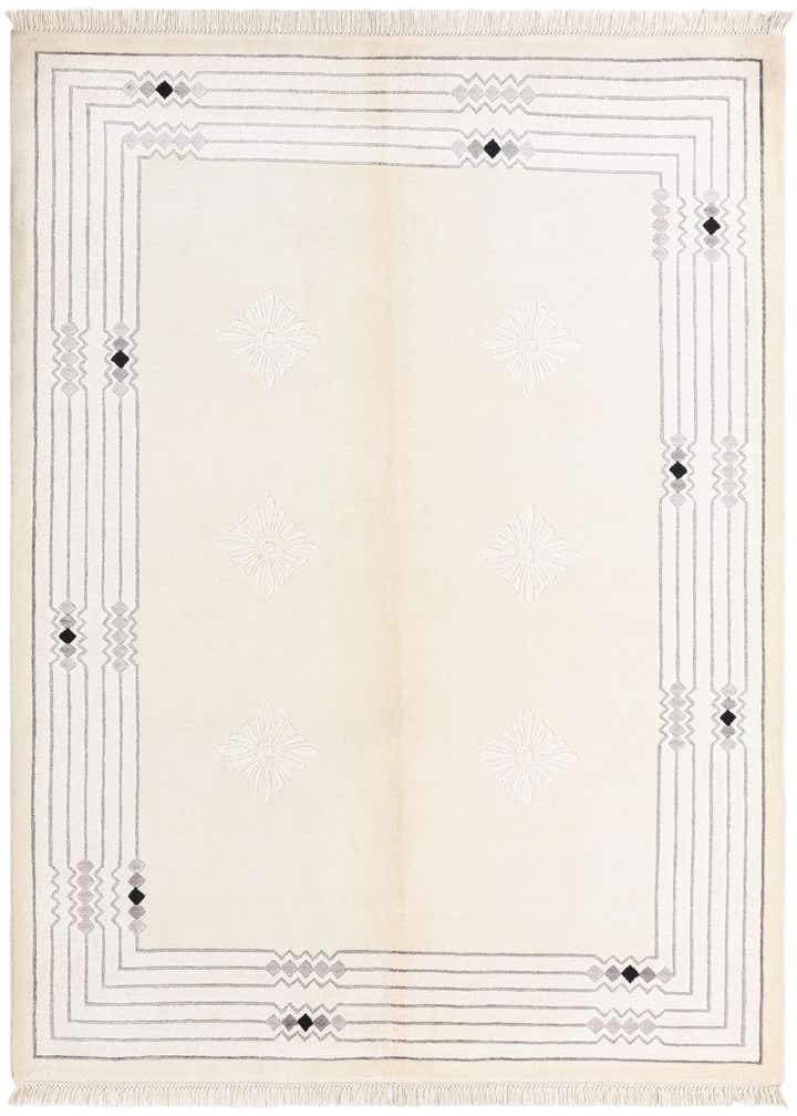 A 5x8 rectangular Darya rug with a cream field, light brown undertones, and a modern geometric border in gray and black, featuring subtle floral patterns.